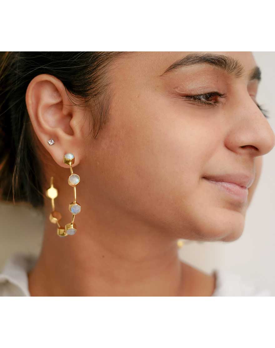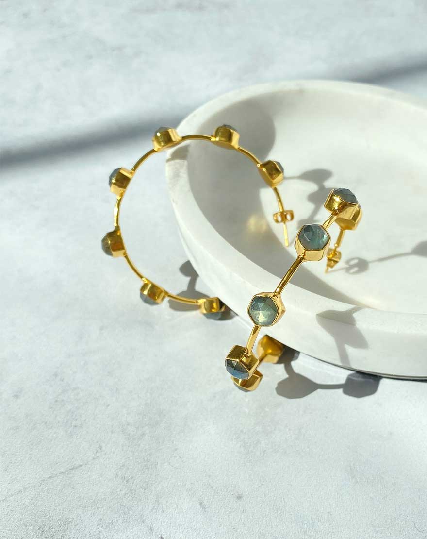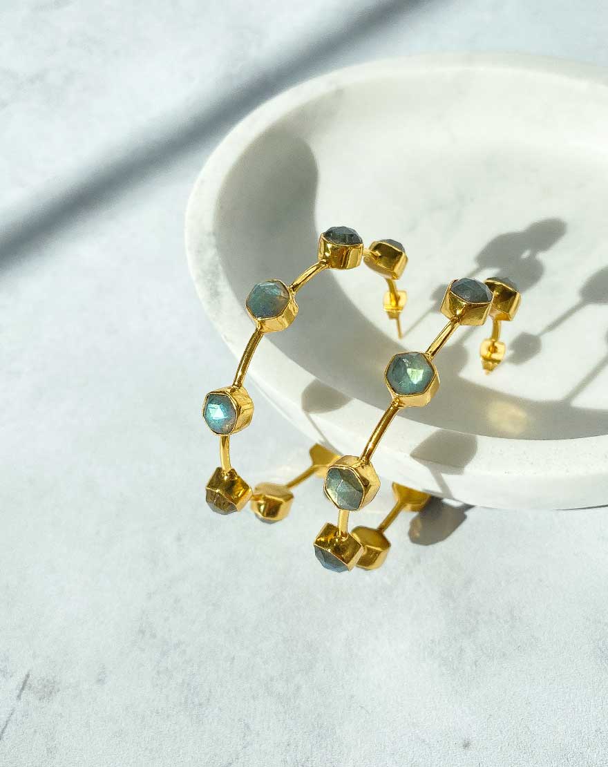 Gemma Hoops – These beautiful handmade hoop earrings are made using Labradorite on 1 micron gold plated brass. Perfect statement making hoops for stone lovers.