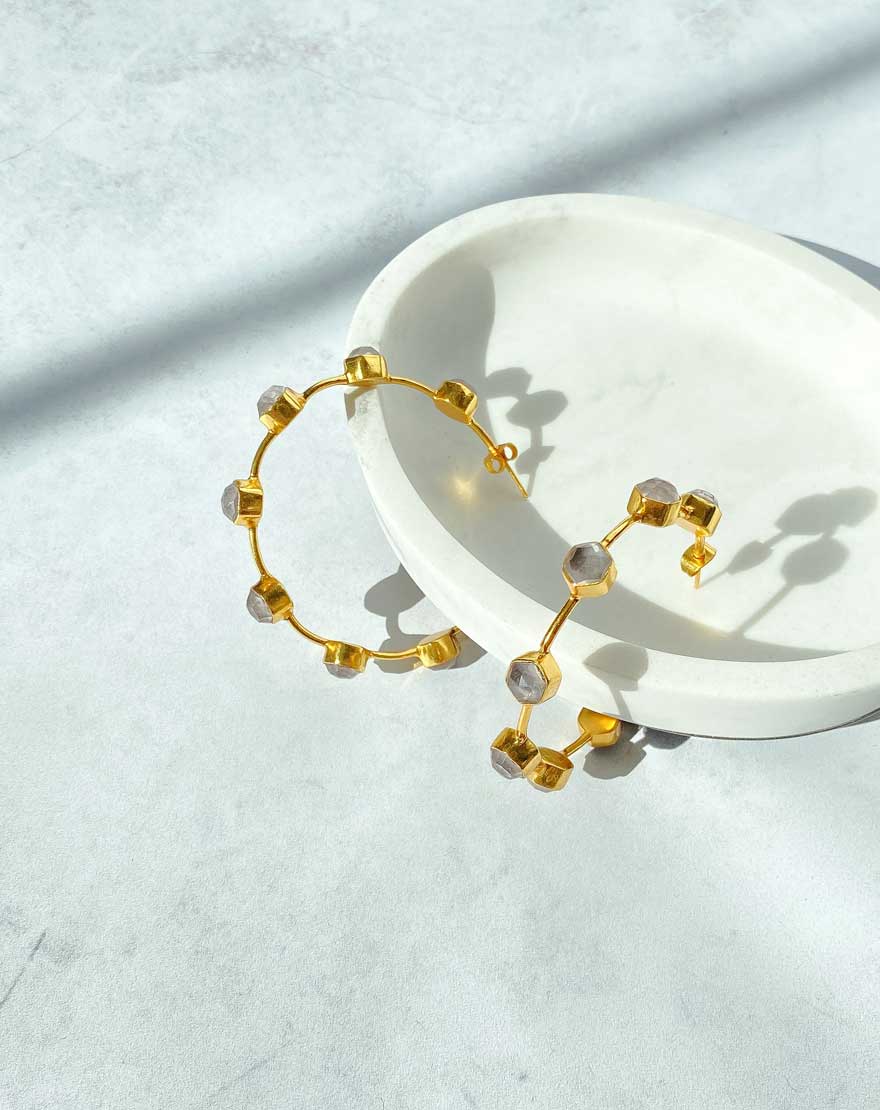 Gemma Hoops – These beautiful handmade hoop earrings are made using Rose Quartz on 1 micron gold plated brass. Perfect statement making hoops for stone lovers.