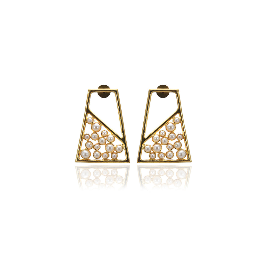Golden Pearl Studs – Trapezium – Handcrafted statement making studs made using pearls on 1 micron gold plated brass. Perfect for brunch wear or a night out look. Feather light statement earrings!