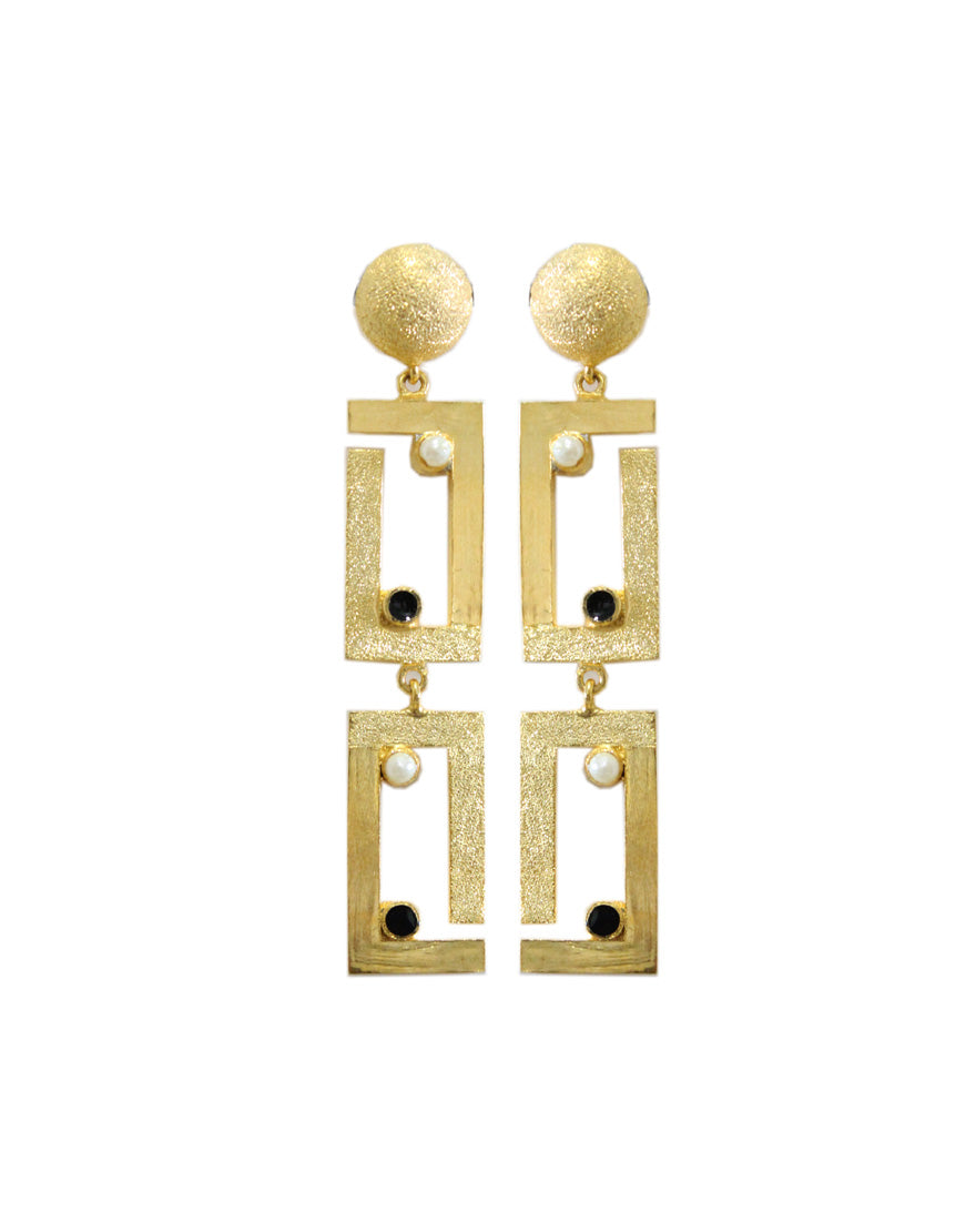 Golden Tetris Danglers : Inspired from sleek geometry, handcrafted using finest pearls and good quality gold plated brass with black enamel to make it look more minimal.
