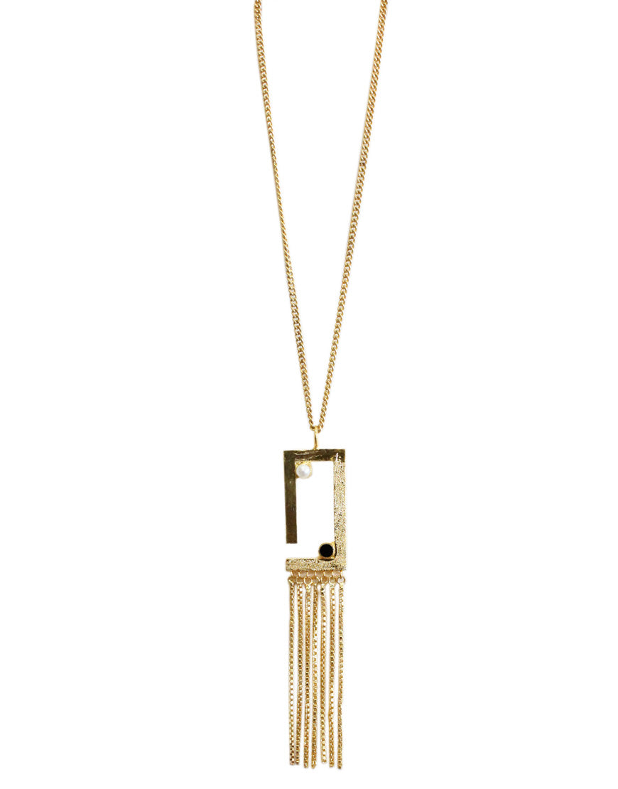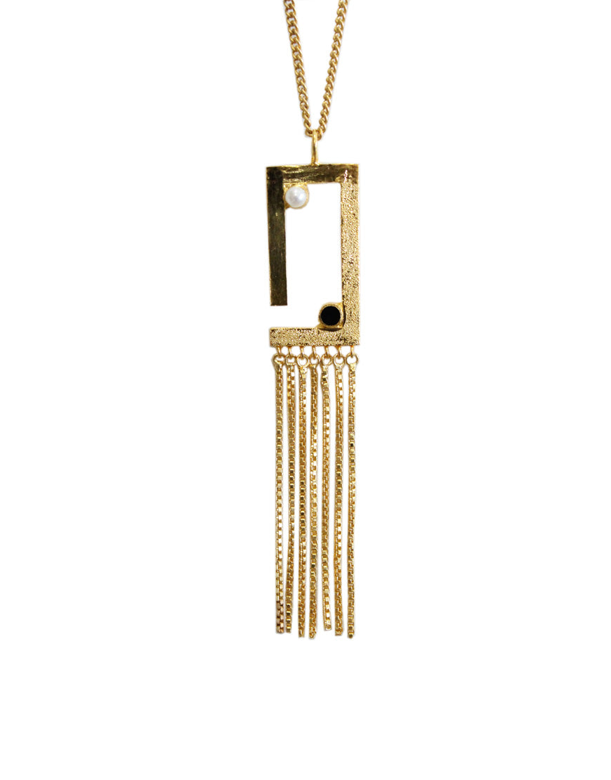 Golden Tetris Necklace : Inspired from sleek geometry, handcrafted using finest pearls and good quality gold plated brass with black enamel to make it look more minimal, with 20 inches gold plated chain provided.