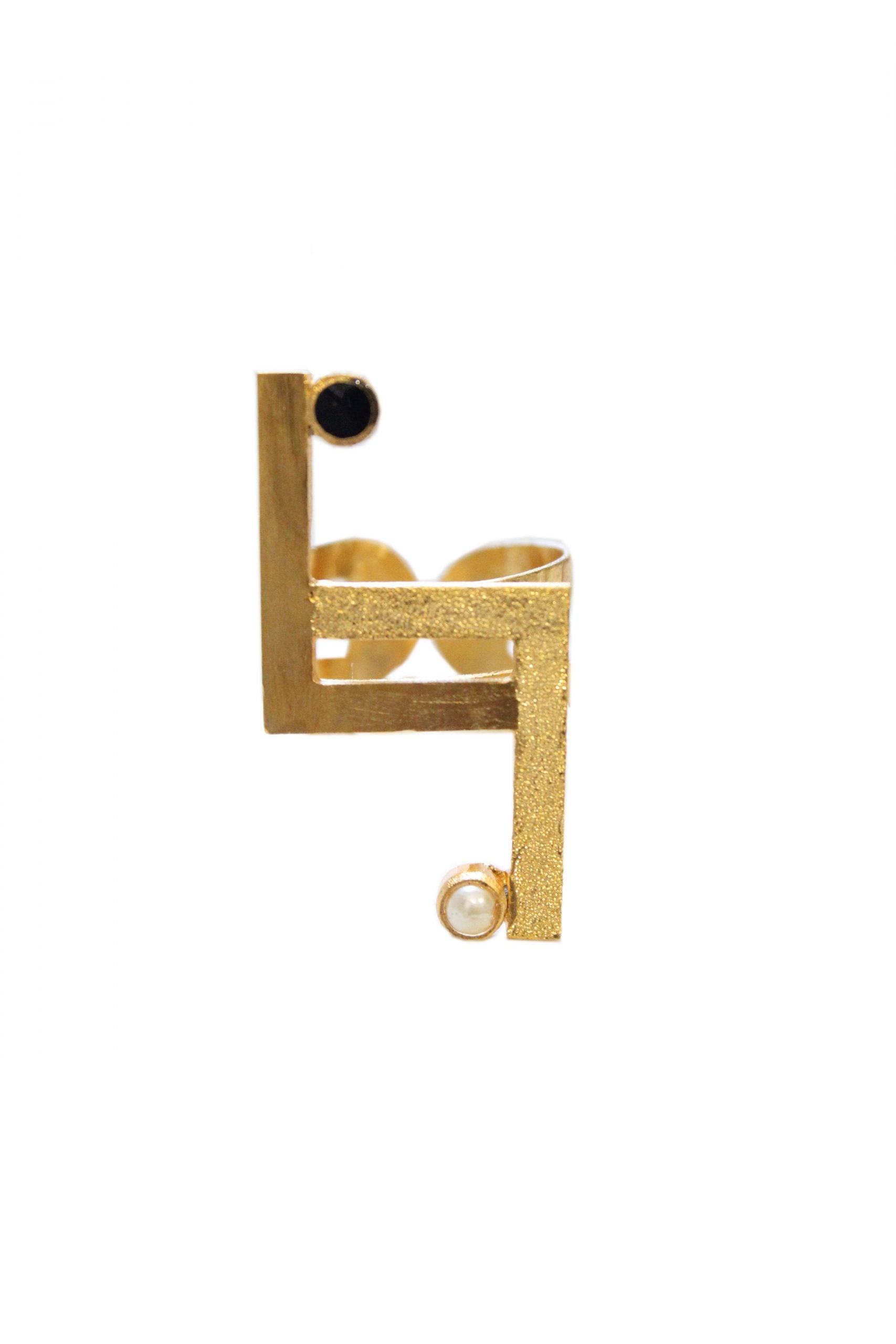 Golden Tetris Ring (Vertical) : Inspired from sleek geometry, handcrafted using finest pearls and good quality gold plated brass with black enamel to make it look more minimal.