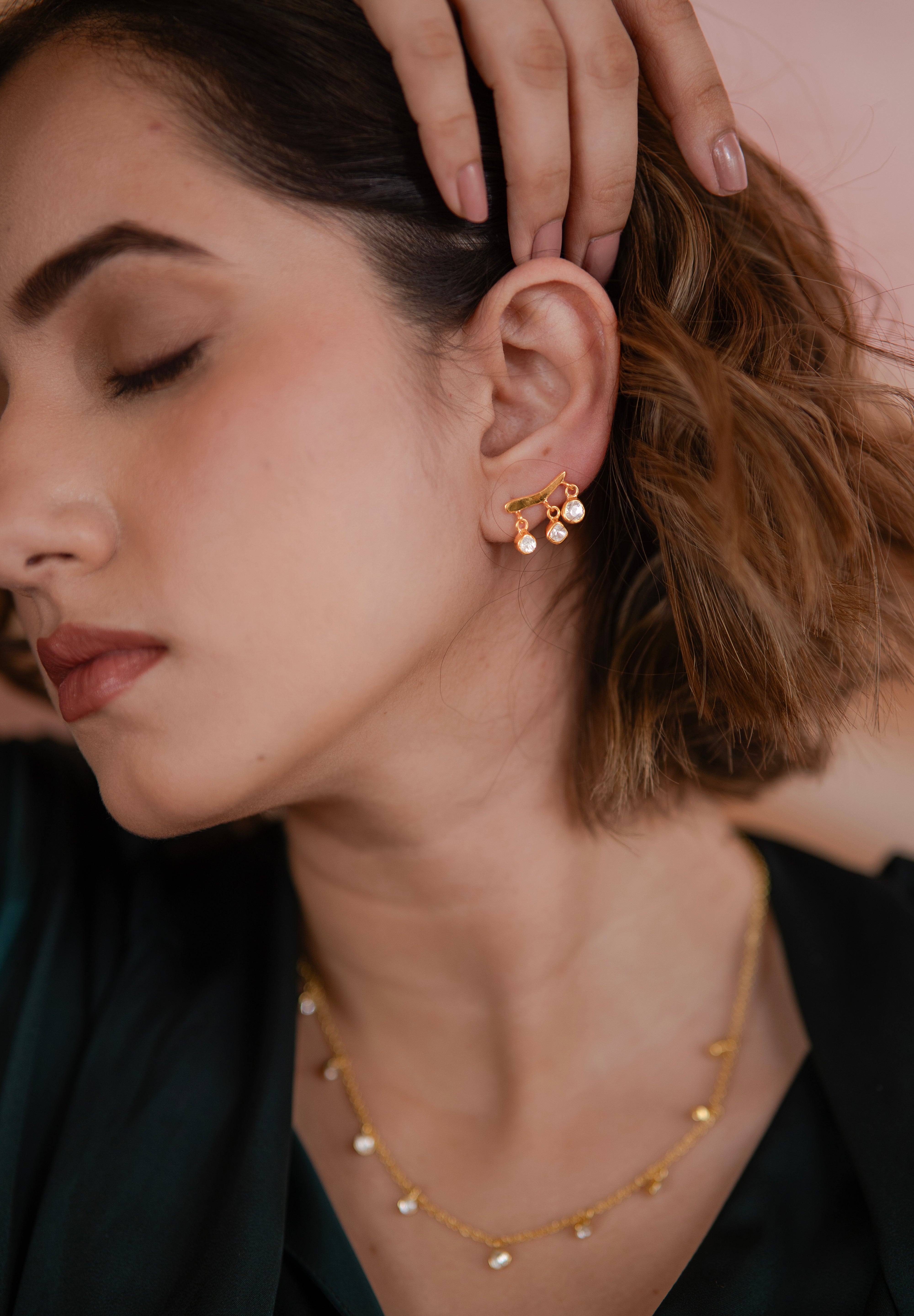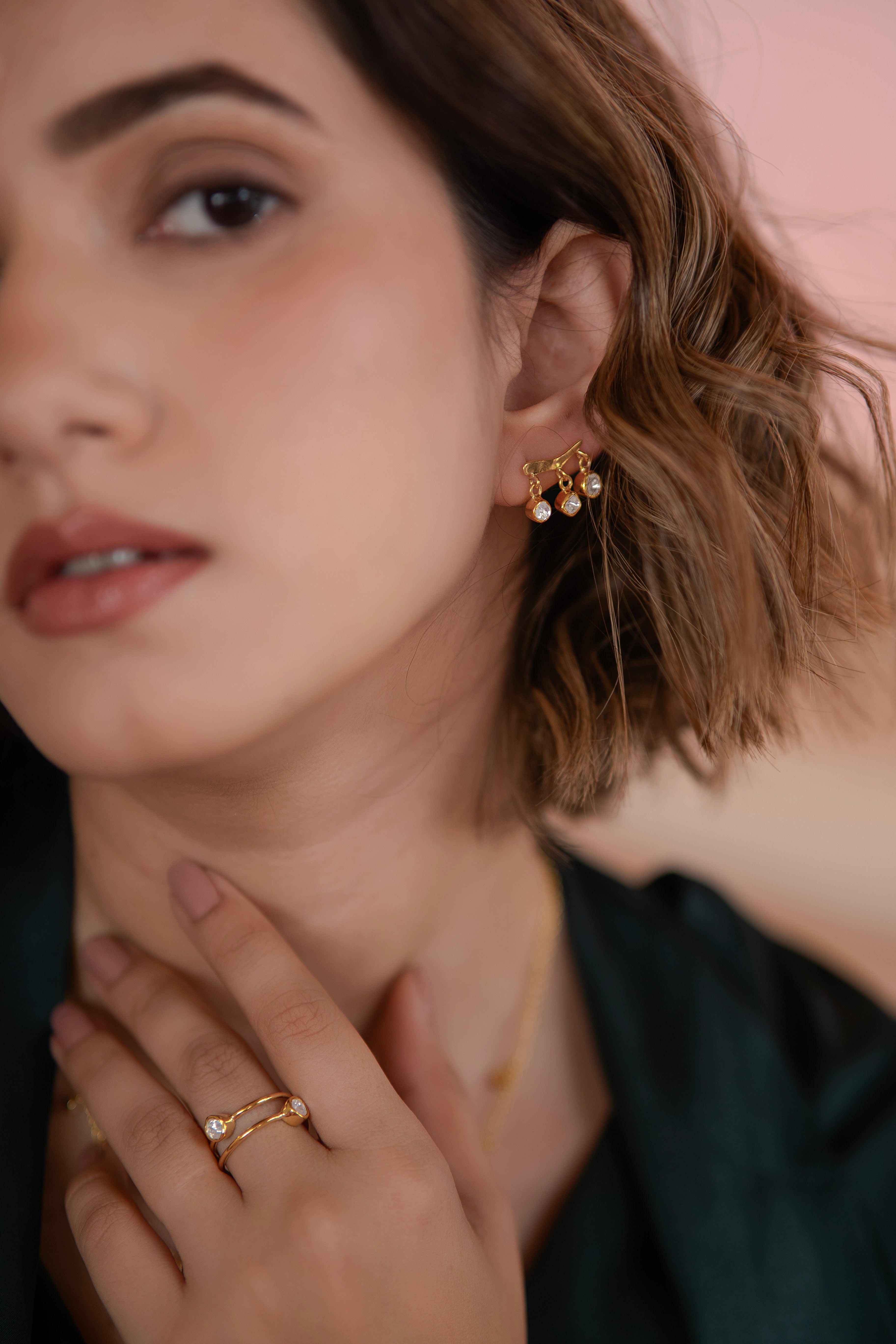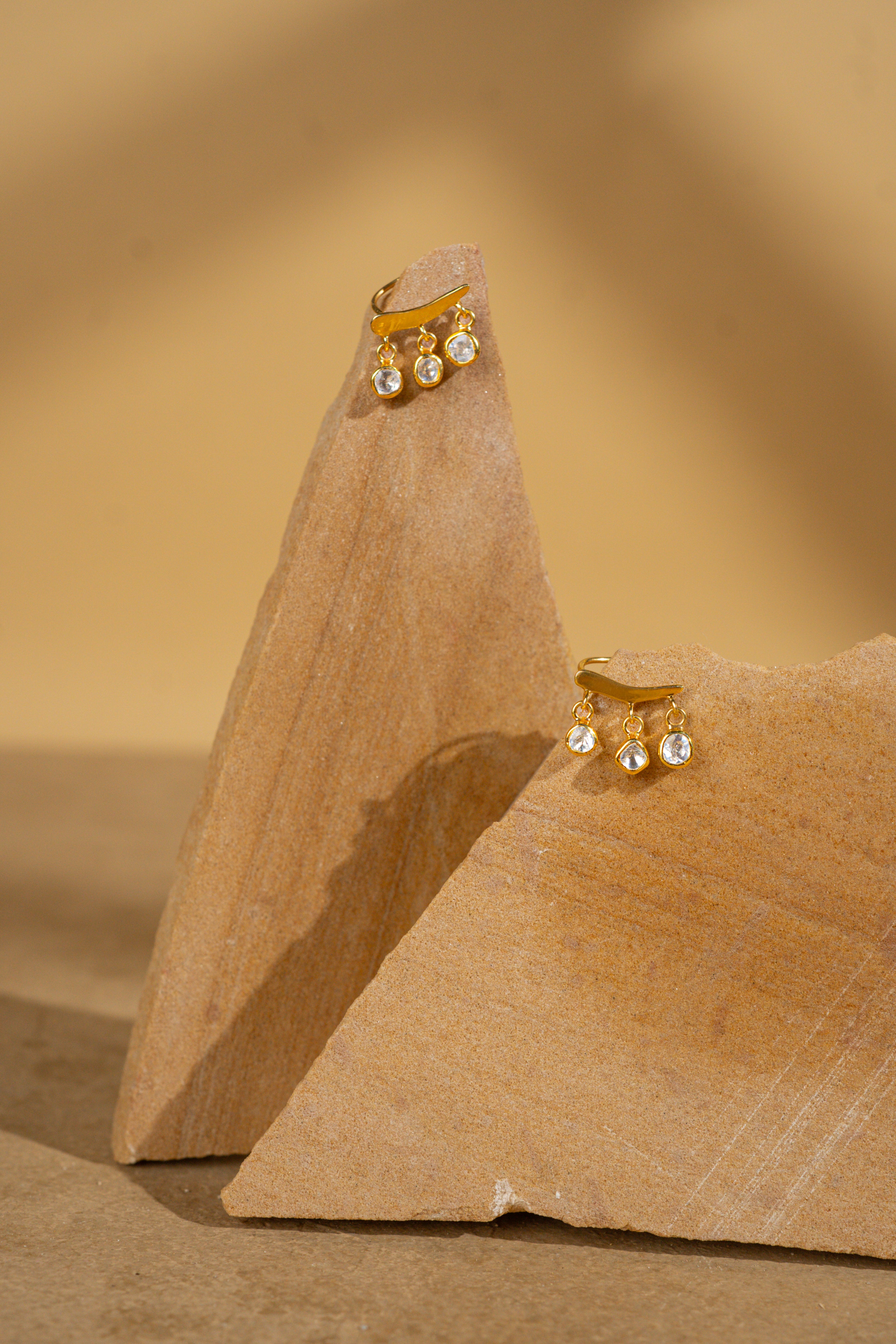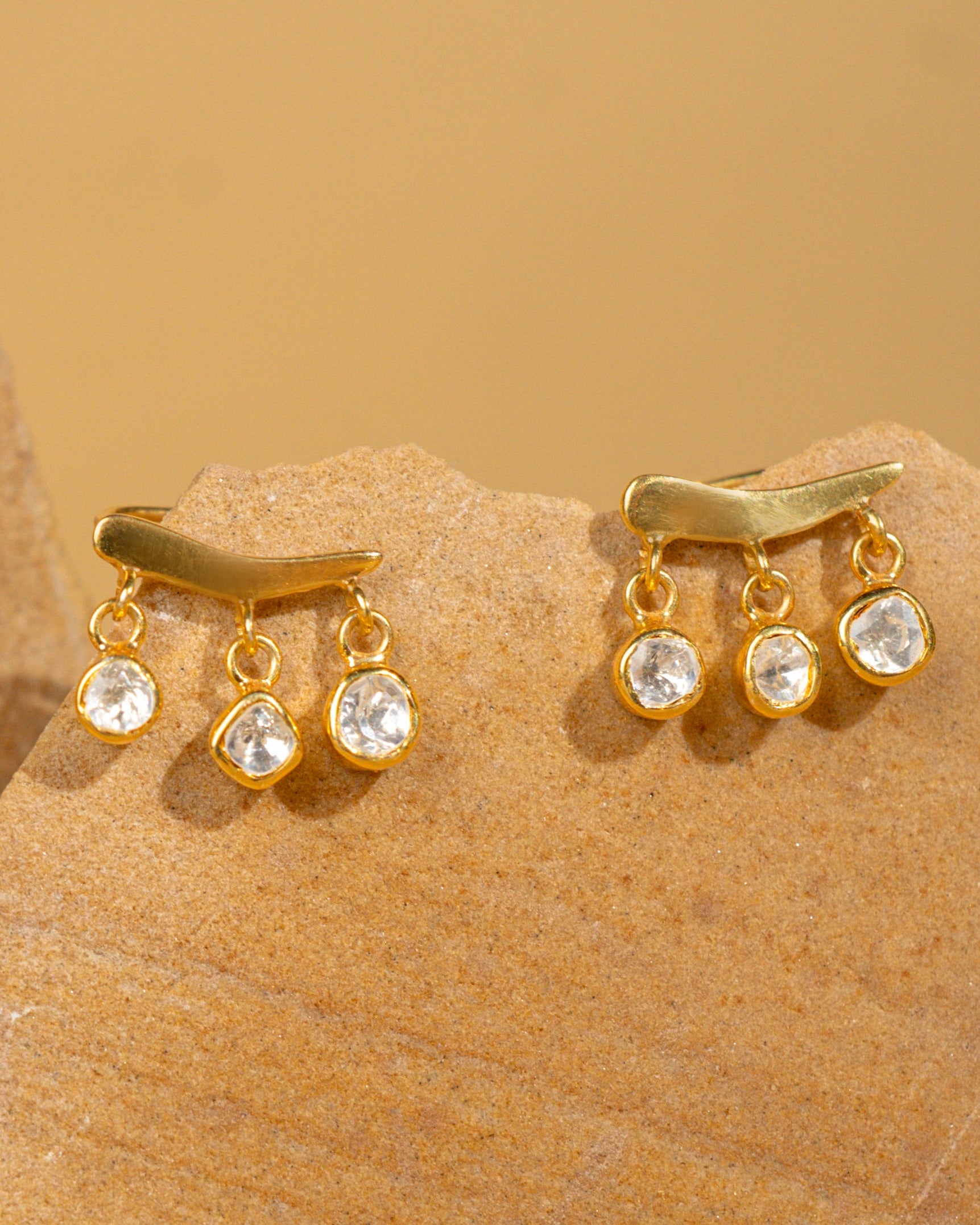 The Iris Earrings are a poetic play on form and illusion. Designed to appear like a double piercing, while actually requiring just one. A sleek gold bar gently curves across the earlobe, with three uncut moissanite drops suspended below, catching light with every turn. Crafted in 925 sterling silver and finished with a thick layer of 18K gold plating, these earrings combine old-world elegance with modern ingenuity.