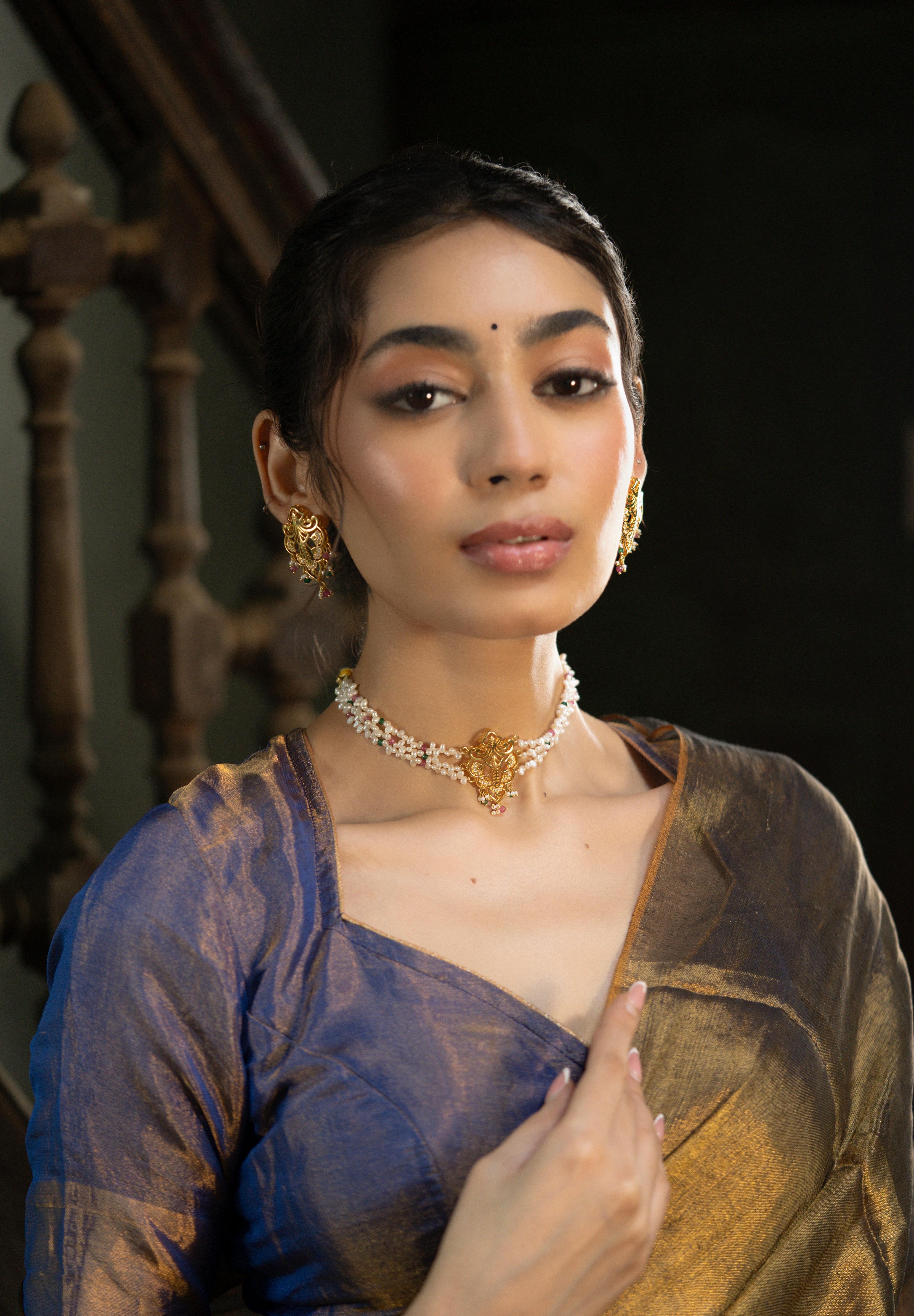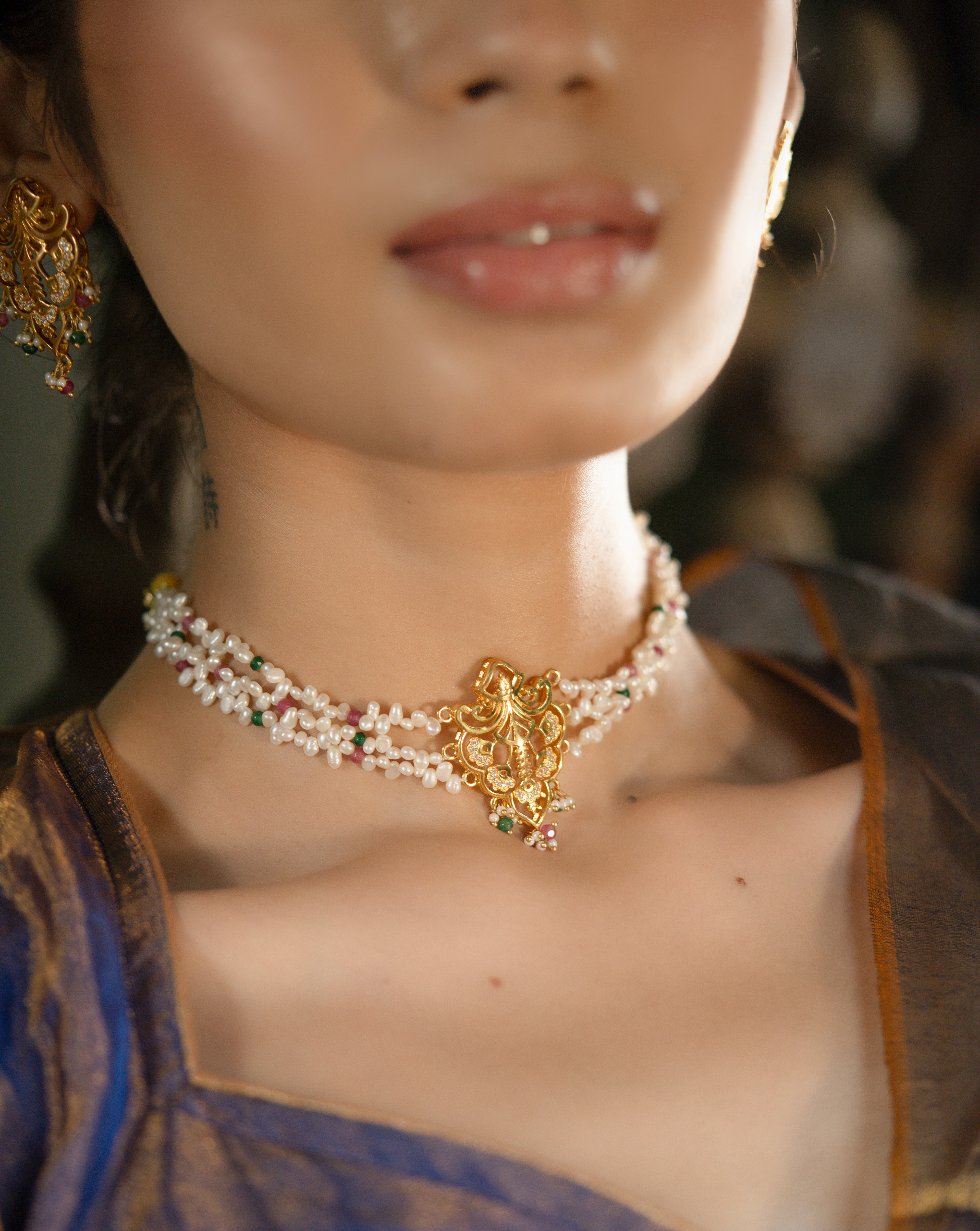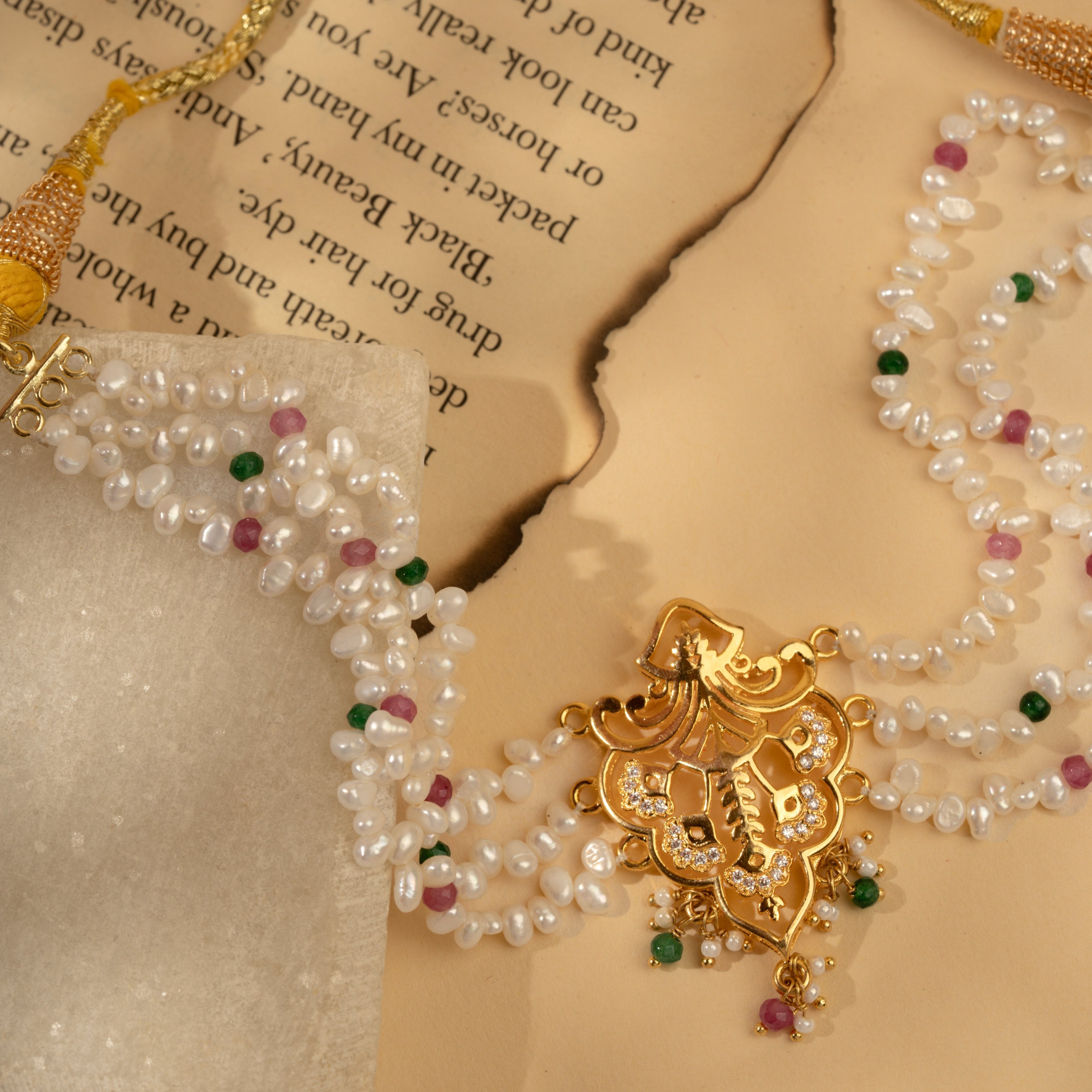 Inspired by the name Jahanara, meaning "Queen of the world" and "Bringer of beauty," this handcrafted necklace is a stunning celebration of artistry and elegance. Blending the enchanting styles of Art Nouveau and the Mughal Era, the Jahanara Necklace features a captivating jaali-cut motif at the center, drawing inspiration from intricate latticework. Surrounding the neckline are luxurious strands of uneven pearls, rubies, and emeralds, creating a harmonious fusion of color and texture.