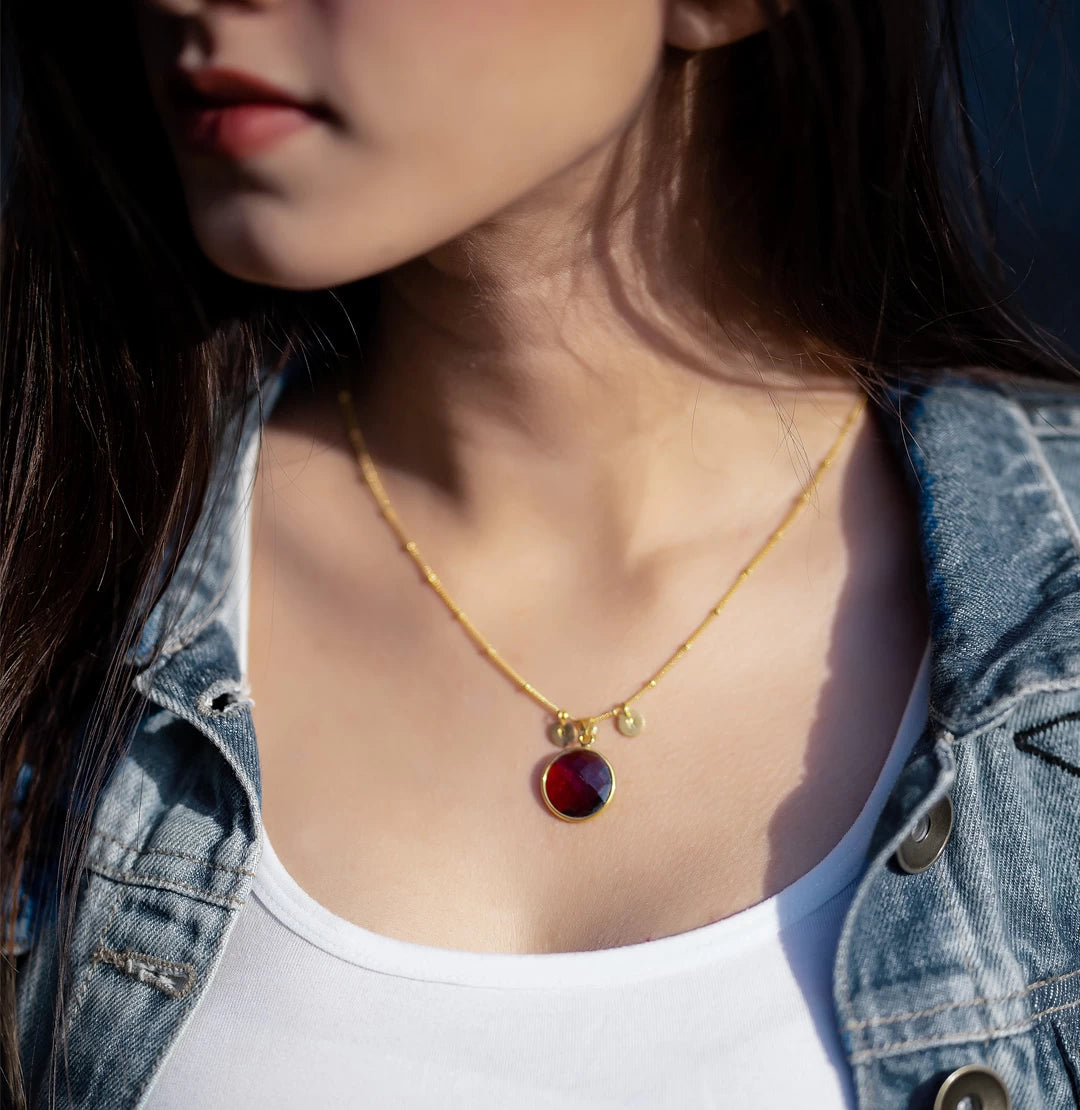 Handcrafted necklace made out of Indian Garnet stone in 925 pure silver and 18k gold plating. You can personalize it by adding two initials in the necklace. A perfect gift to someone you love or yourself.