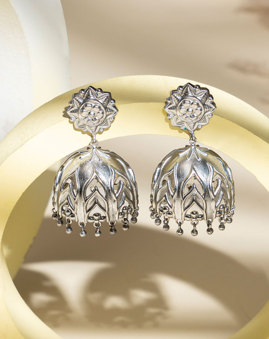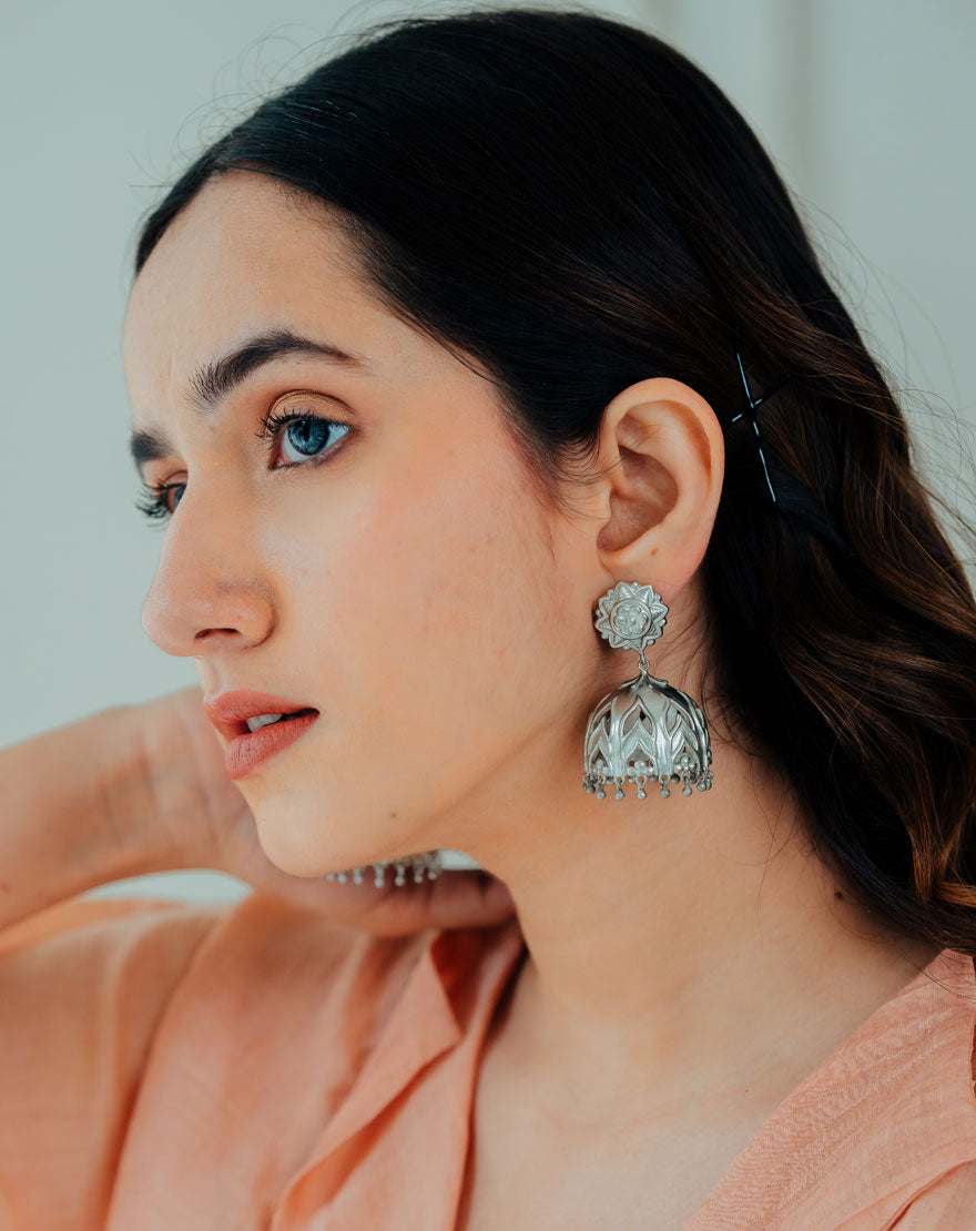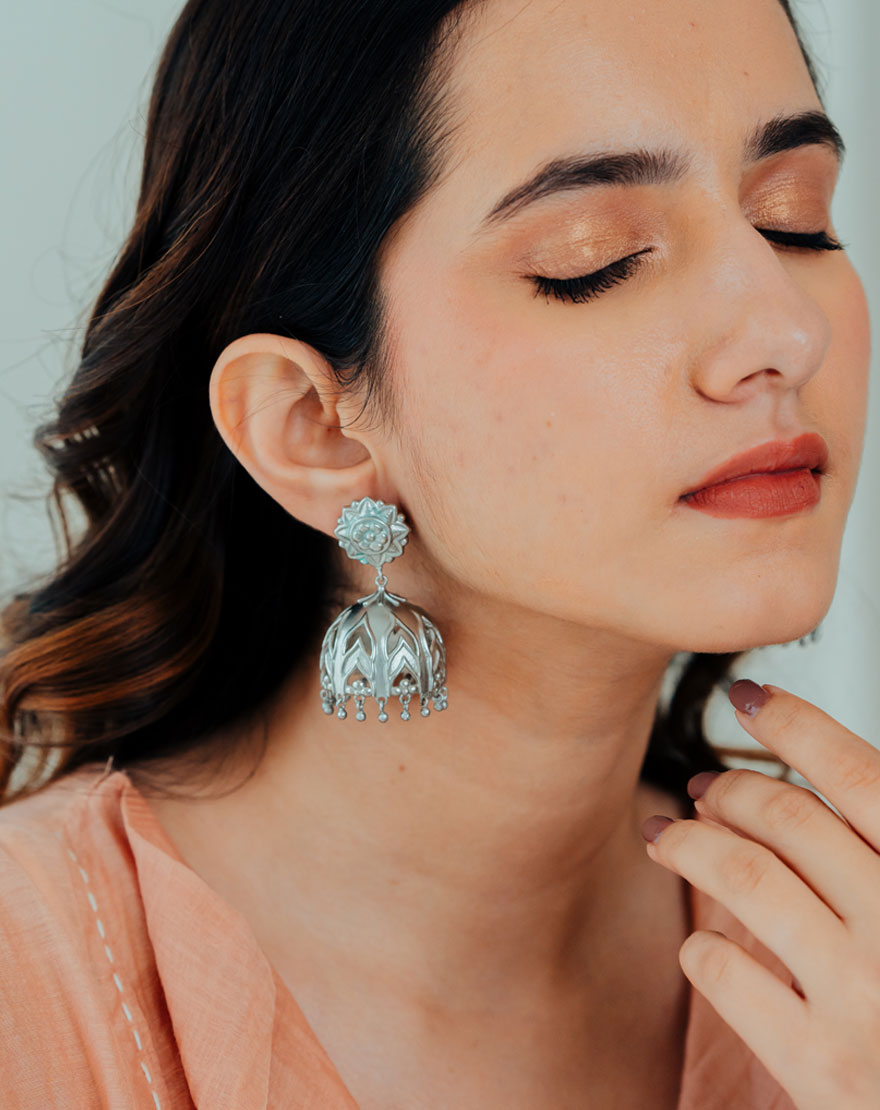 These stunning jhumkas are inspired from the Jharokha structure found in palaces of Jaipur. A subtle see through effect are hand carved in the jhumkis with a fine floral detailing. These earrings are on recycled silver plated brass. They are light in weight yet statement making. An essential pair of boho silver jewelry for your wardrobe.