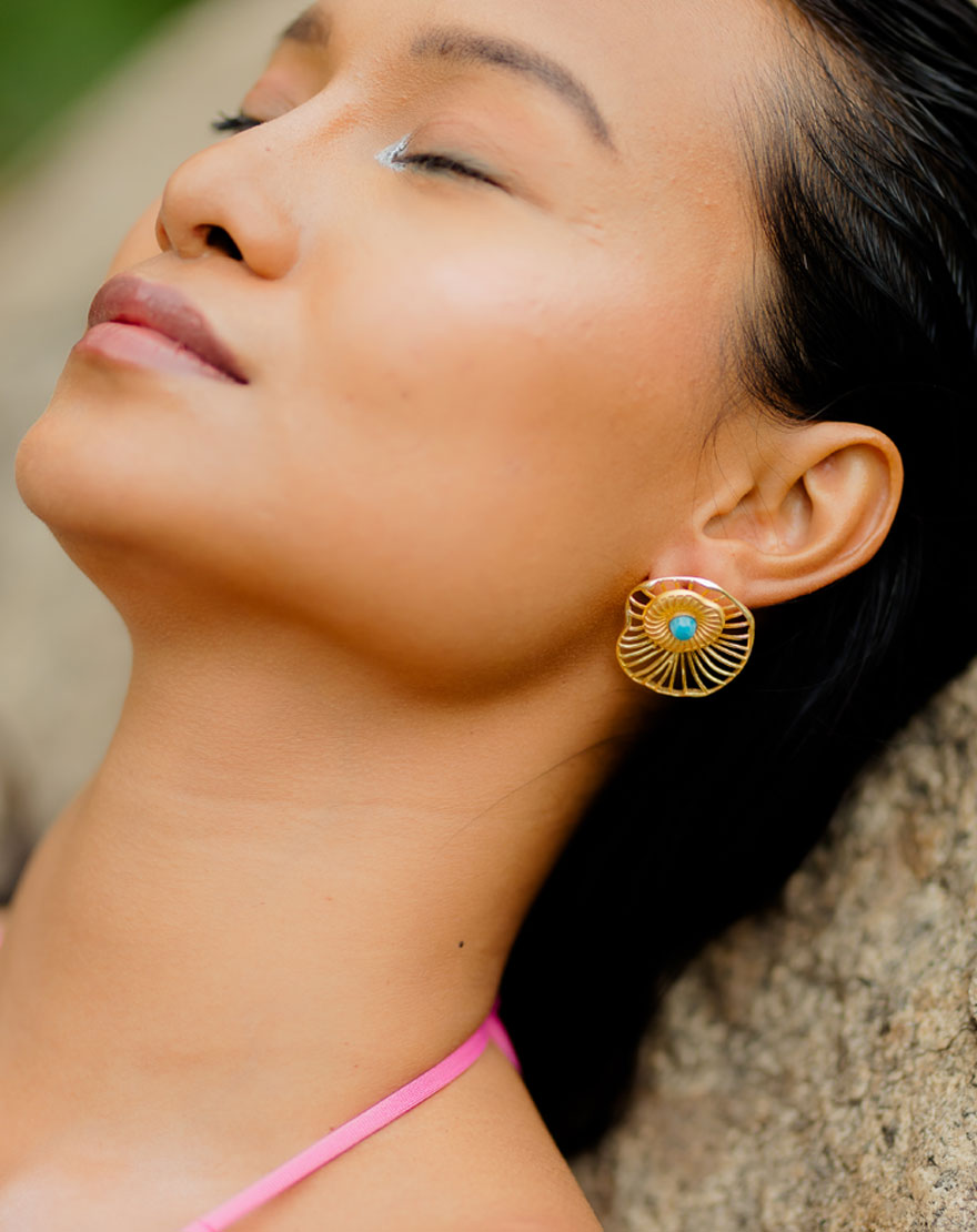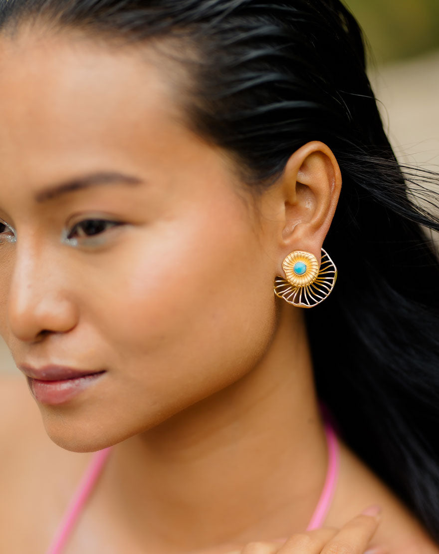 Kai means Sea in Hawaiian language. These versatile studs are detachable and can be worn in 3 different ways. The back layer of the earrings depicts waves in the sea and the larimar stone is the beautiful color of the sea. Handcrafted using 18k gold plated recycled brass with natural larimar stone. The attention to detail in these earrings is unparalleled.