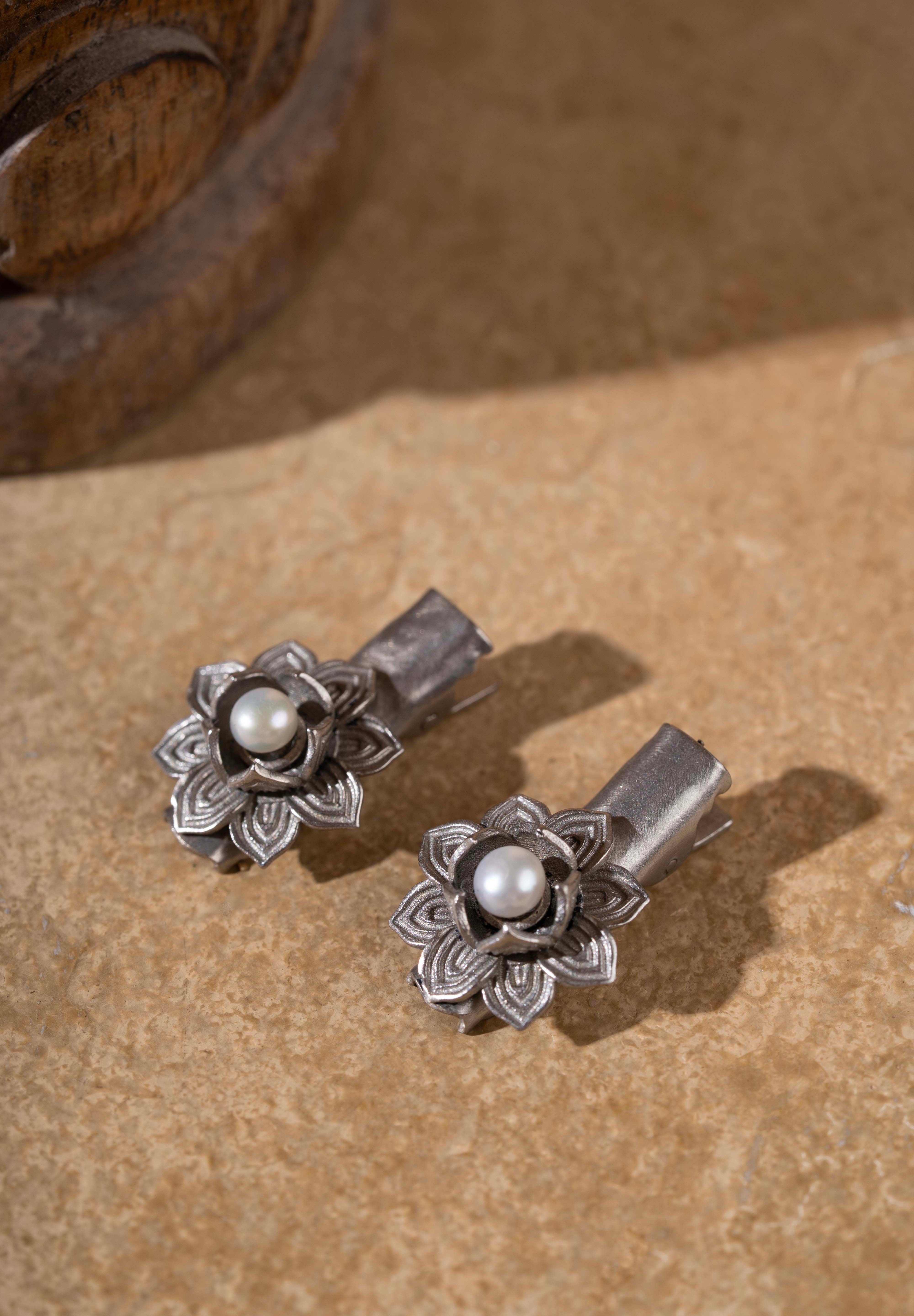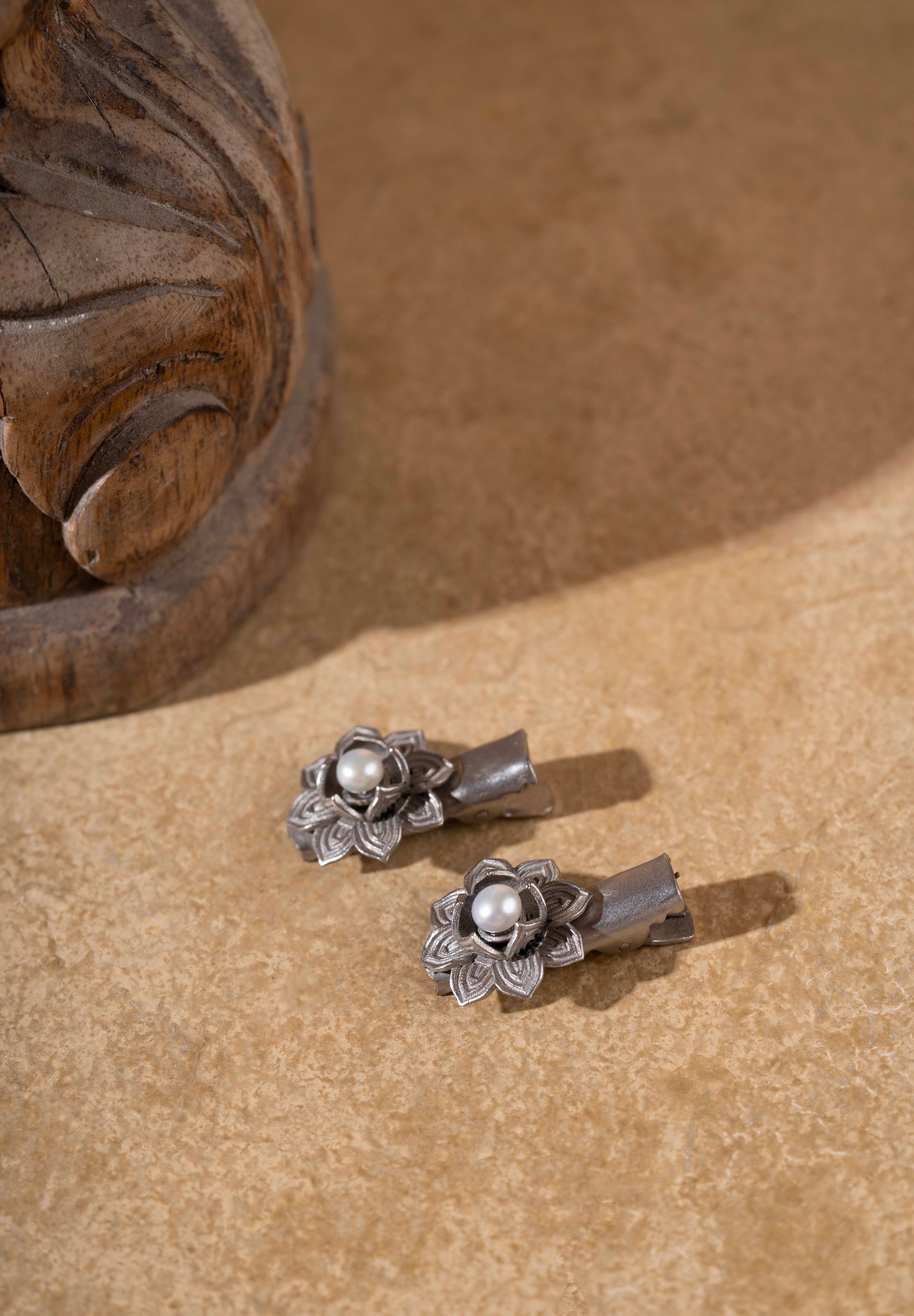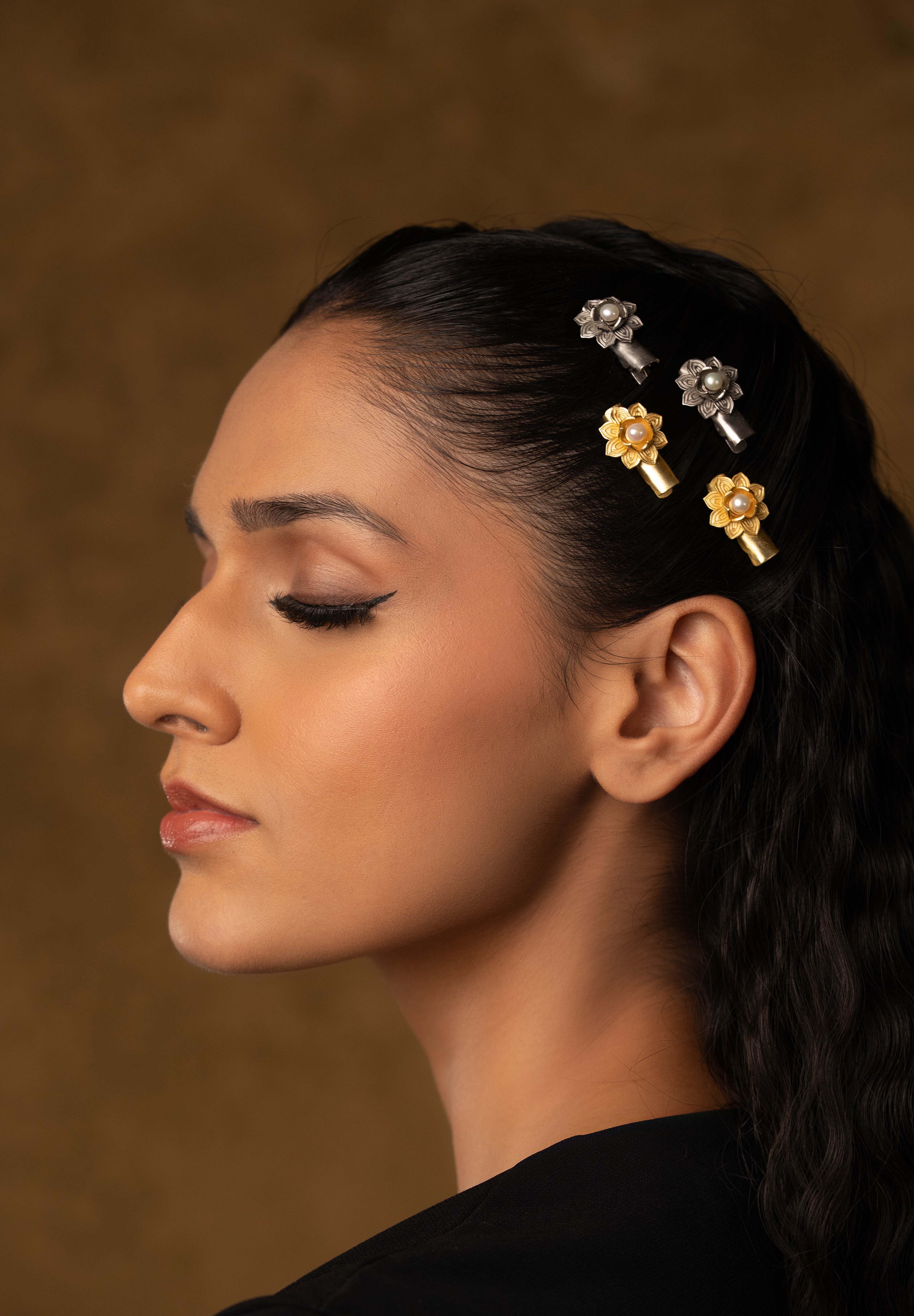 Ethereal and timeless, the Lunara Hair Clip in silver-plated gunmetal finish reimagines the beauty of Egyptian floral jewelry. The 3D sculpted flower, crowned with a lustrous pearl, reflects quiet strength and sophistication. A modern ode to ancient femininity, it complements both everyday elegance and occasion wear with effortless grace.