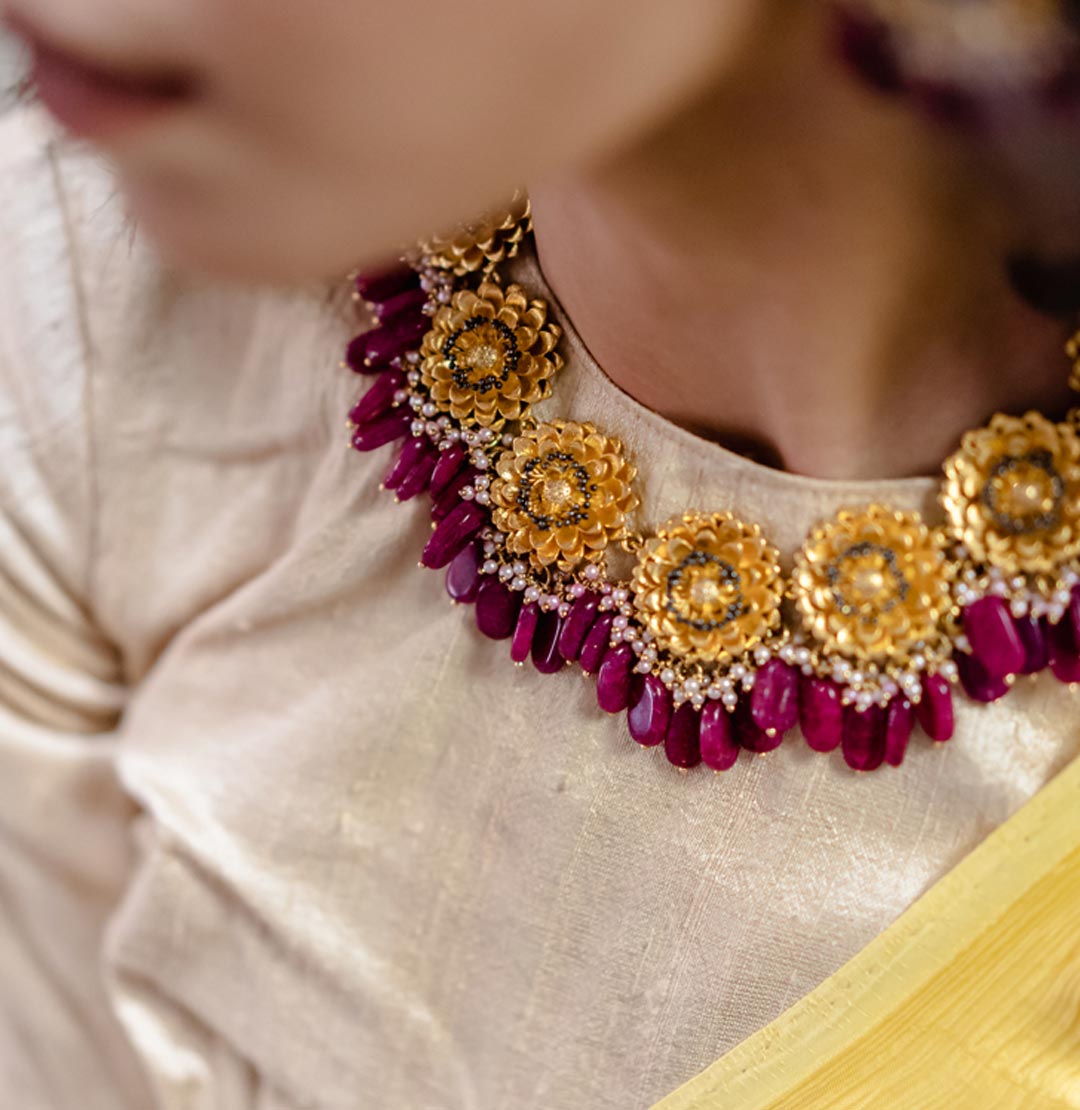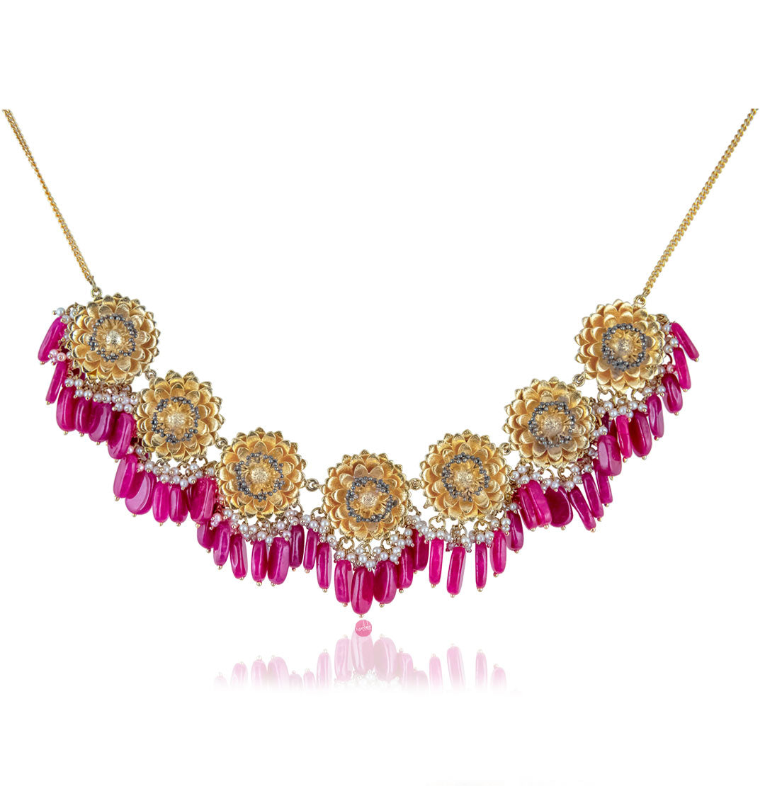 Marigold Necklace – Rani Pink – Handcrafted statement making choker made using layers of metal just like in a marigold flower. With 1 micron gold plating and semiprecious Ruby Agate bead and pearls.
