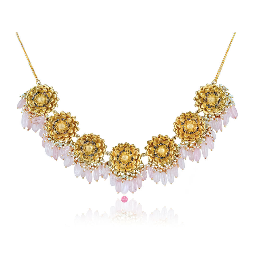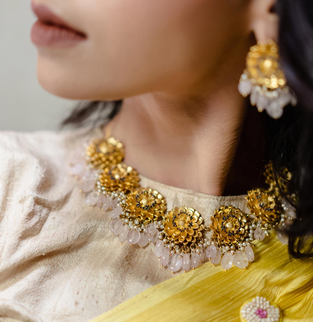 Marigold necklace – Rose Quartz – Handcrafted statement making choker made using layers of metal just like in a marigold flower. With 1 micron gold plating and semiprecious Rose Quartz bead and pearls.