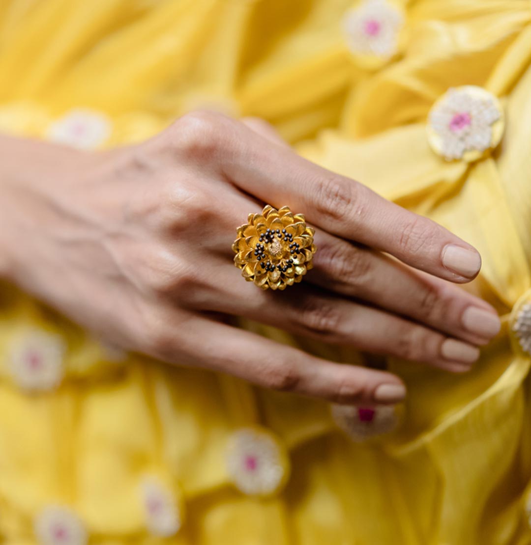 Marigold Ring – Handcrafted statement making ring made using different layers of metal just like in a marigold flower. In 1 micron gold plating with intricate detailing.