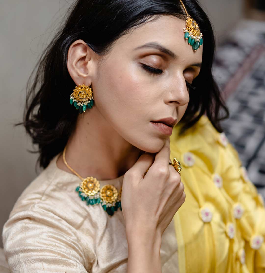 Marigold Studs – Emerald Green – Handcrafted earrings made using layers of metal just like in a marigold flower with quality 1 micron plating and detailing. Semiprecious Emerald Green beads and pearls dangling to complete the silhouette.