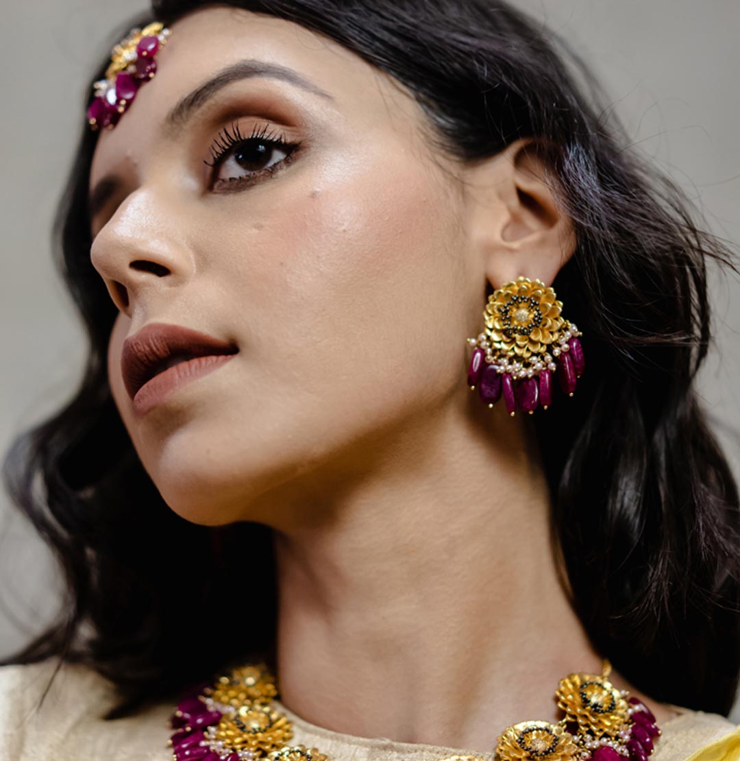 Handcrafted earrings made using layers of metal just like in a marigold flower with quality 1 micron plating and detailing. Semiprecious Ruby agate beads and pearls dangling to complete the beautiful earrings.