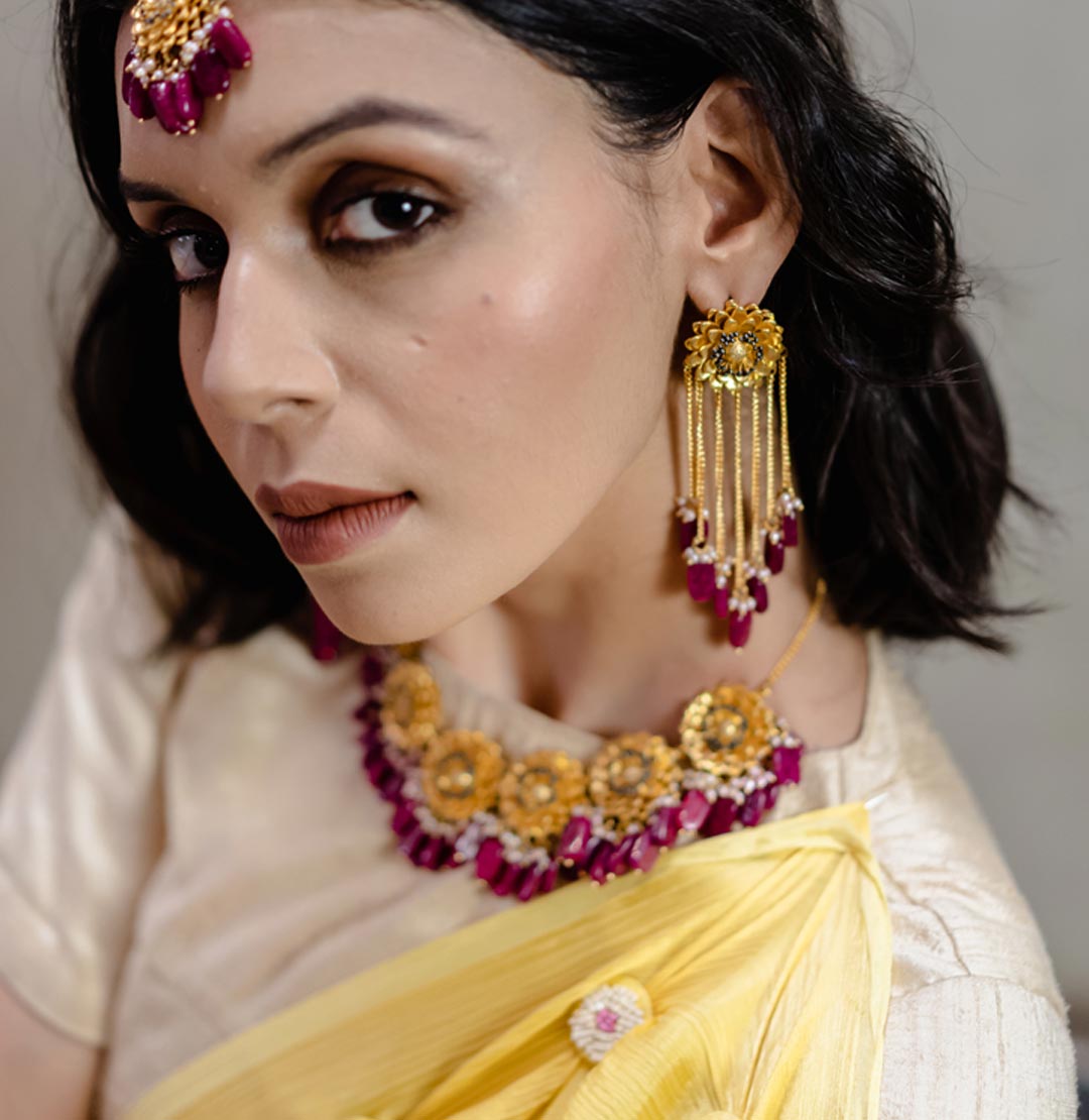 Marigold Tassels – Rani Pink – Handcrafted earrings made using layers of metal just like in a marigold flower with quality 1 micron plating and tassels. Semiprecious Ruby Agate beads and pearls dangling to complete the beautiful earrings.