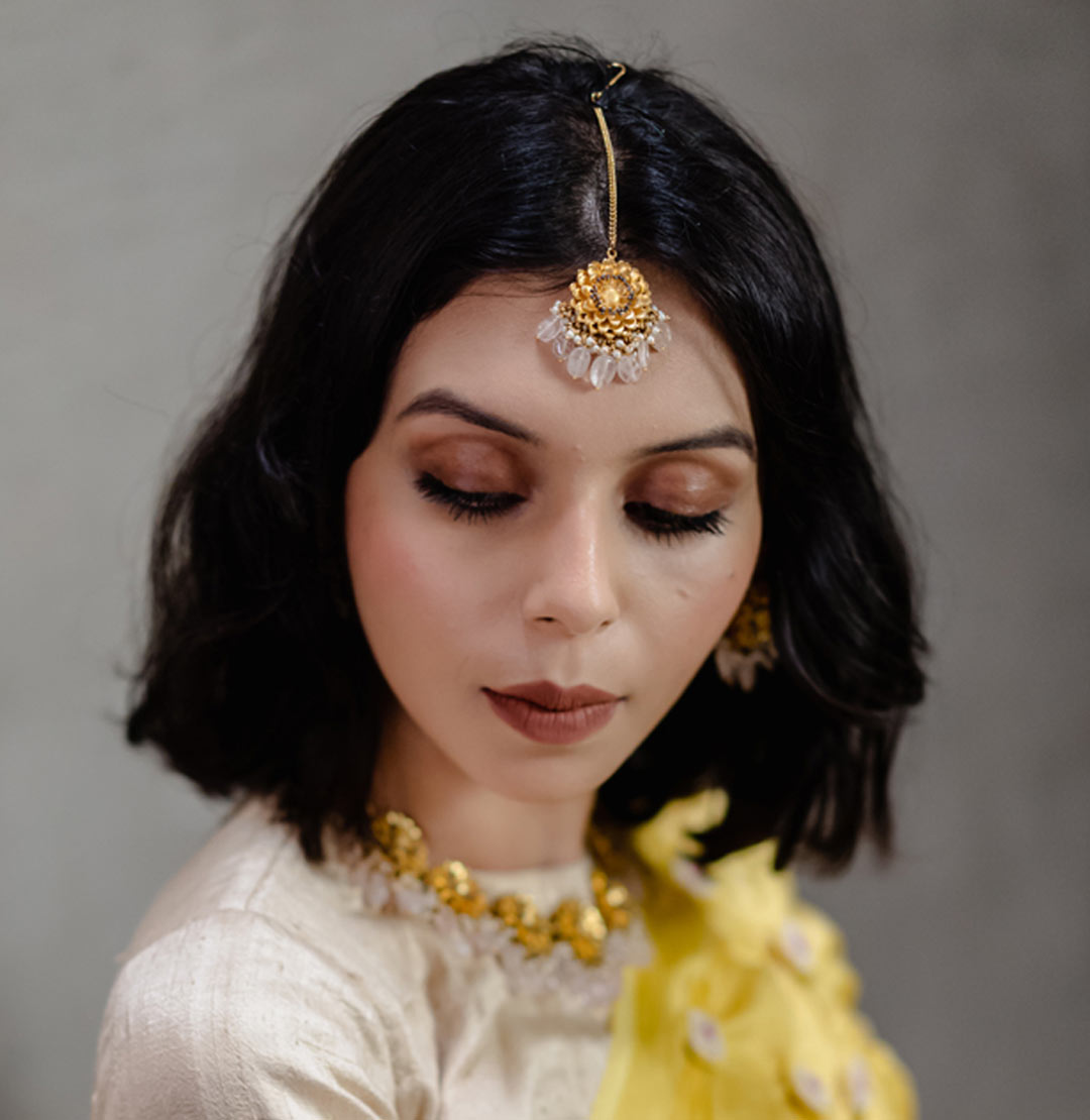 Marigold Tika – Rose Quartz – Beautiful handcrafted tika made out of different layers of metal just as in the marigold flower. In 1 micron gold plating with Rose Quartz beads and pearls.