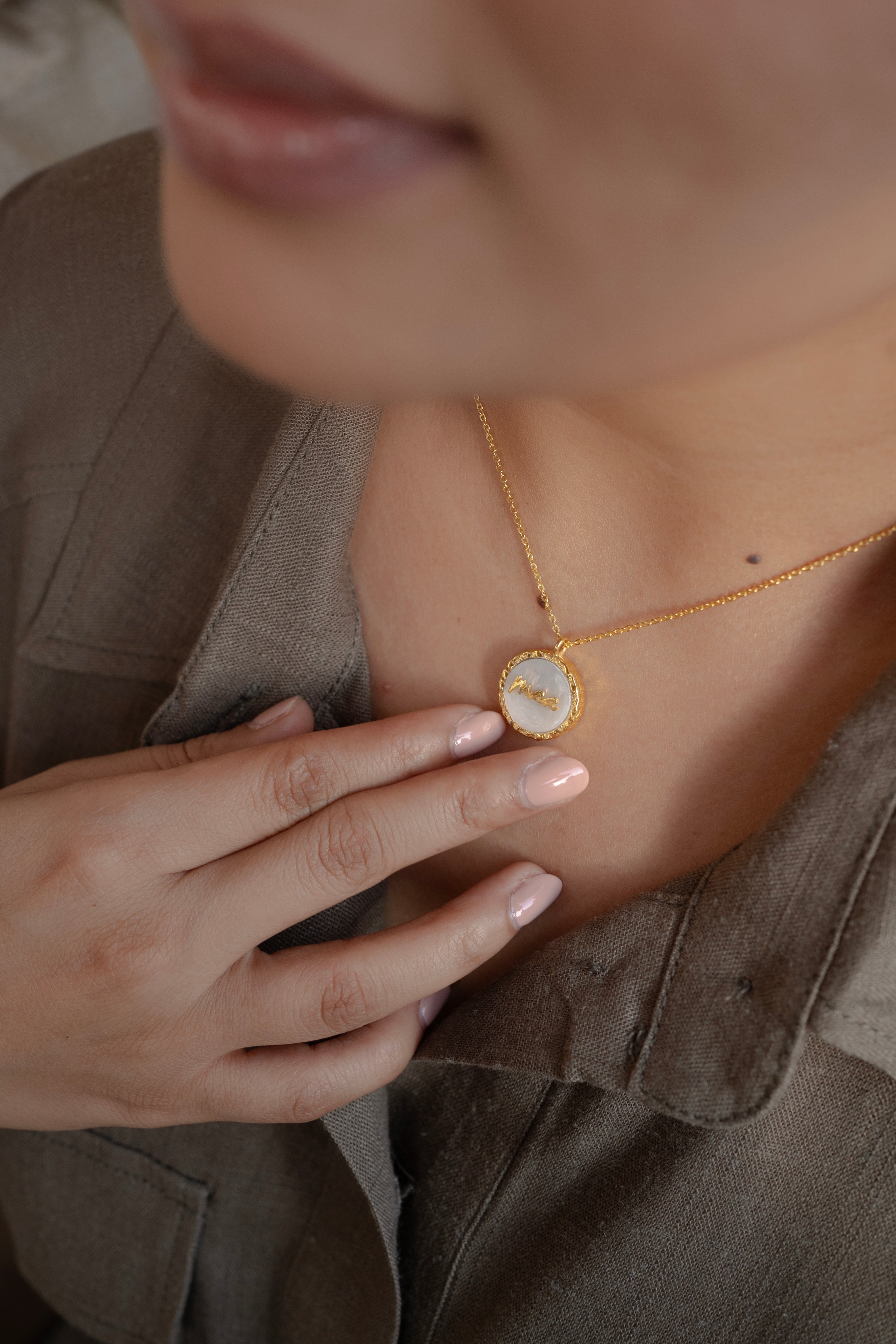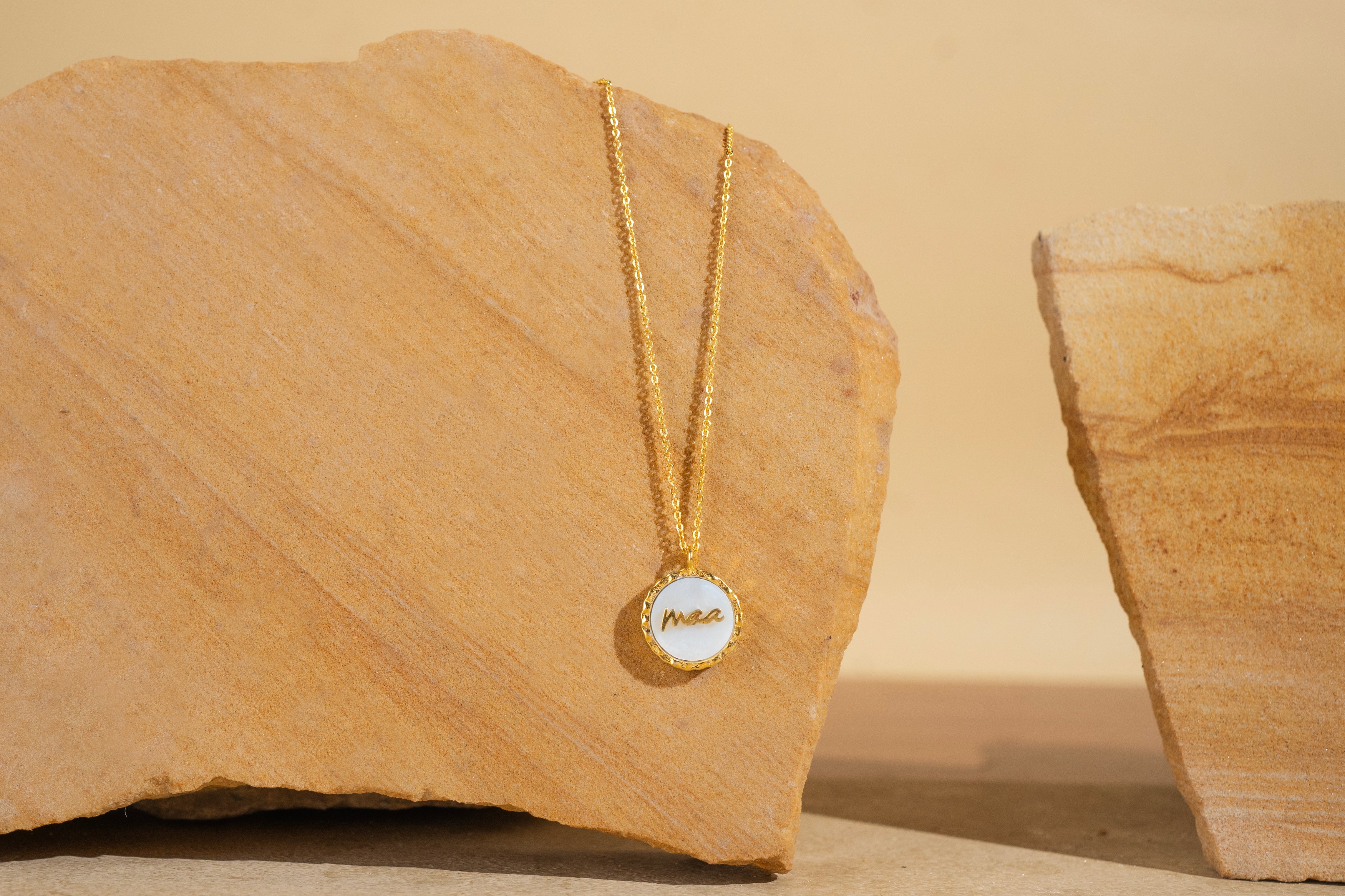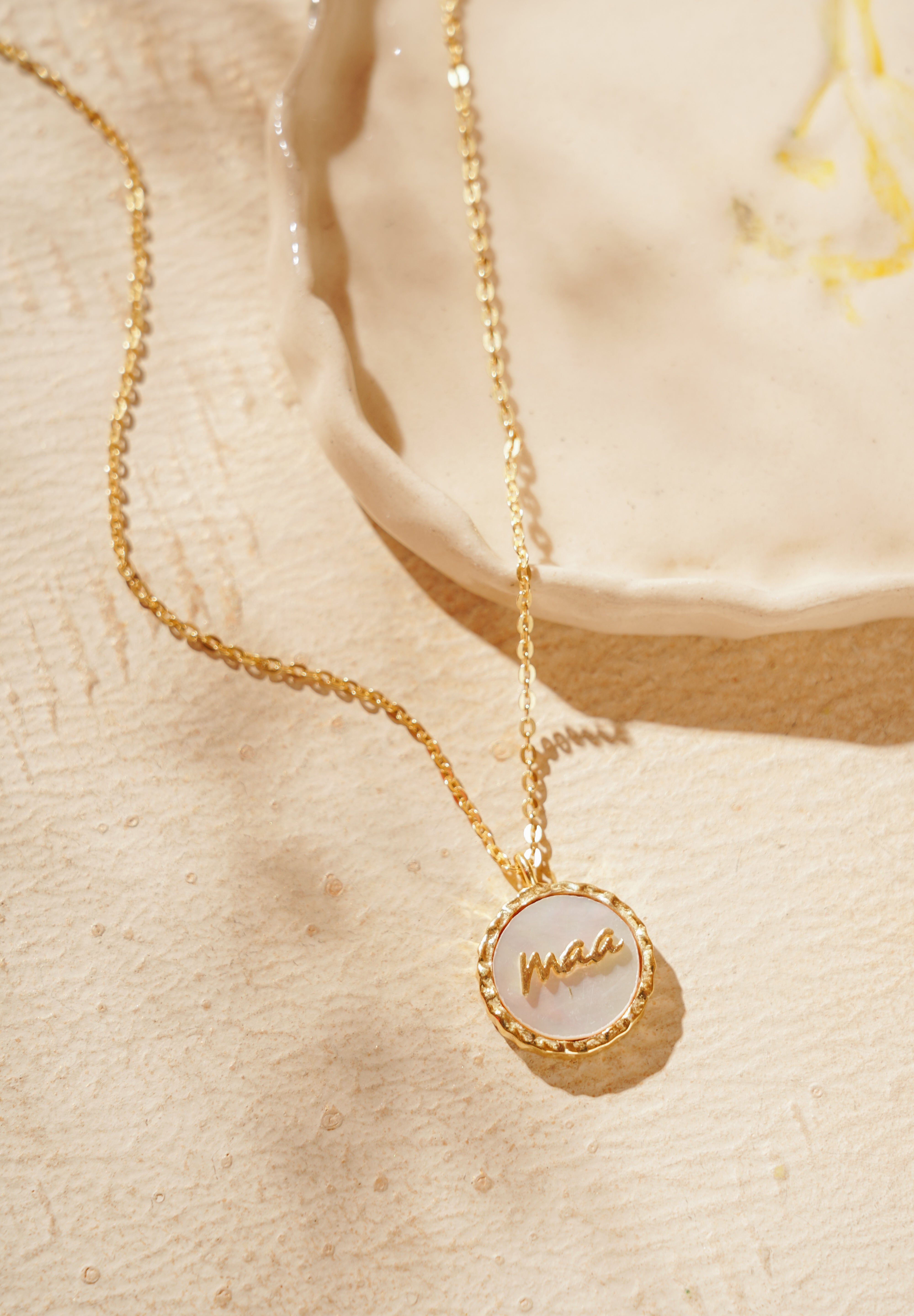 Celebrate the protective bond of motherhood with our exquisite Mother of Pearl Necklace. Each piece is lovingly handcrafted, featuring 'maa' delicately inscribed on sterling silver with 18k gold plating, symbolizing eternal maternal love. Embrace the nurturing embrace of nature's 'nacre' with this timeless treasure. Shop now and cherish the eternal connection between mother and child.