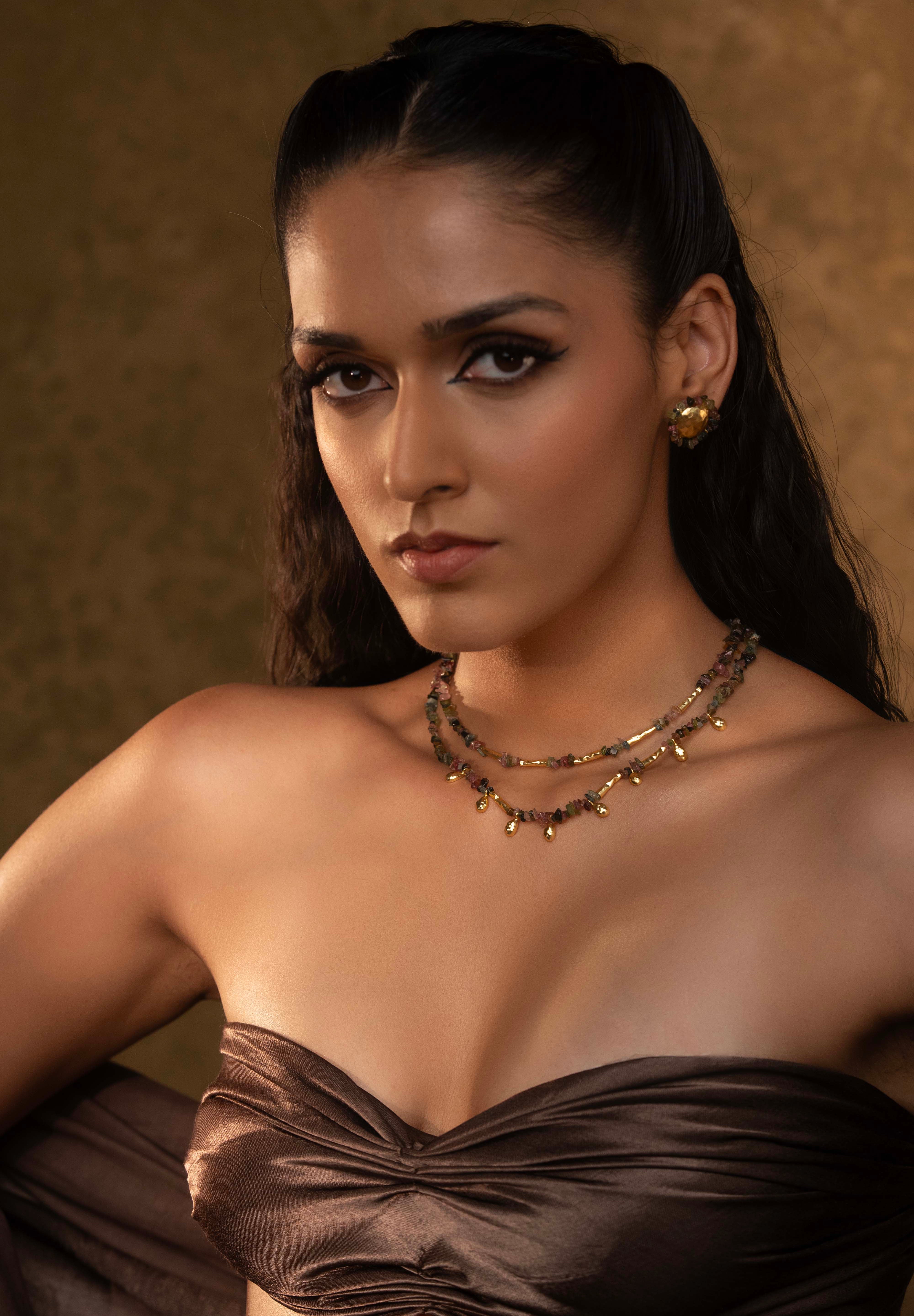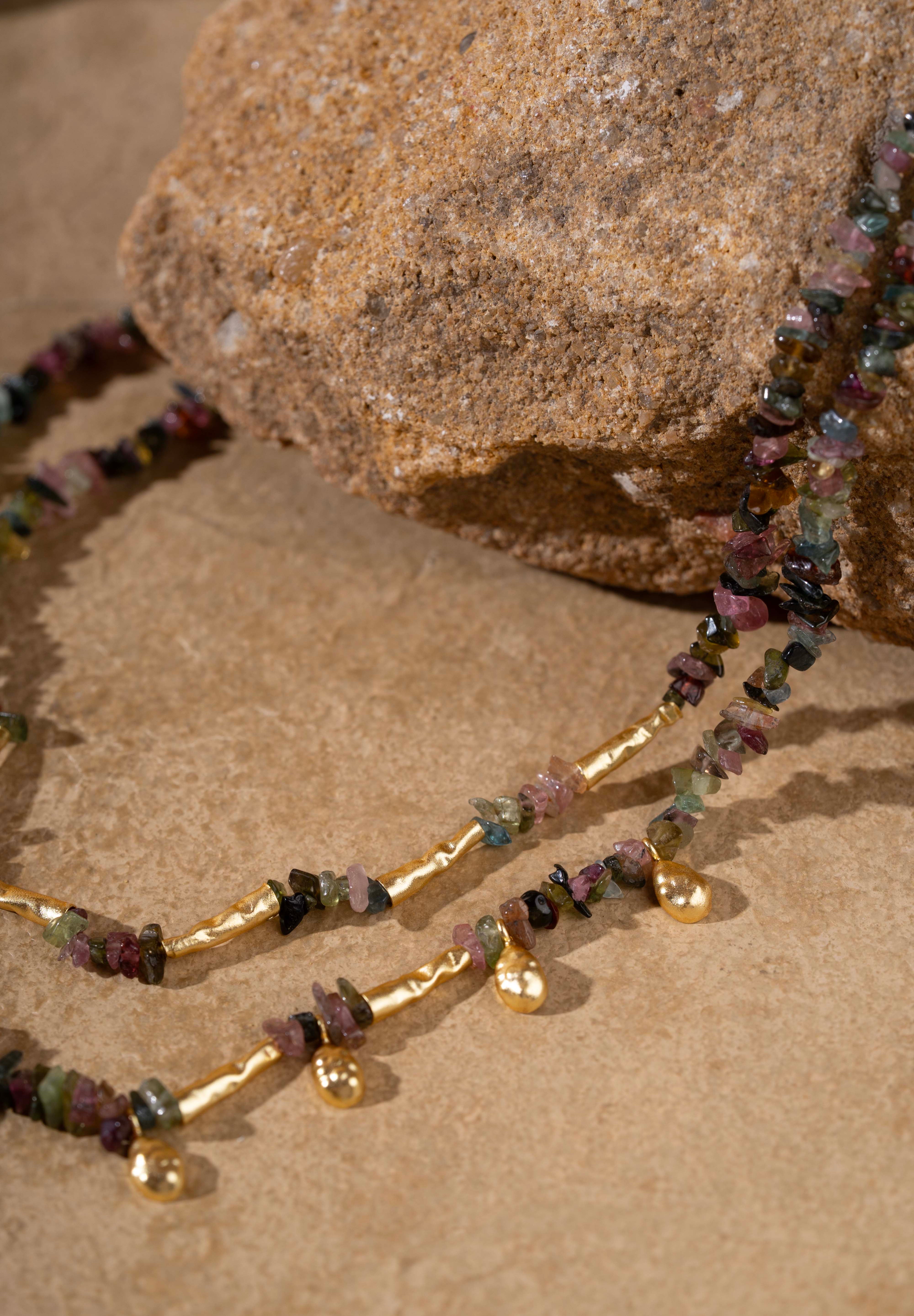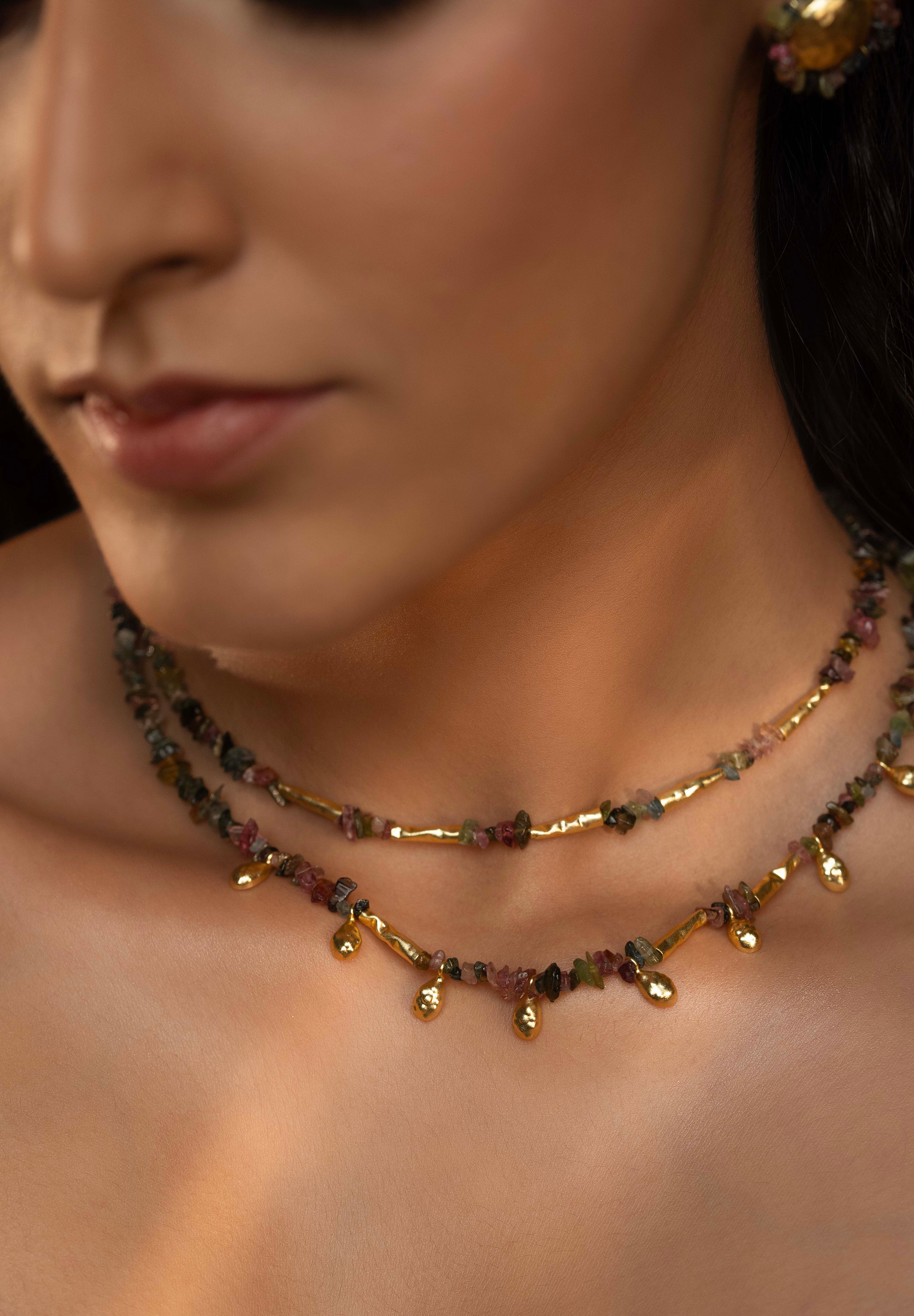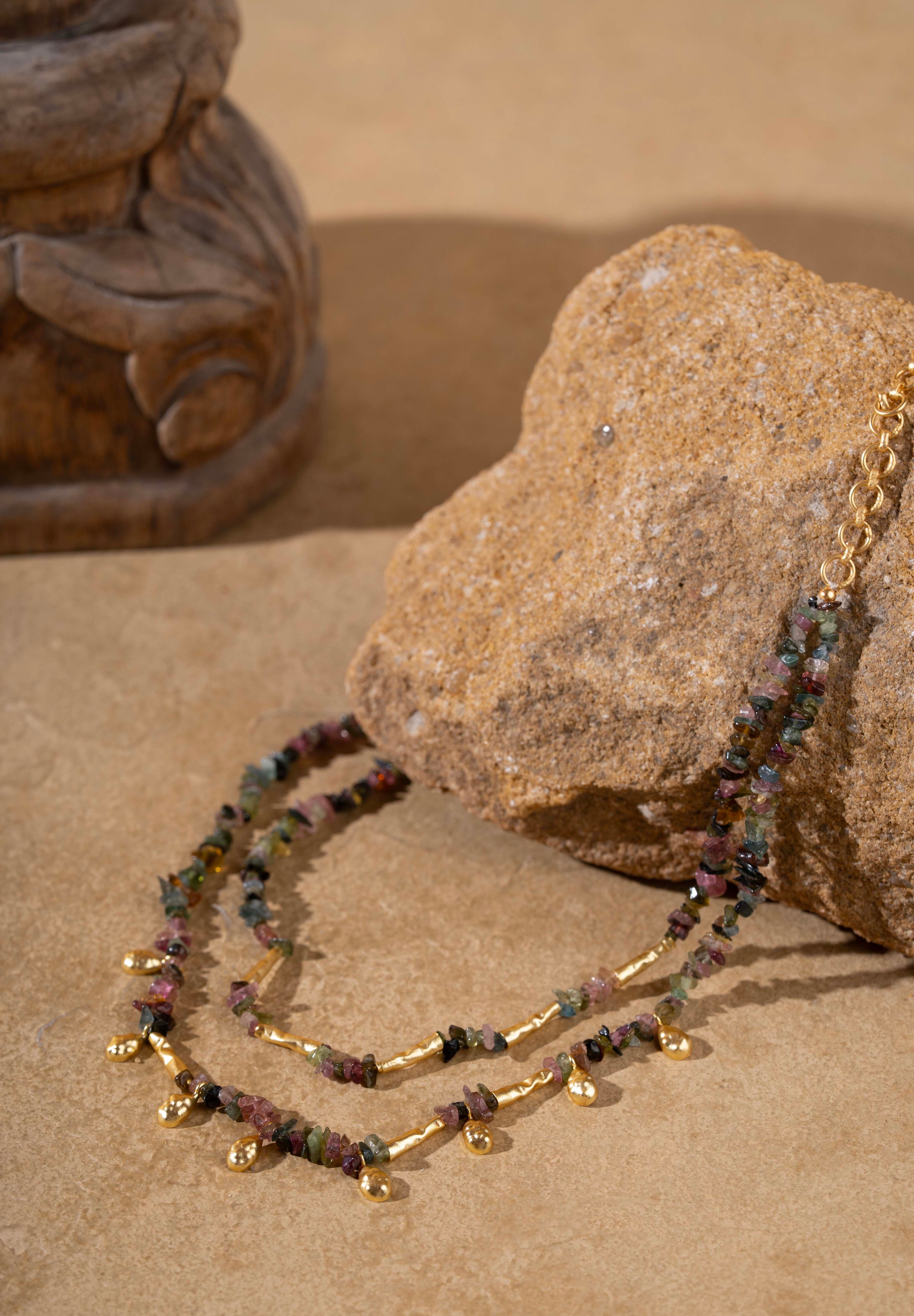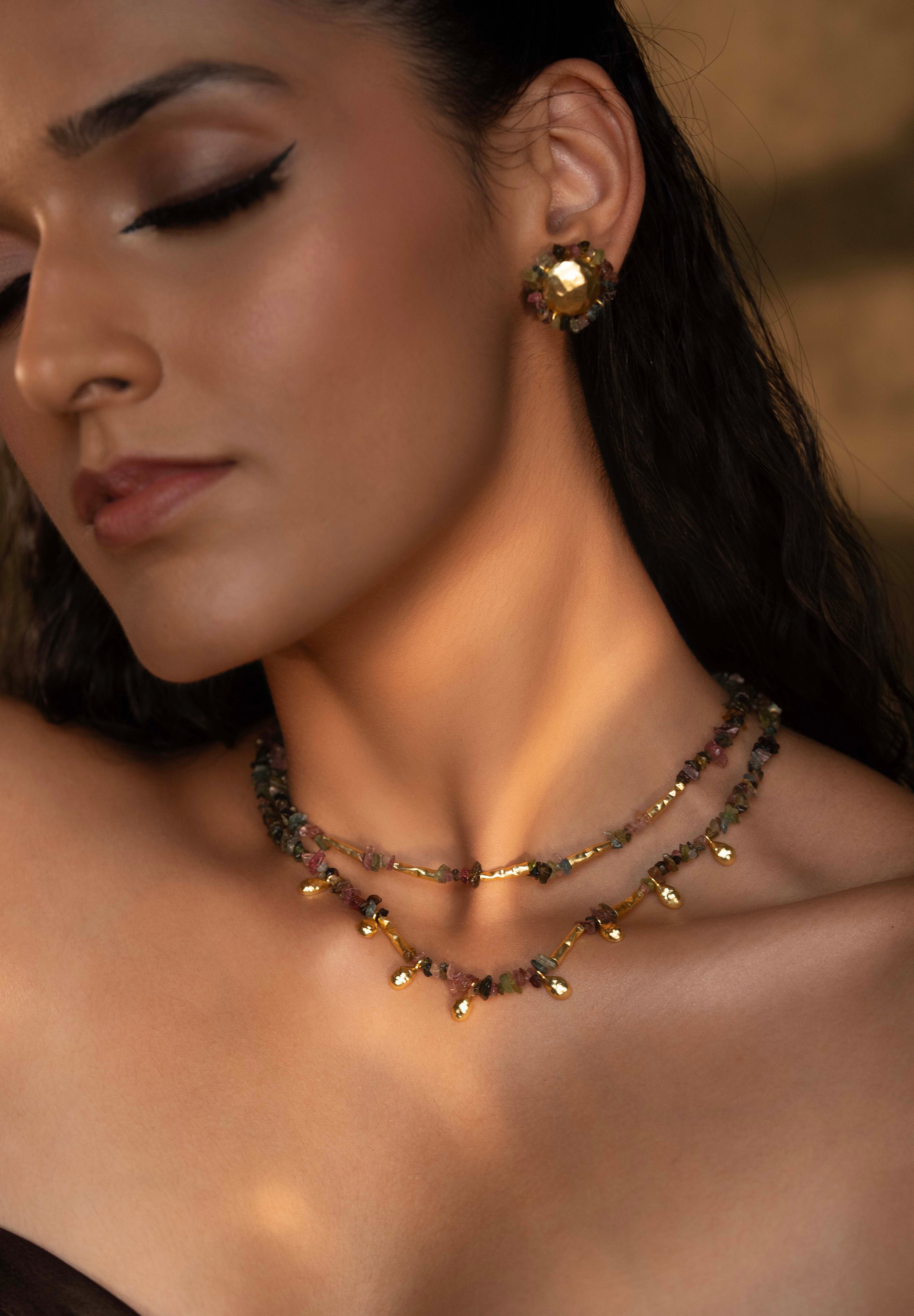 The Nefra Necklace is a two-layered statement piece that reflects the timeless elegance of Egyptian craftsmanship. Handcrafted in 16K gold-plated recycled brass with a satin matte finish and anti-tarnish coating, it features drop-shaped hammered brass motifs interspersed with natural watermelon tourmaline beads in earthy tones of green, pink, and gold. Each unevenly cut bead adds organic charm, making this necklace a modern relic of old-world beauty — designed to move effortlessly from resort wear to evening attire.