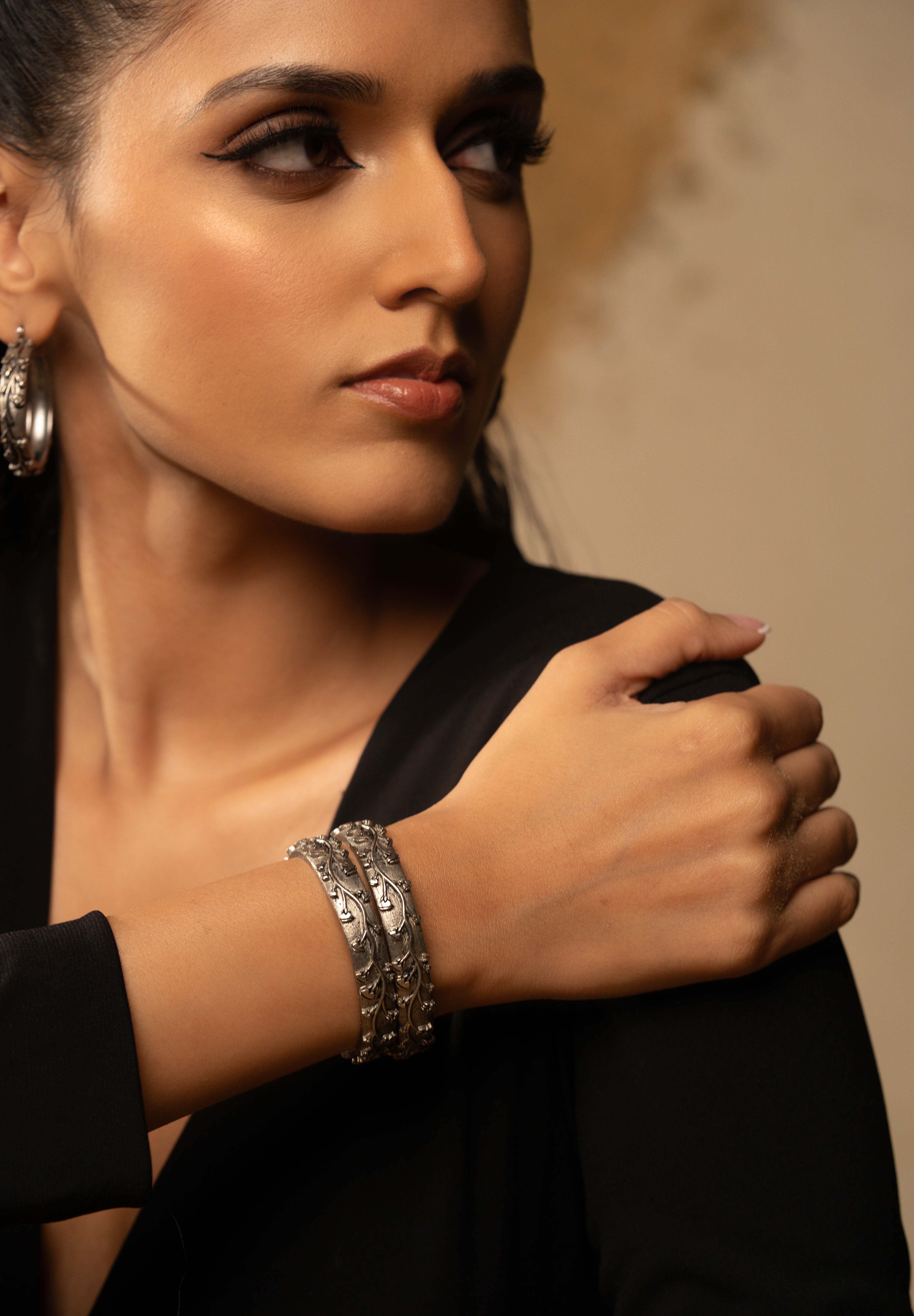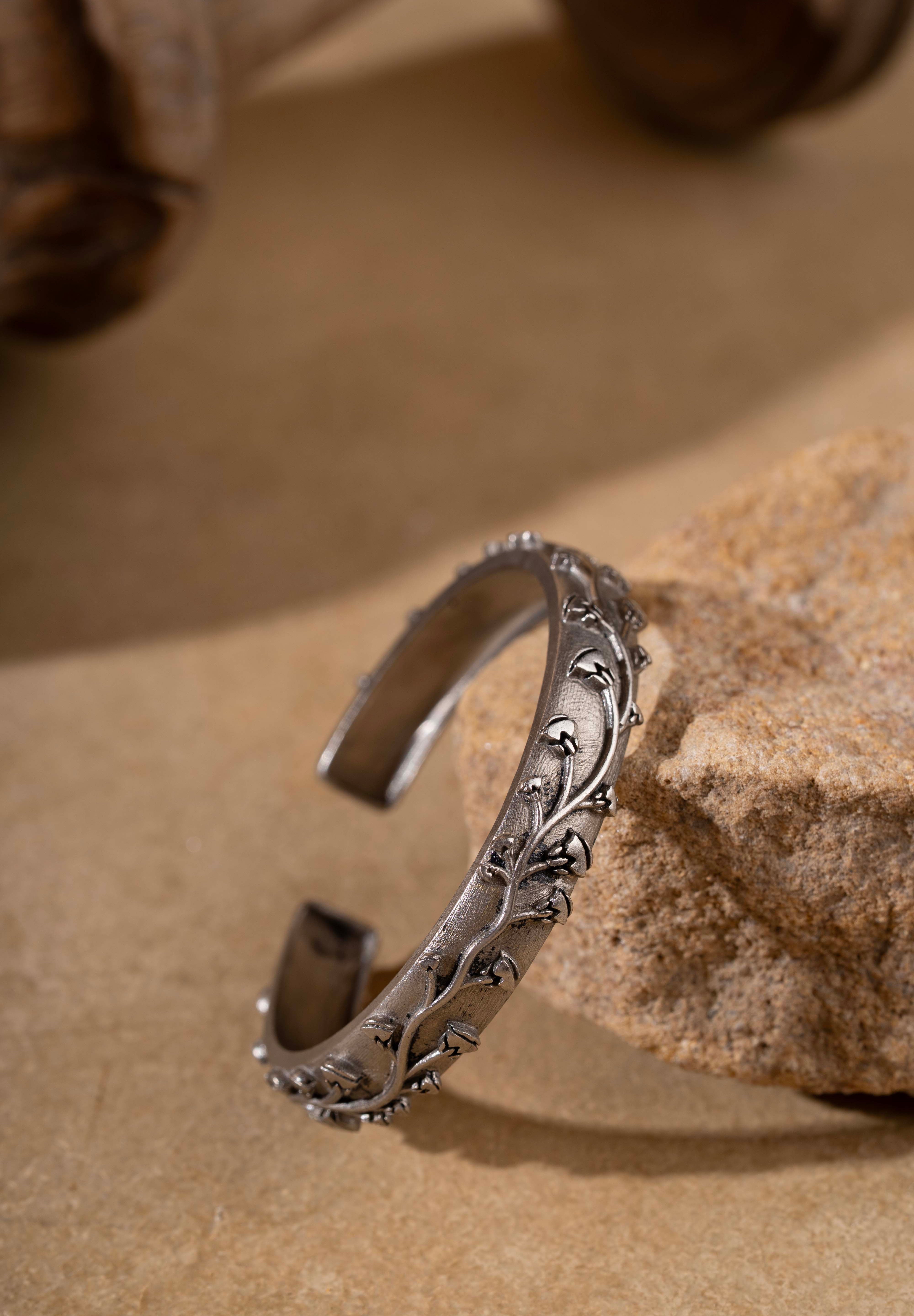 Inspired by the sacred Egyptian lotus — a symbol of rebirth and creation — the Nefura Bangle Bracelet is a poetic expression of strength and grace. Handcrafted in recycled brass with a silver-plated gunmetal finish, it features a delicate trail of carved floral motifs that wrap elegantly around the wrist. The adjustable design ensures a perfect fit, making it a versatile piece that transitions effortlessly from day to night.