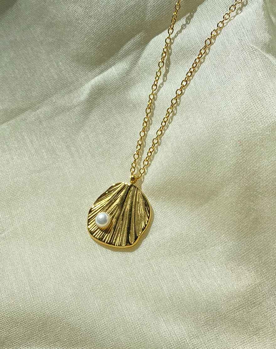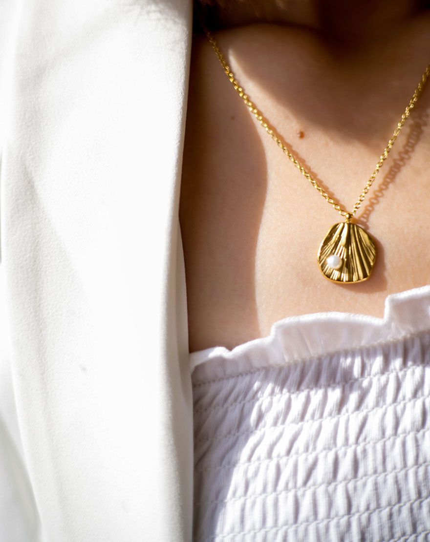 A perfect summer necklace for beach wear or resort wear with handmade metal oyster on 1 micron gold plated stainless steel with a rice pearl. Layer it with our other neckpieces or just wear it as a single statement piece.