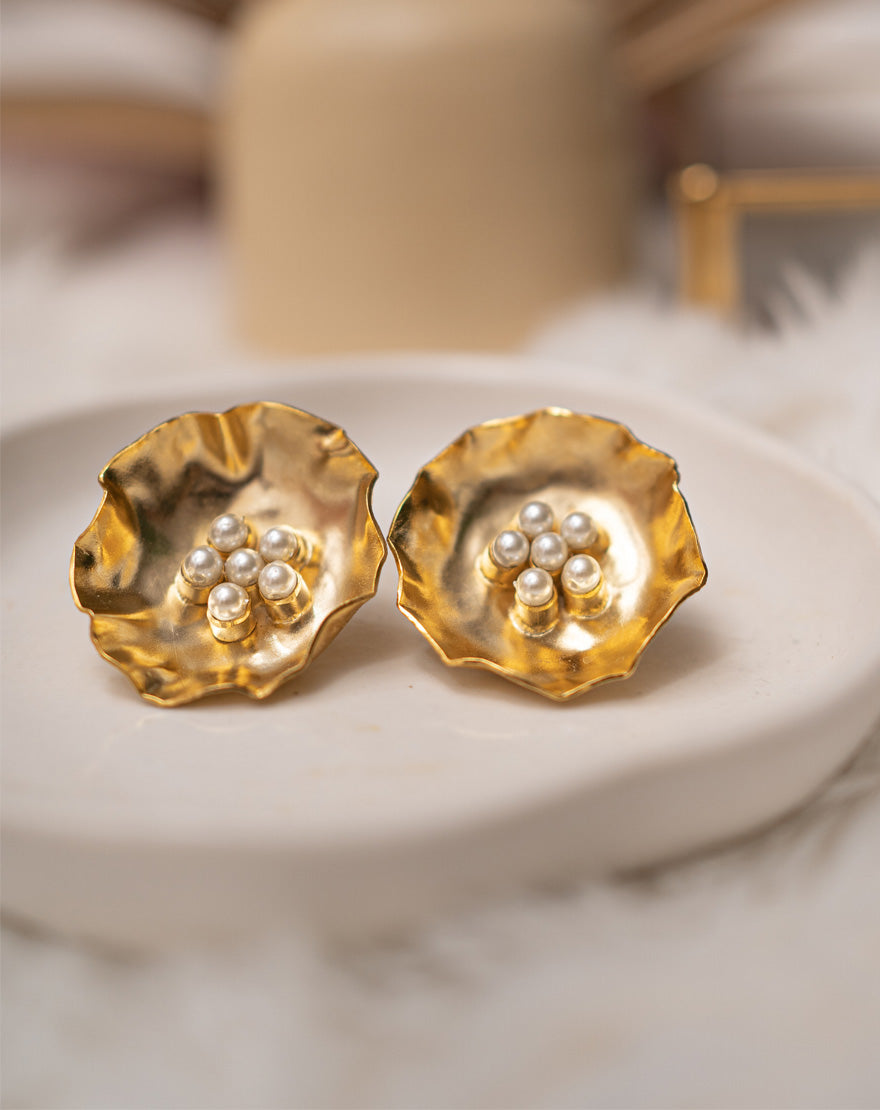 Pearl Flora Studs are handmade earrings created using recycled brass dipped in 18k gold with a floral structure and pearl detailing. These featherlight yet statement making earrings will look great with all monochrome outfits.