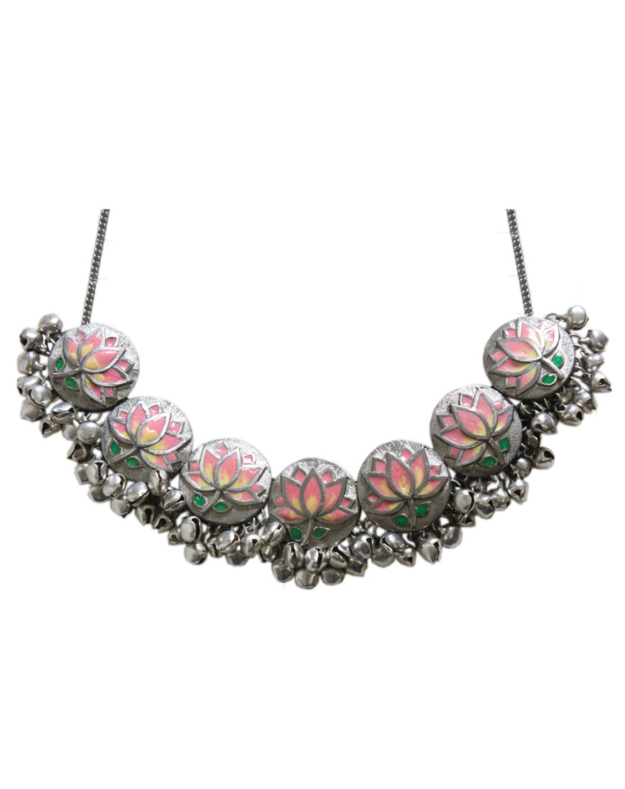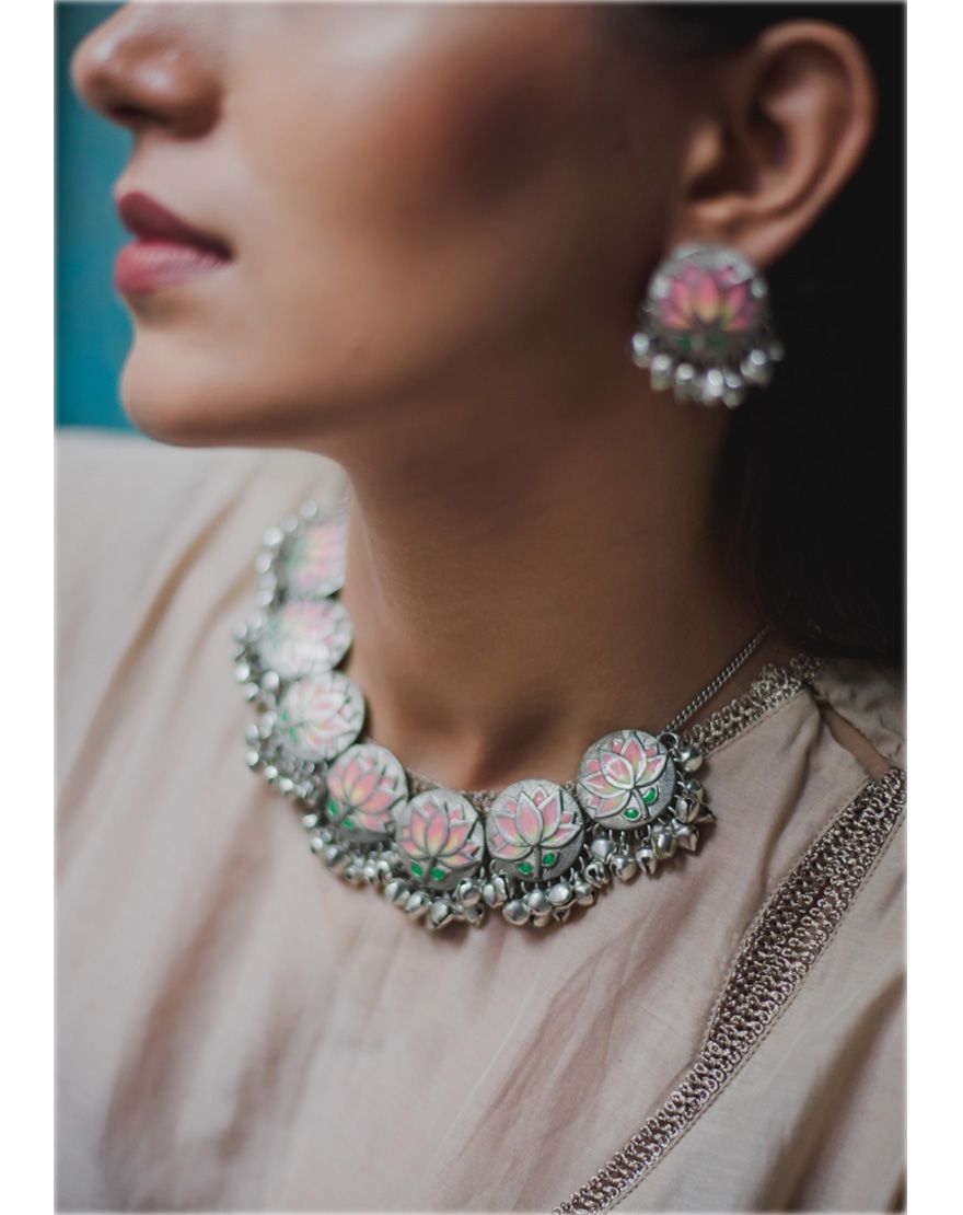 Pink Silver Lotus Necklace : Handcrafted silver necklace inspired from “Pichwai” motifs with hand painted enamel.