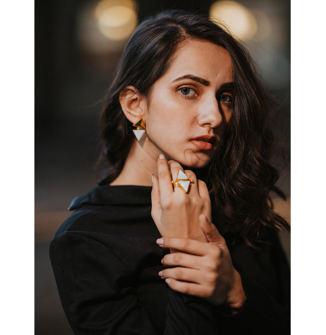 Pyramid Mismatched Earrings – Handcrafted day ty earrings made using mother of pearl triangle shell and a gold 3D pyramid. Perfect for any casual look