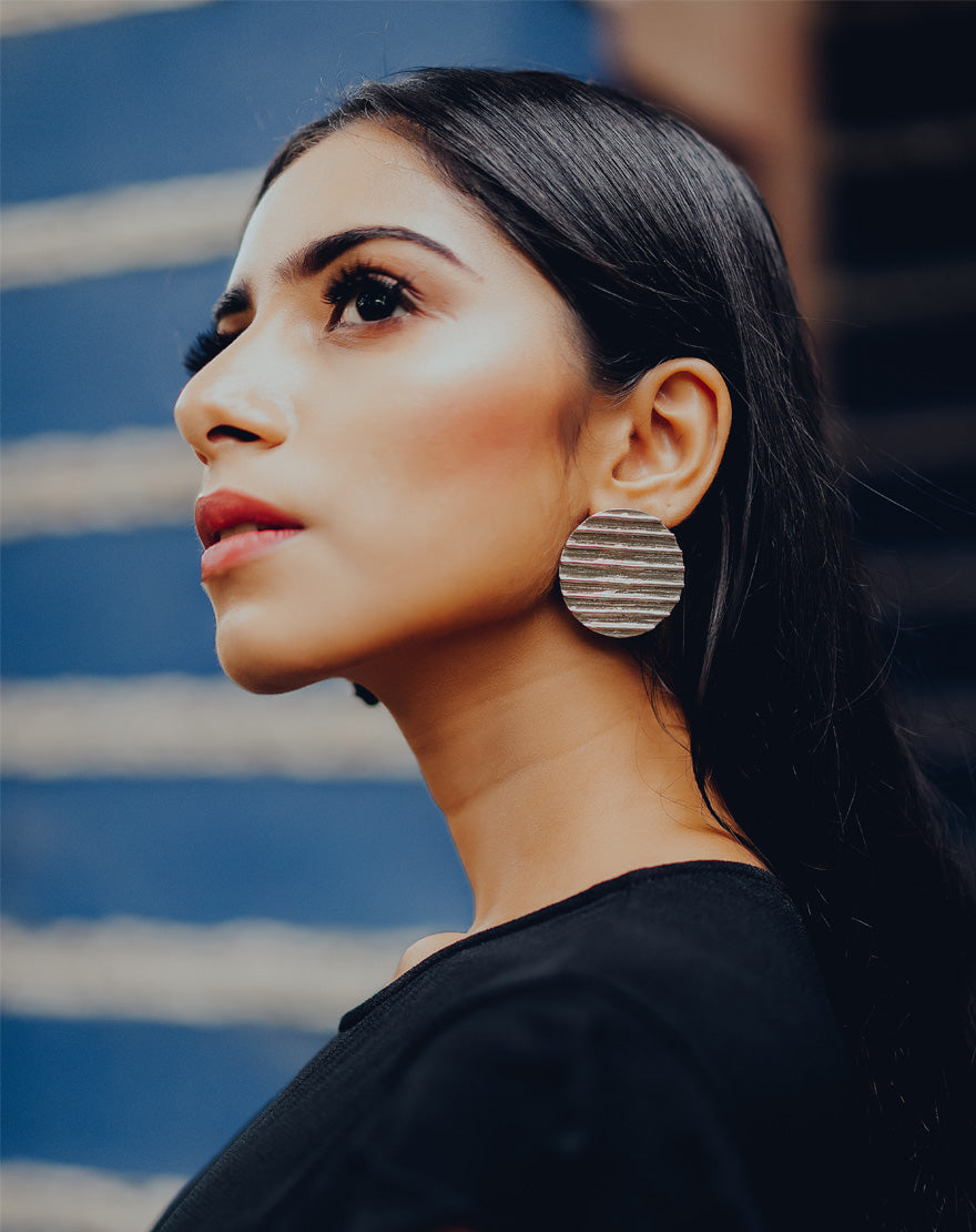 Raw Circle Studs (Silver) : Handcrafted statement with linear texture on silver plated brass giving it a bold and raw look