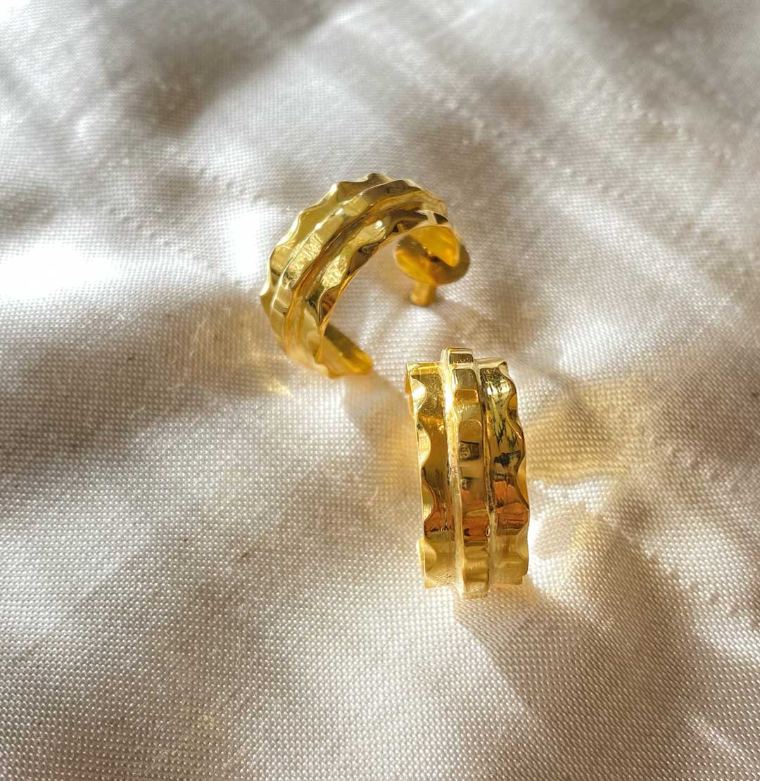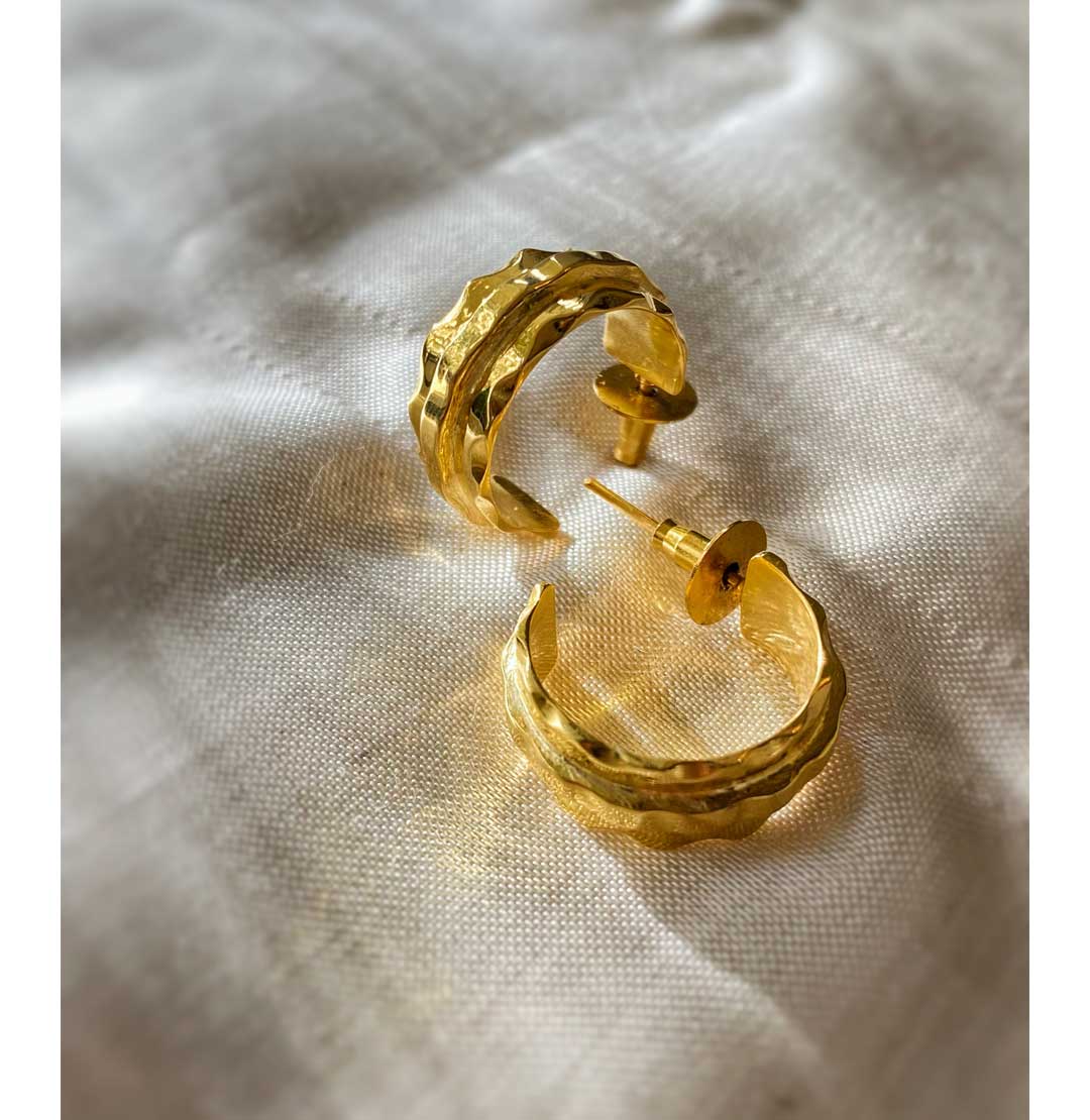 Ripple Gold Hoops Big – These handmade ripple hoops are crafted using 22k gold plated brass with a hand done texture that curls and flows, like ripples on water.