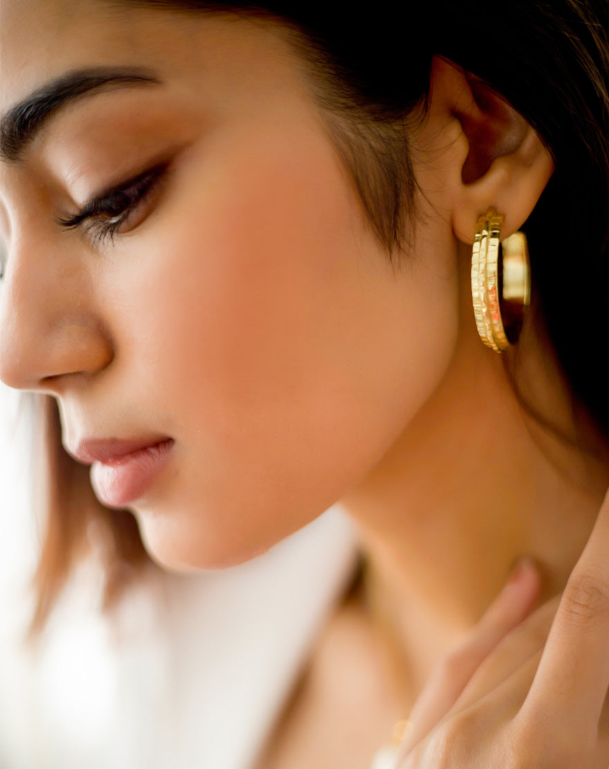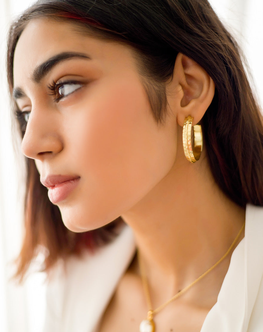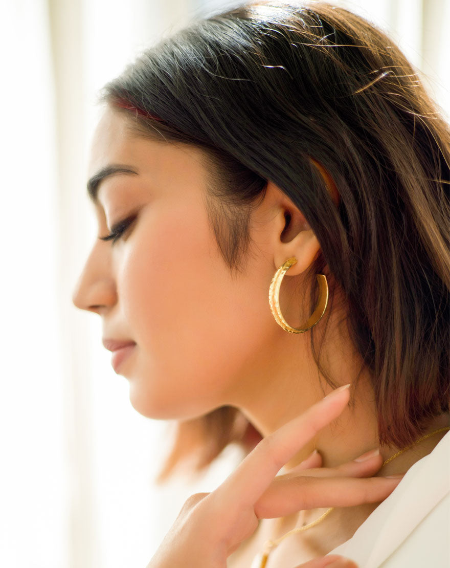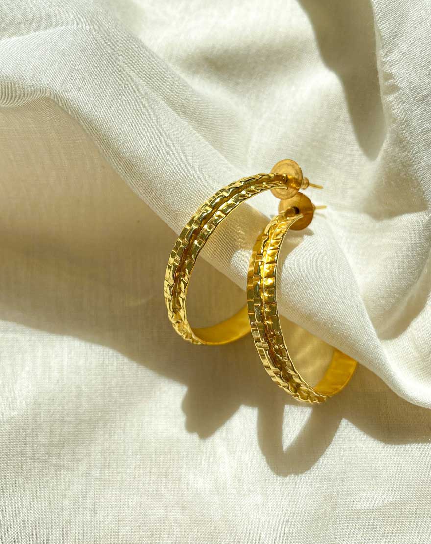 Ripple Gold Hoops Big – These handmade ripple hoops are crafted using 22k gold plated brass with a hand done texture that curls and flows, like ripples on water.