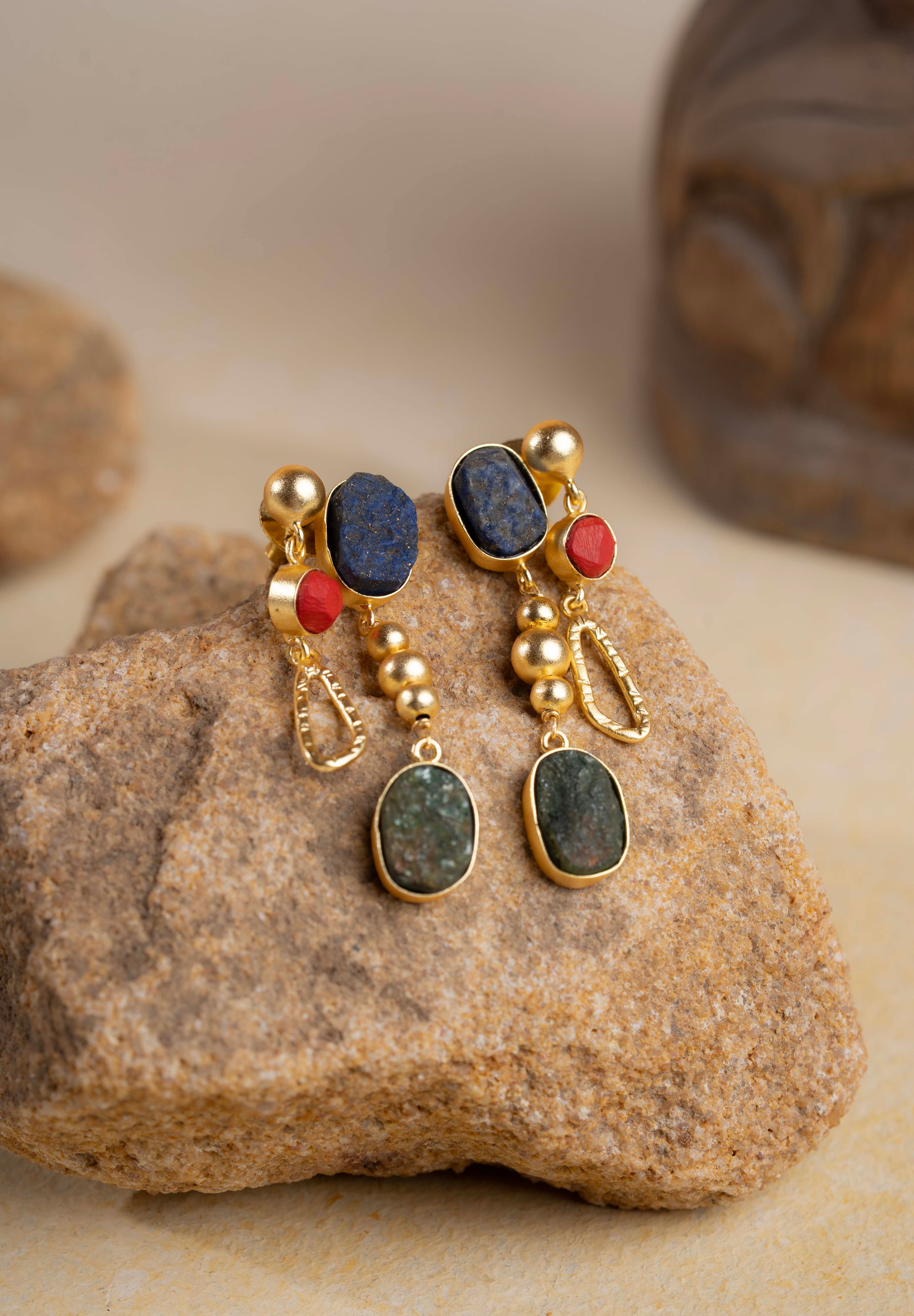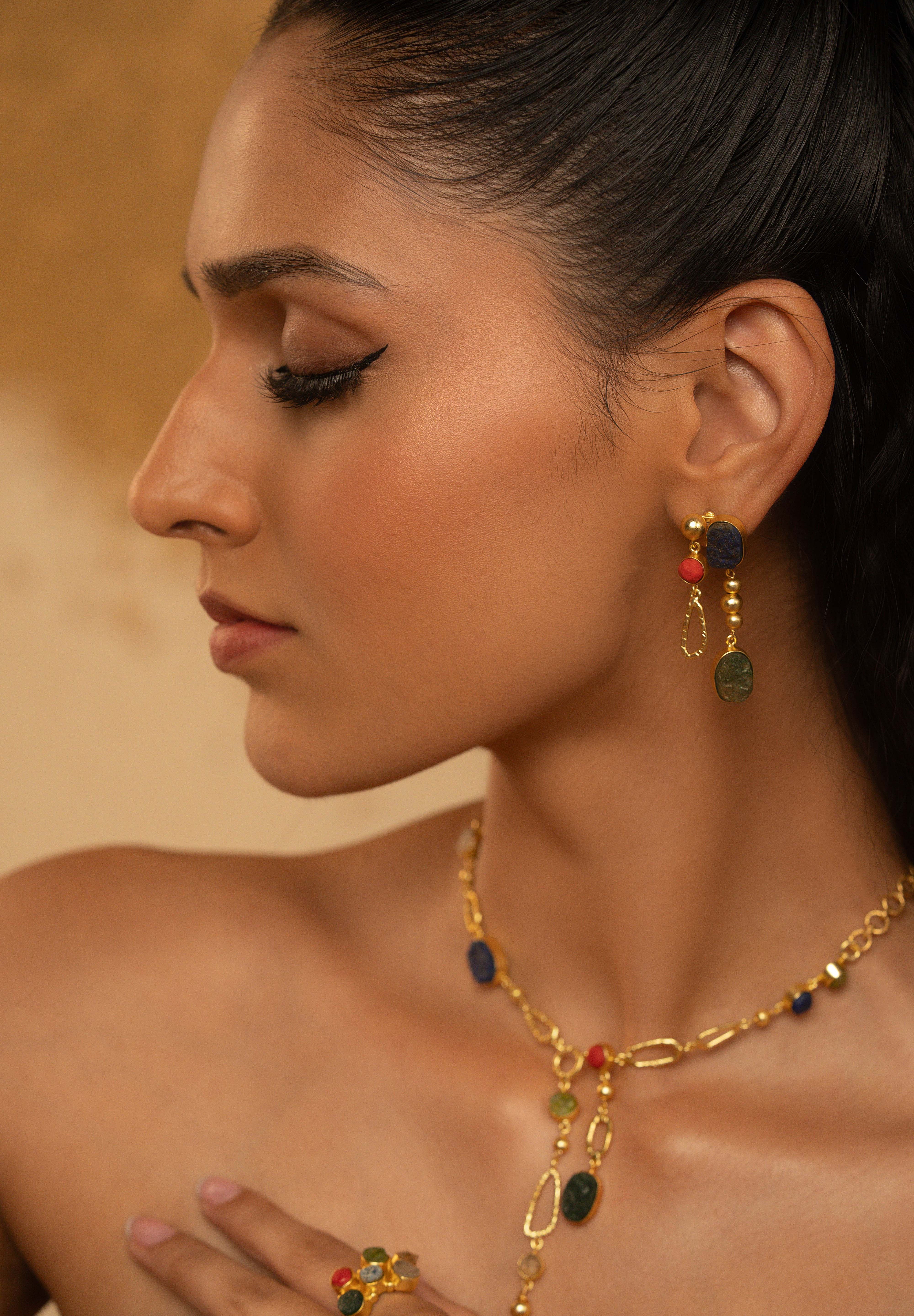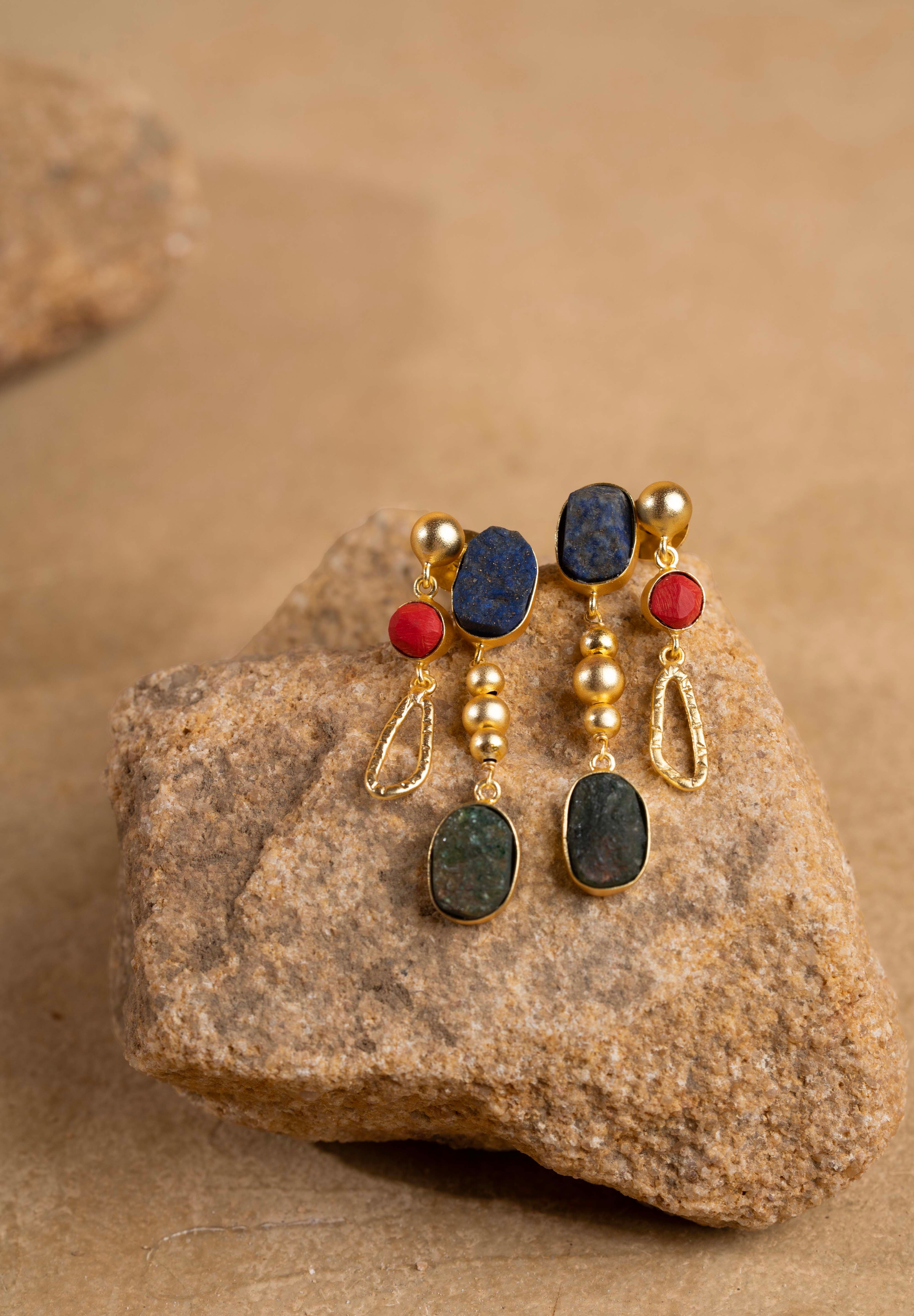 Vivid and architectural, the Saara Earrings draw inspiration from the color harmony of Egyptian artistry. Handcrafted in 16K gold-plated recycled brass with a satin matte finish and anti-tarnish coating, each pair features a medley of natural gemstones — lapis lazuli, coral, peridot, citrine, crystal, and green onyx — framed in uneven, hand-textured brass forms. Finished with sterling silver posts for comfort and durability, they are statement-makers that balance color, texture, and timeless design.