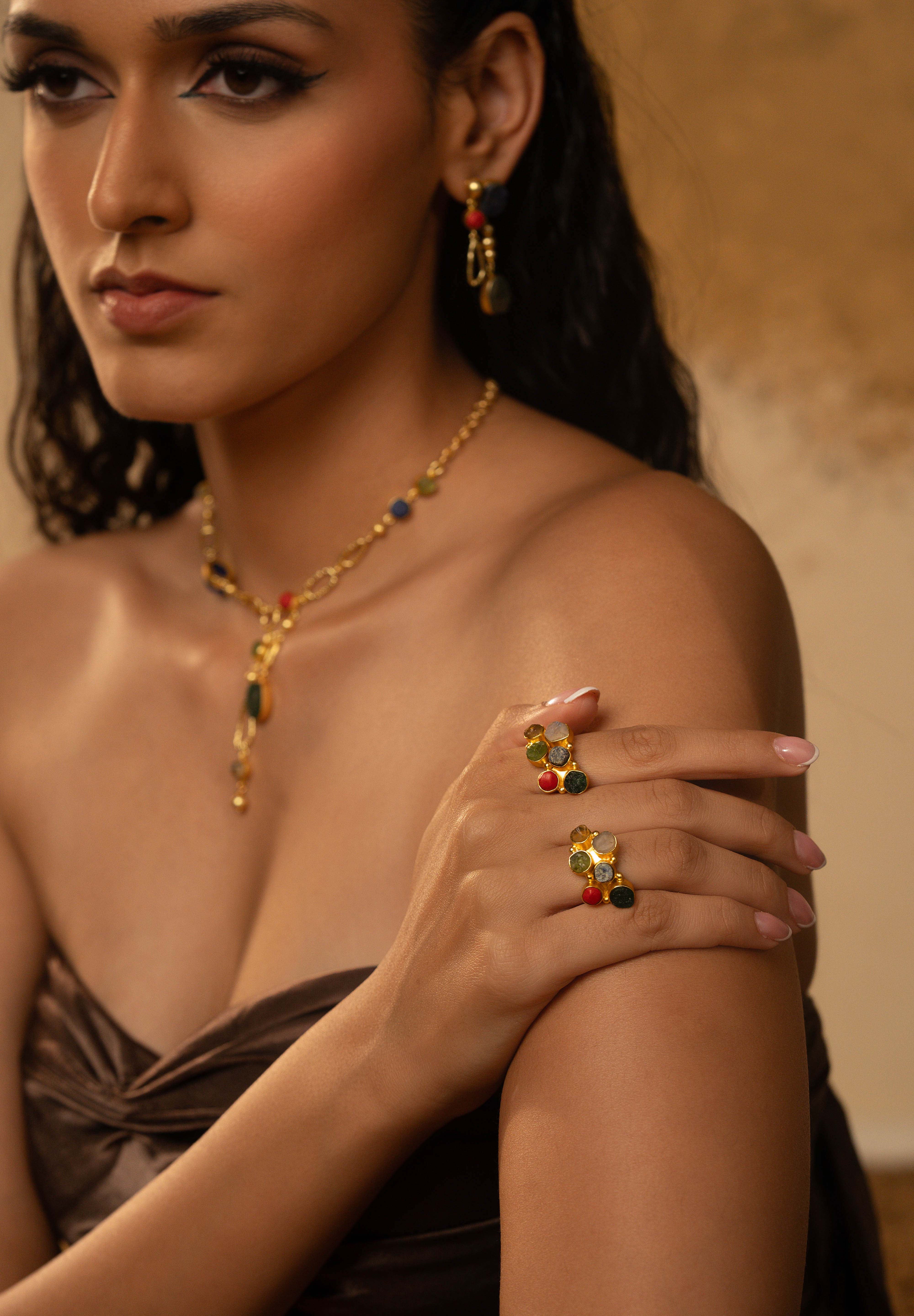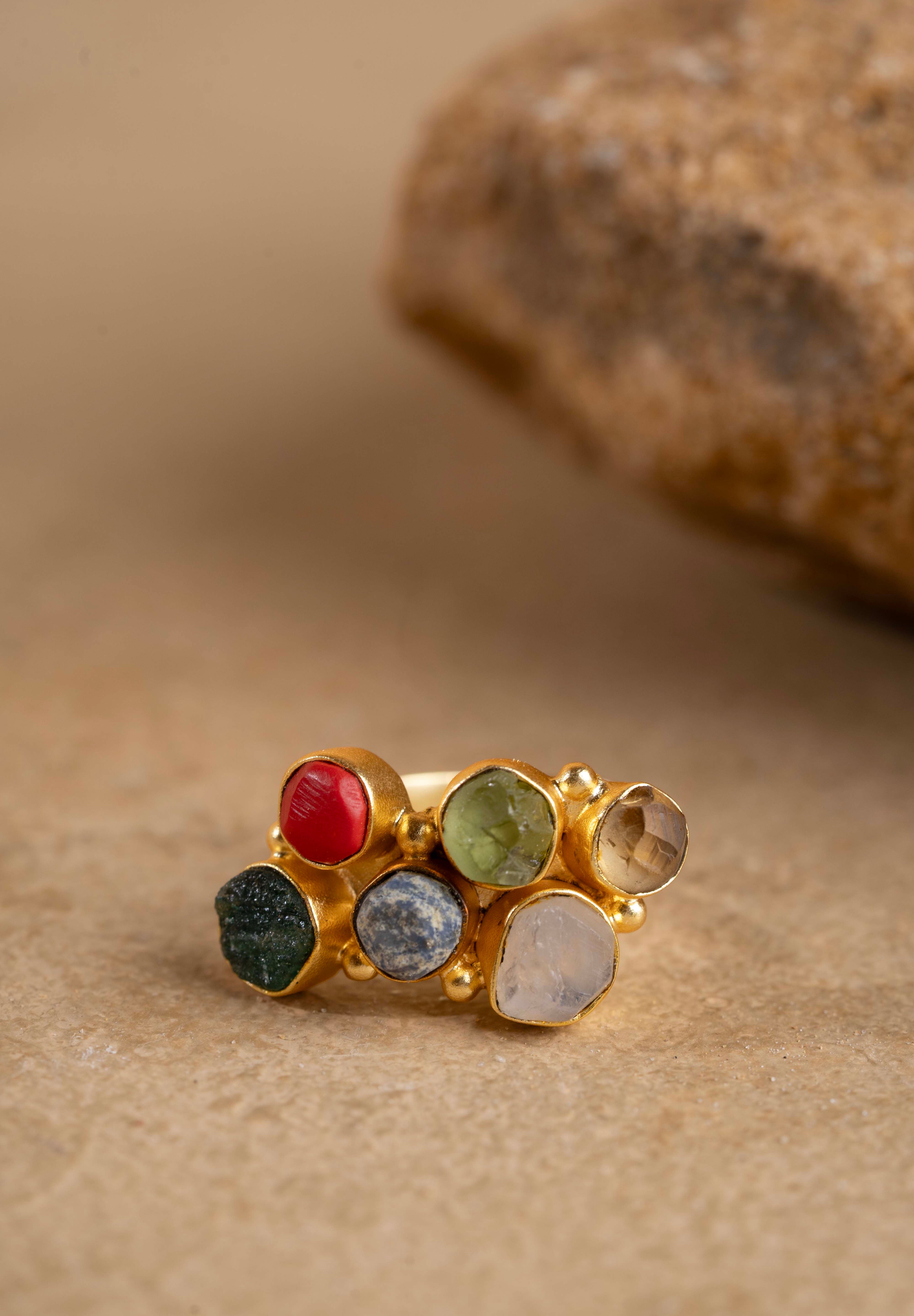 A kaleidoscope of color and craftsmanship, the Saara Ring brings together a cluster of natural gemstones — lapis lazuli, coral, peridot, citrine, crystal, and green onyx — accentuated with delicate gold bead detailing. Handcrafted in 16K gold-plated recycled brass with a satin matte finish and anti-tarnish coating, it features an adjustable band for a comfortable fit. A modern statement inspired by the vibrant palettes of Egyptian art and ornamentation.