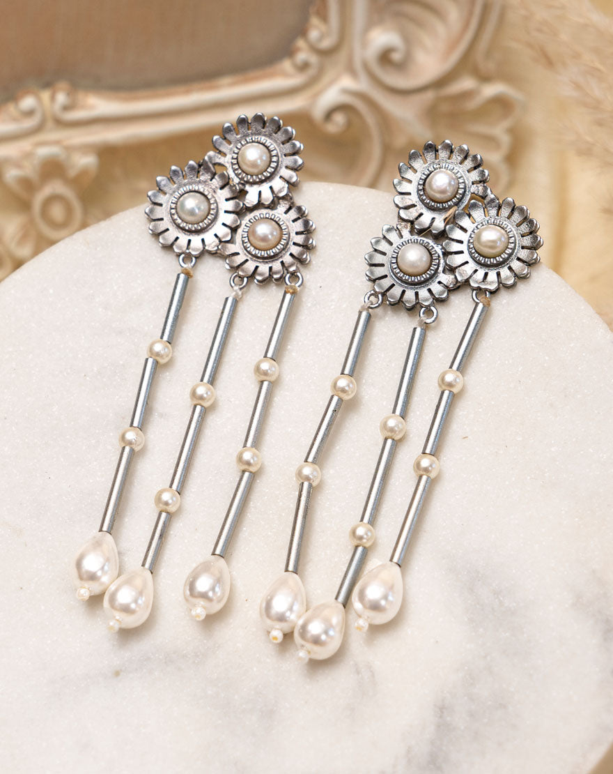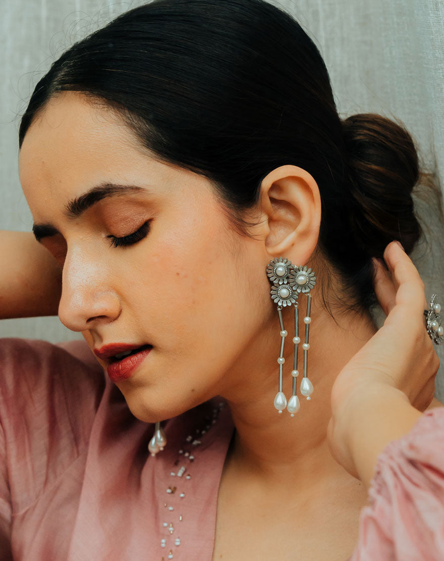 Seher Earrings are beautifully handcrafted using silver plated brass and different shapes of fresh water pearls. With stunning waterfall tassels these earrings gives drama to your look. Pair it with western or Indian outfits, these earrings will go anything and everything.
