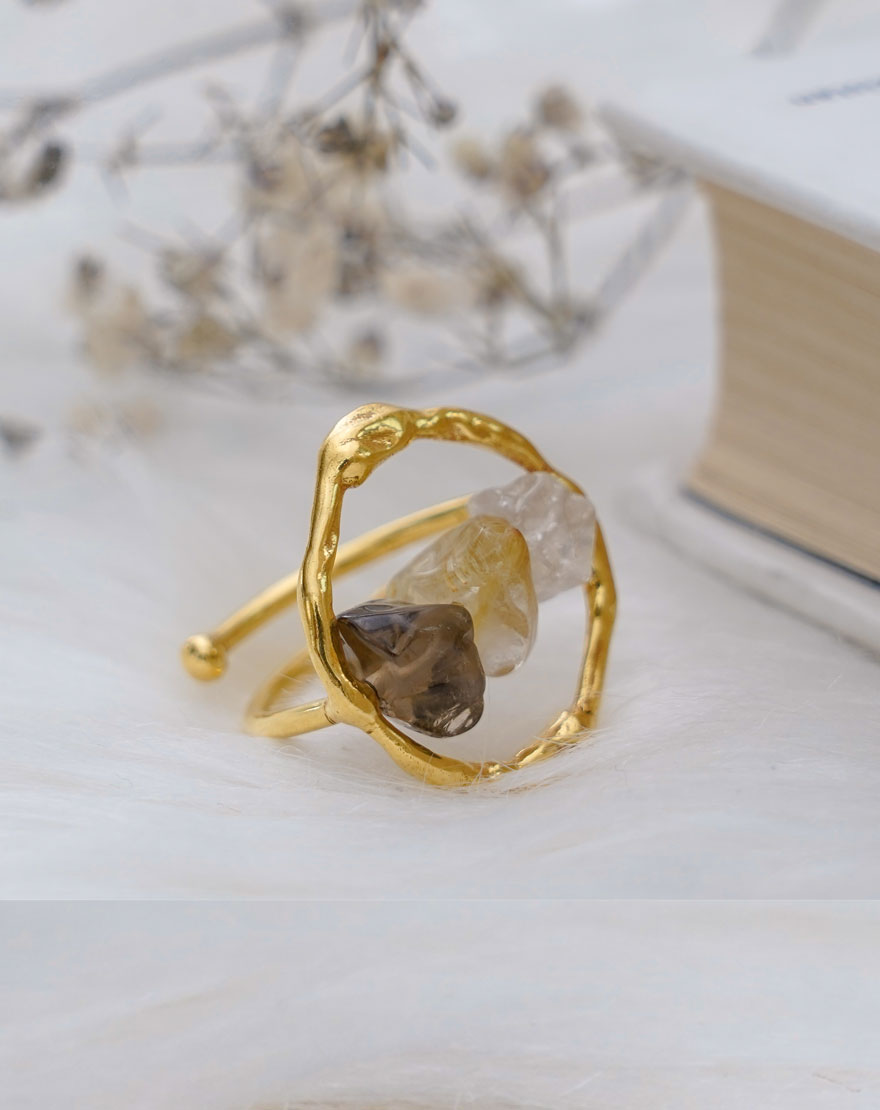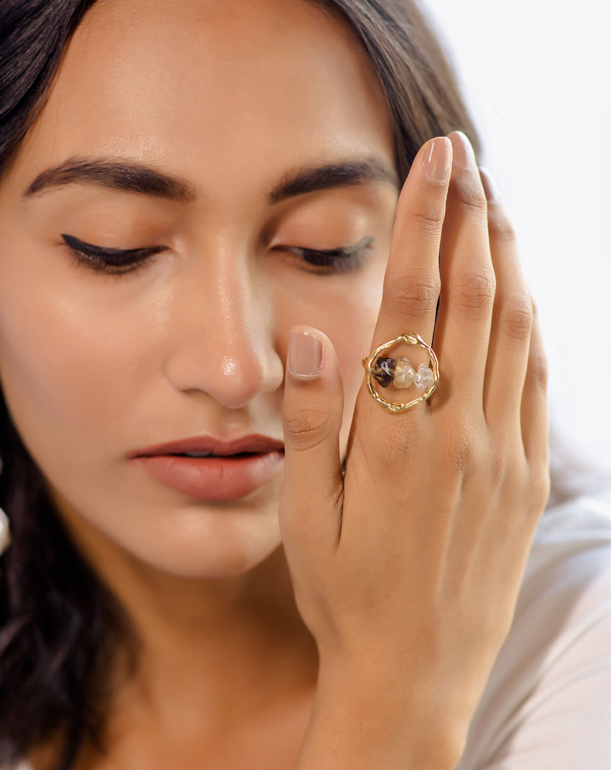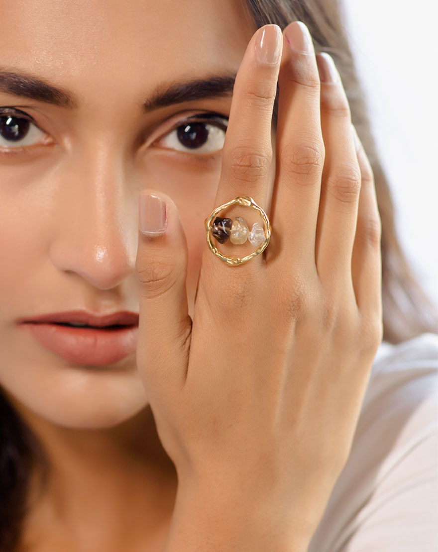 Sierra Ring is a stunning statement making piece of statement jewelry, handcrafted using different shades of smokey quartz on gold plated recycled brass.