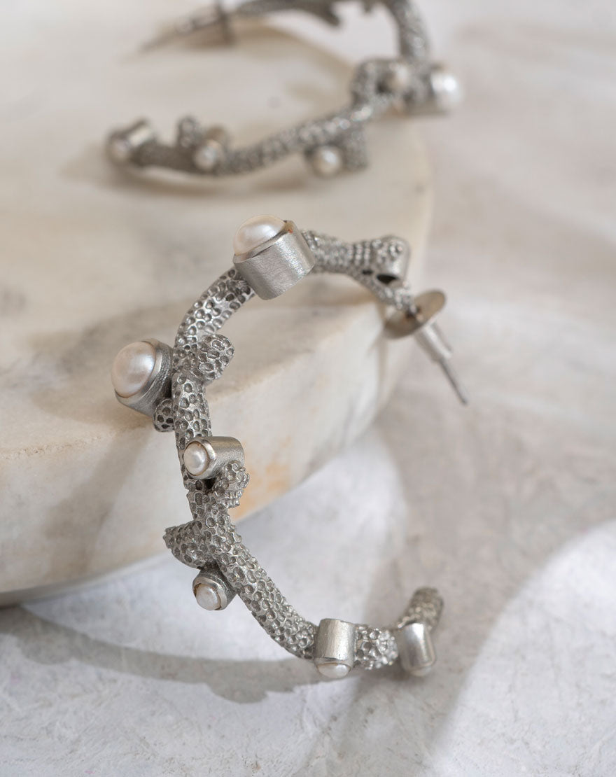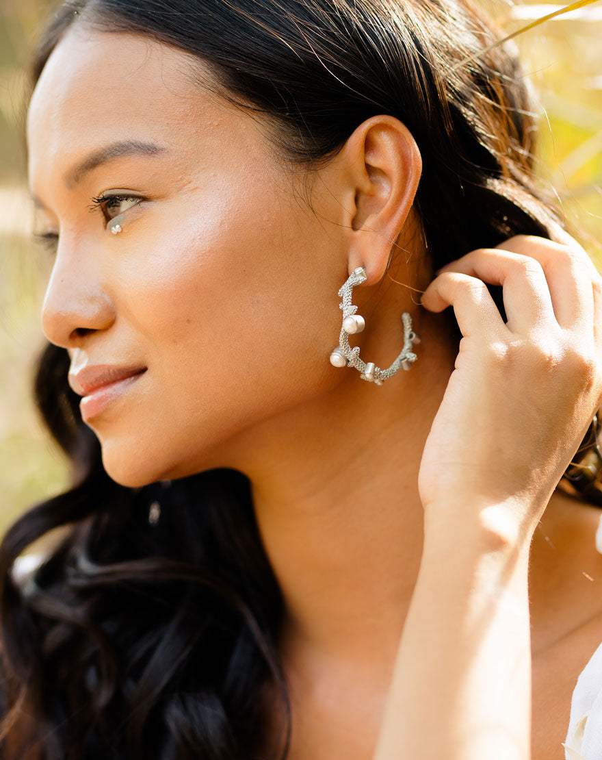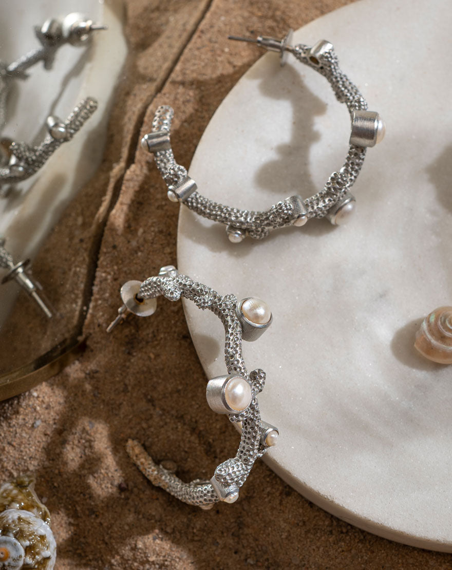 These stunning and statement making hoops are inspired from corals found in the waters of Maui Hawaii. These hoops are handcrafted using silver plated brass with fresh water pearls. The detailing on these earrings are very similar to the corals found in the sea.