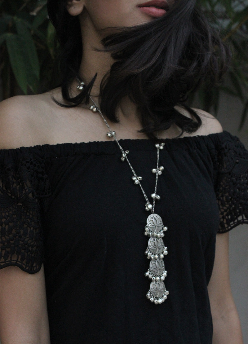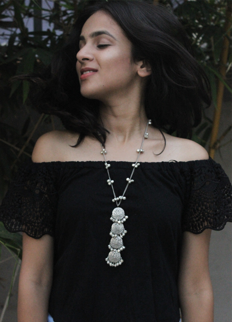 Silver Lotus Long Necklace : Statement making necklace handcrafted using silver plated metal and ghunghroos.