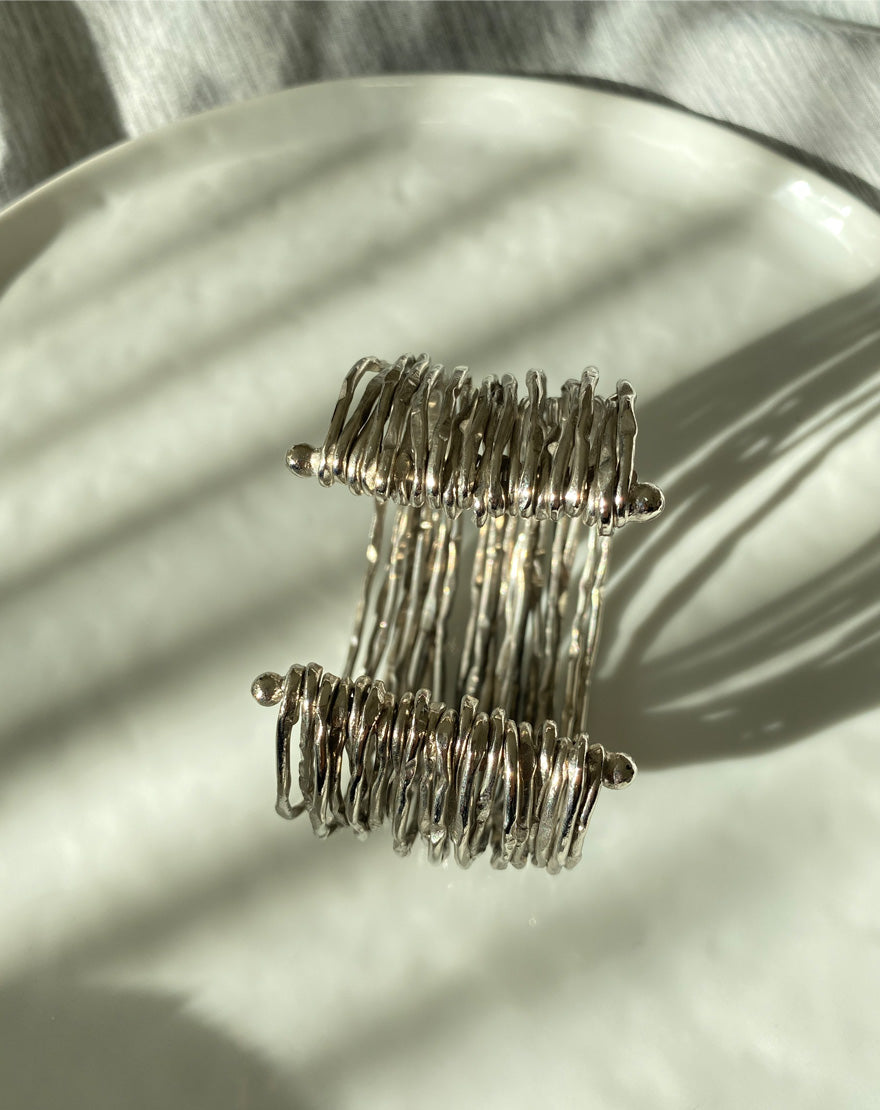 This stunning statement making cuff bracelet is handcrafted using silver plated recycled brass. Each and every wire of the cuff has a beautiful texture which is completely hand done. This cuff will elevate your look completely and is super versatile.
