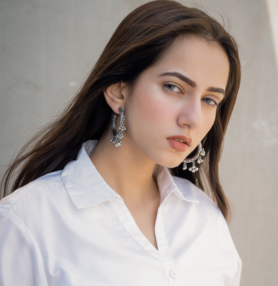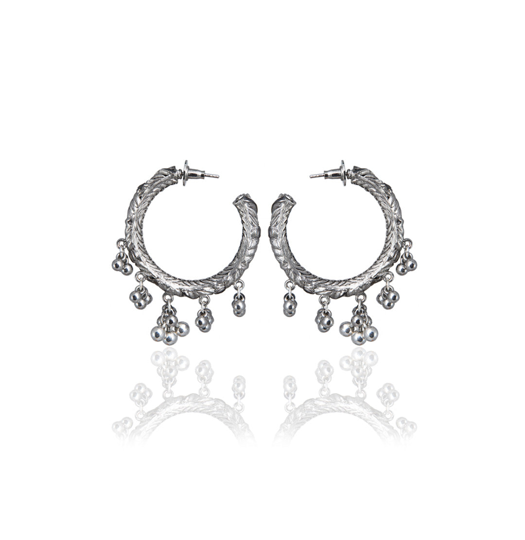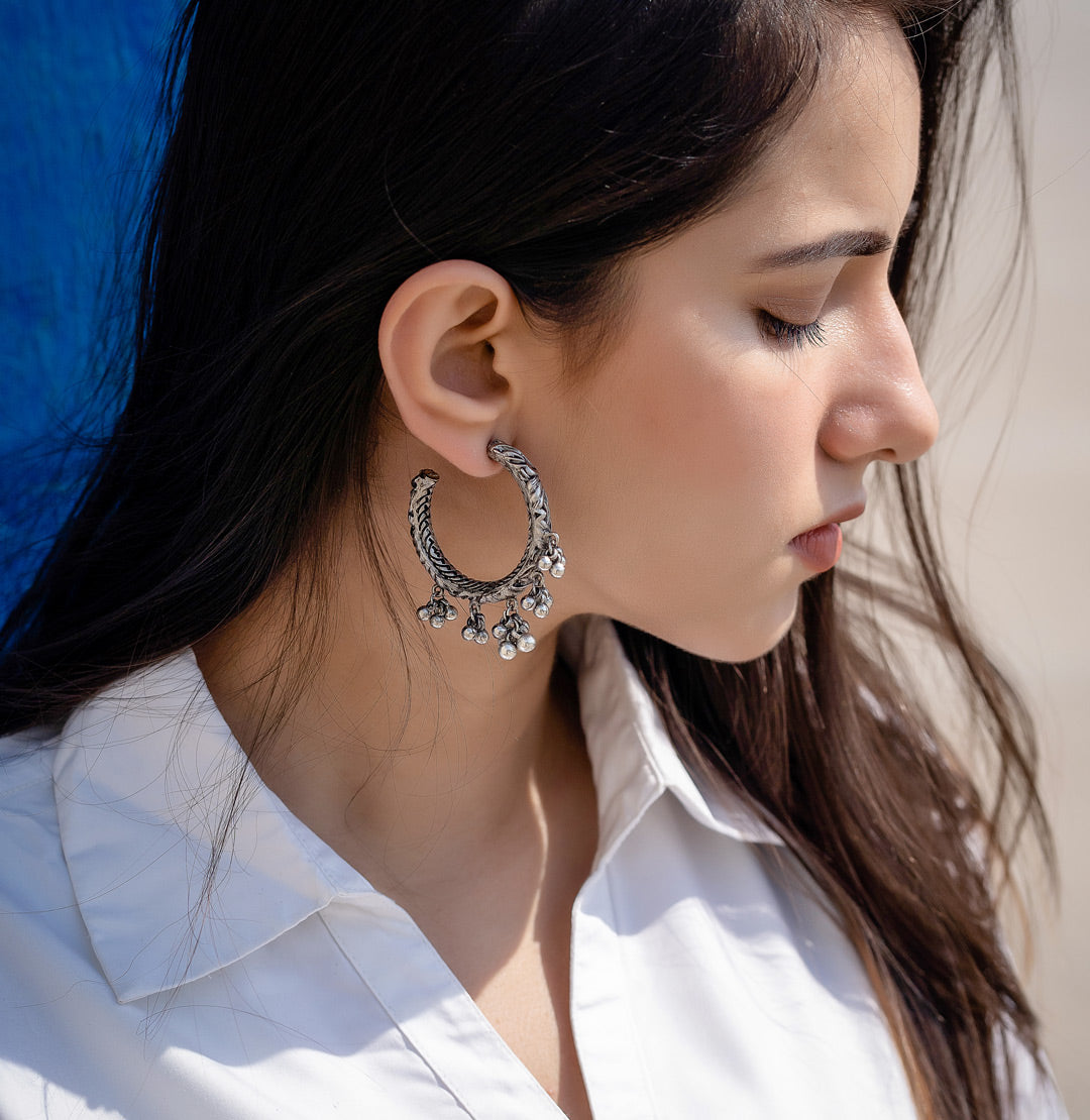 Silver Traditional Hoops (small) : Reviving the old traditional form of tribal jewelry, handcrafted silver plated hoops with Indian motifs carving and ghunghroos. Statement making hoops for all looks