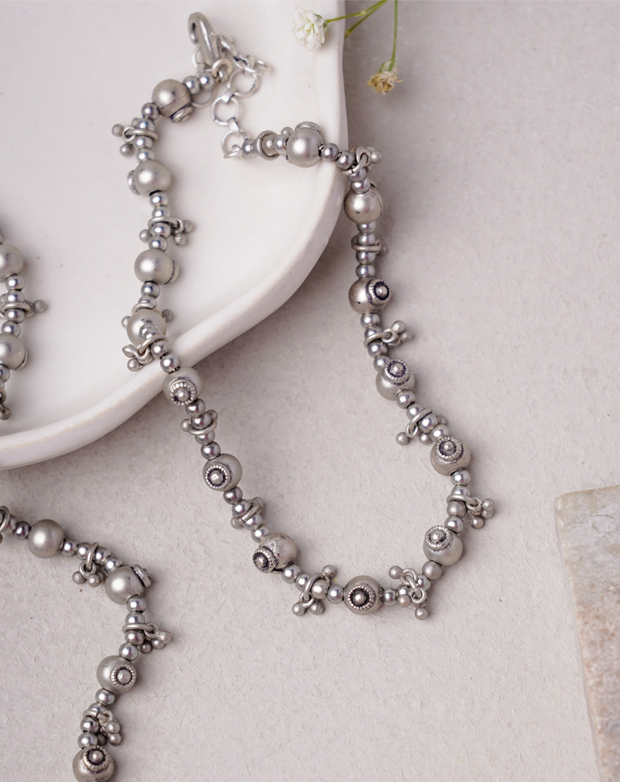 Redefining the classic silver payal, This set of 2 sleek and stunning anklets are handcrafted from gunmetal-colored silver-finished brass, and adorned with intricate motifs.