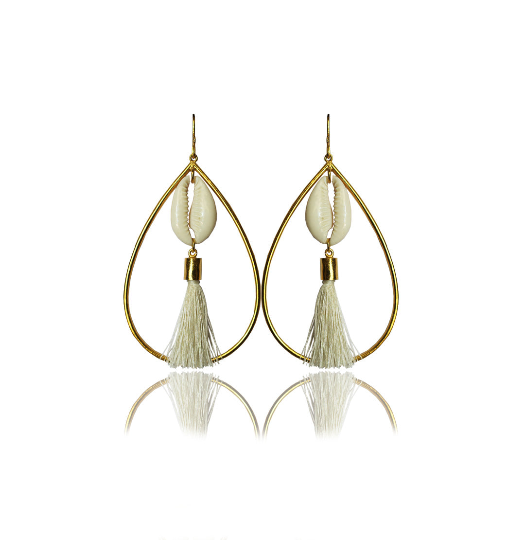 Summer Shell Drop Tassels : Handcrafted summery drop hoops, made using cowrie shells on 1 micron gold plated brass and thread tassels. A perfect breezy pair of hoops for your beach vacation.