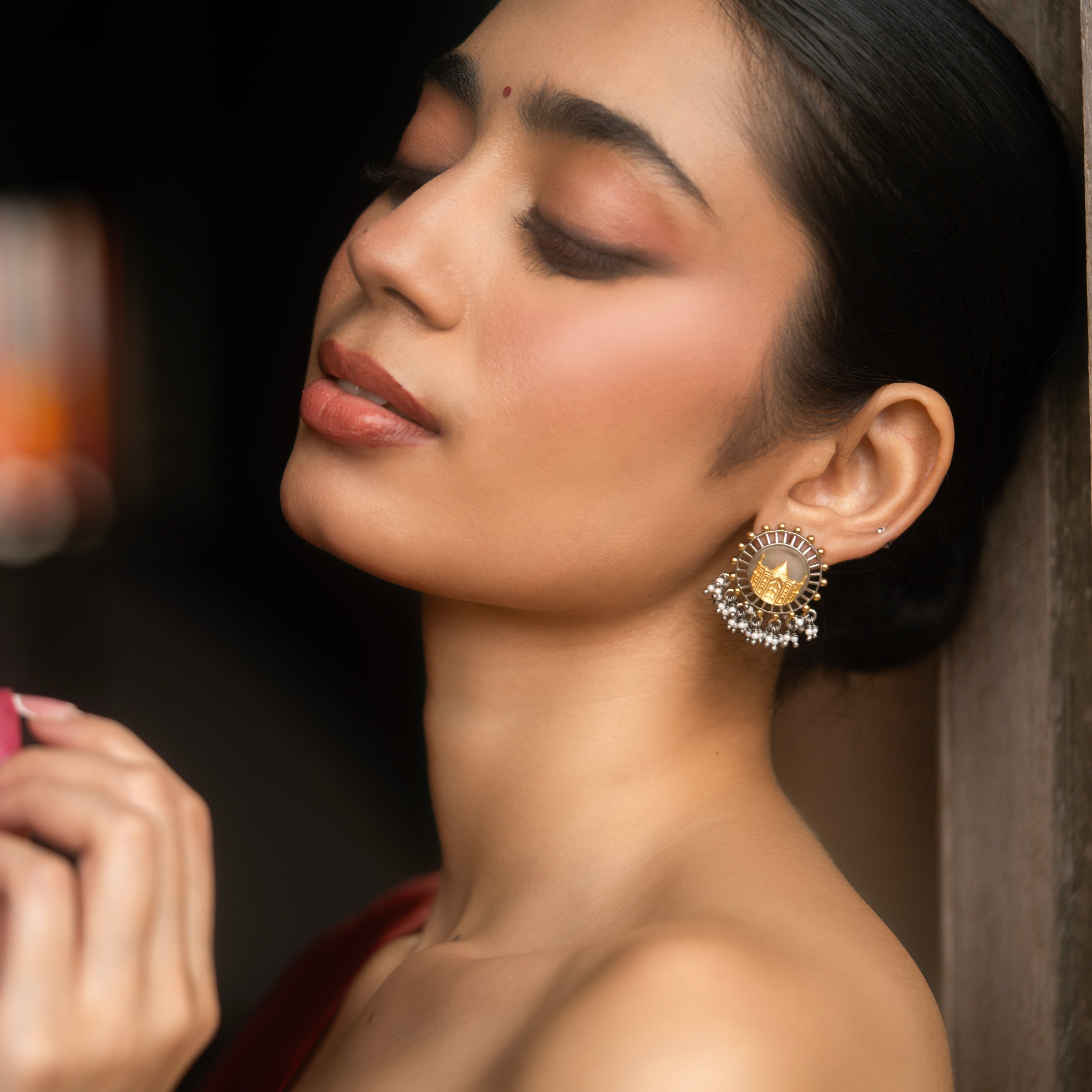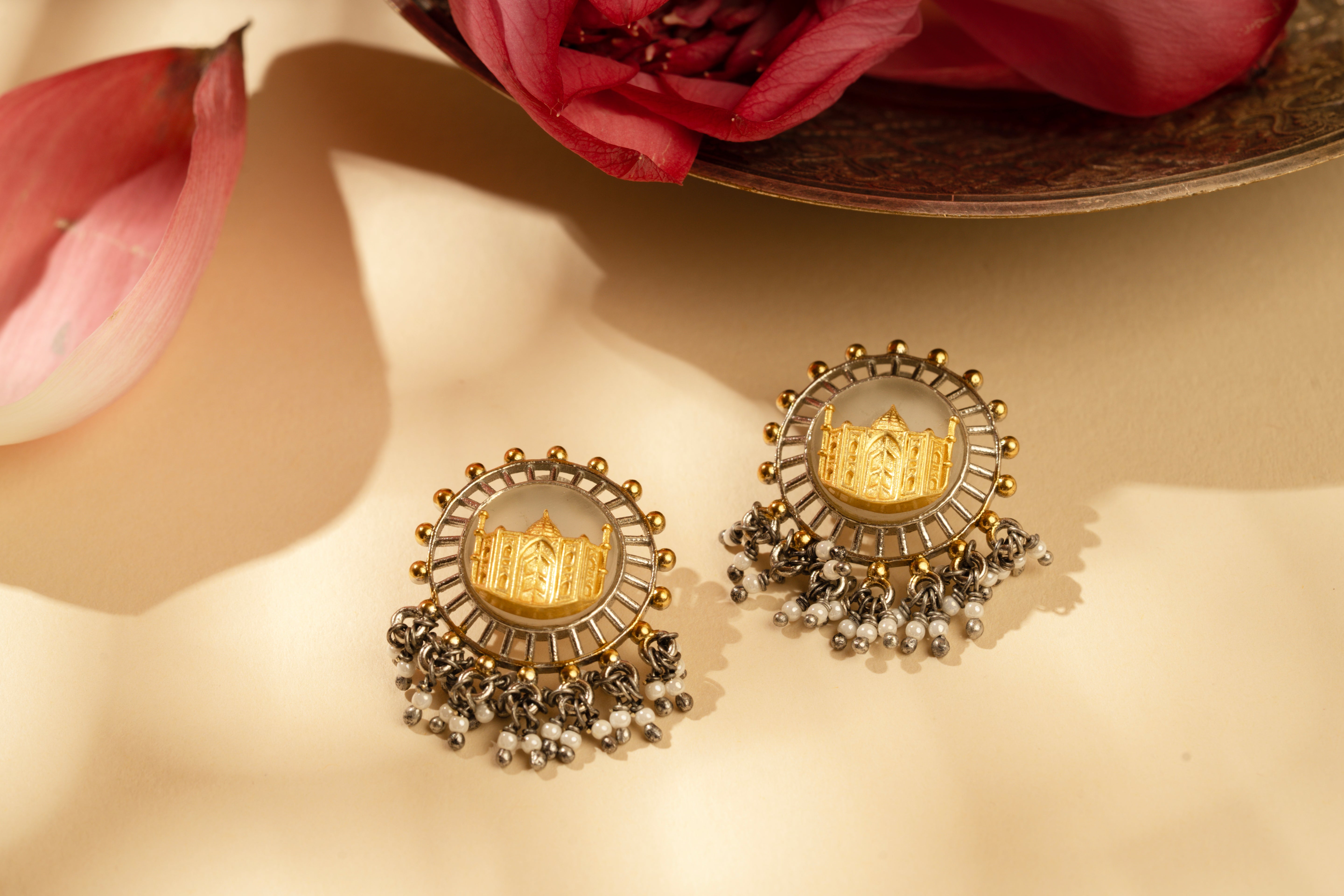 Inspired by the Taj Mahal, the ultimate symbol of love, our handcrafted Taj Earrings feature a detailed motif of the monument, beautifully embedded on a radiant crystal stone. Surrounded by an intricately hand-done filigree frame, these earrings are finished with a unique two-tone plating of gold and silver, a first for us, blending modern elegance with ethnic charm.