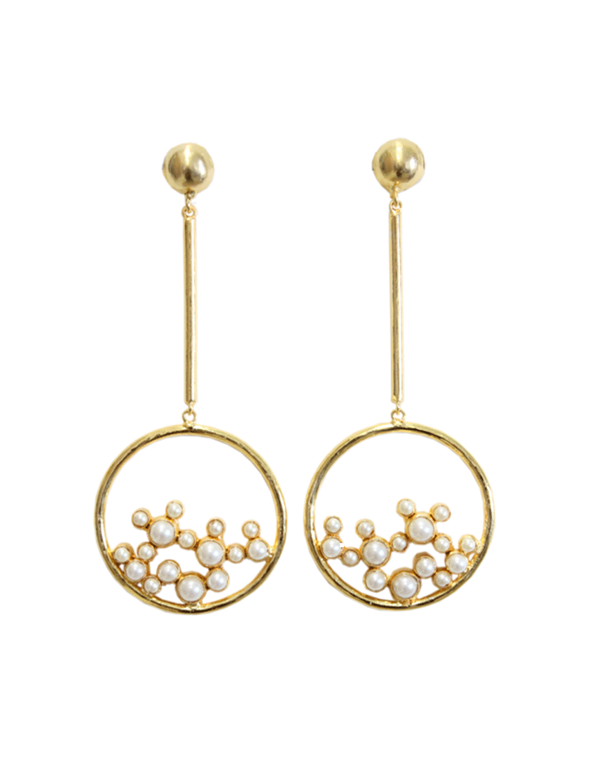 Statement making danglers handcrafted using pearls and fine quality of gold plated brass, giving a very modern yet contemporary look. As they say less is more in style.