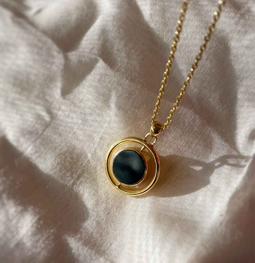 This beautiful turner necklace is a must have for your wardrobe its a 2 in 1 necklace where you can flip the stone according to your mood, we have two stones in the turner necklace white mother of pearl and black onyx.