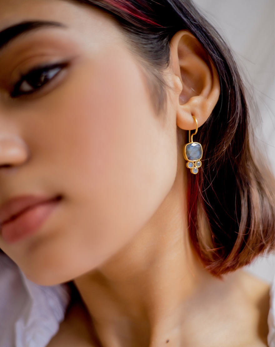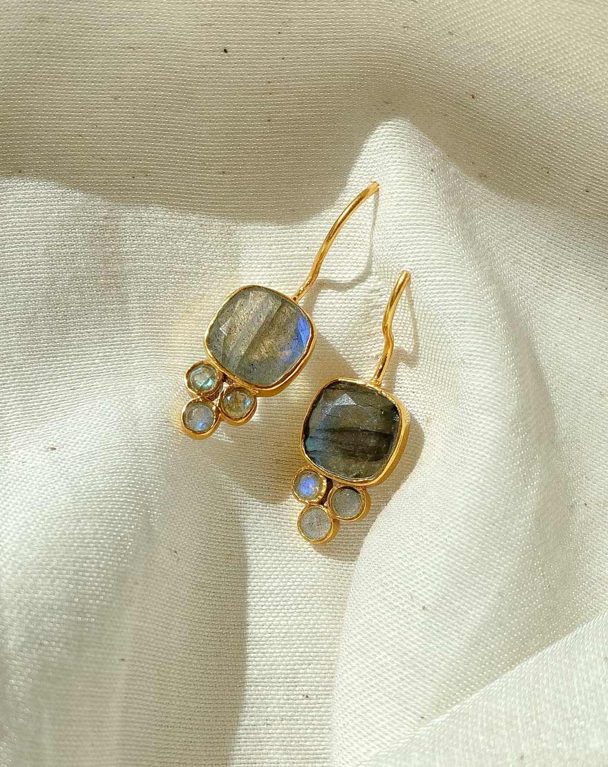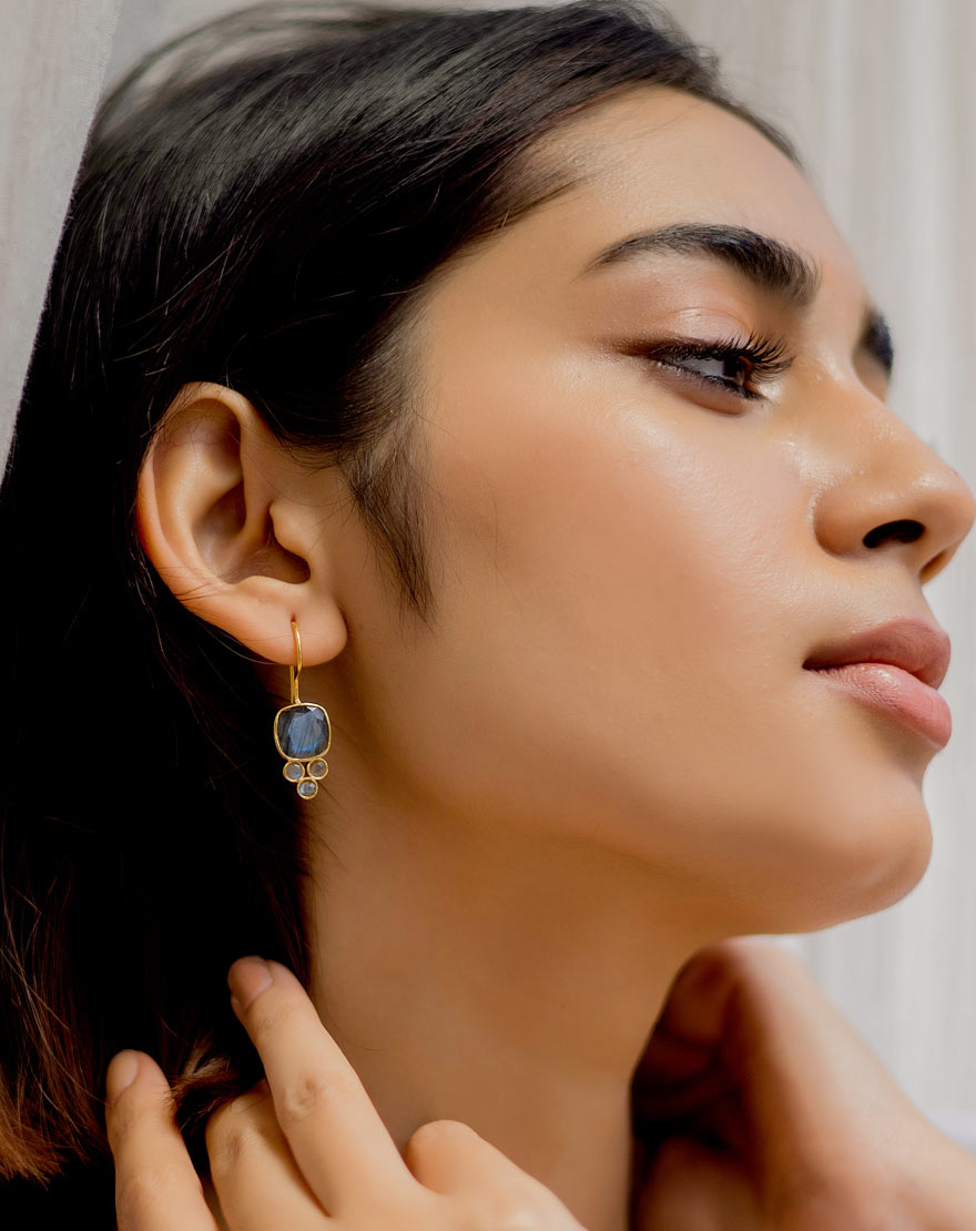 Vivienne Labradorite Earrings – Vivienne means life. A beautiful handcrafted pair of earrings made using handpicked Labradorite stones sourced from Jaipur which are set in 925 Silver and 18k gold plated. A perfect pair of earrings which are so light in weight yet are statement making.