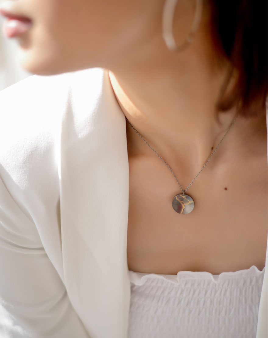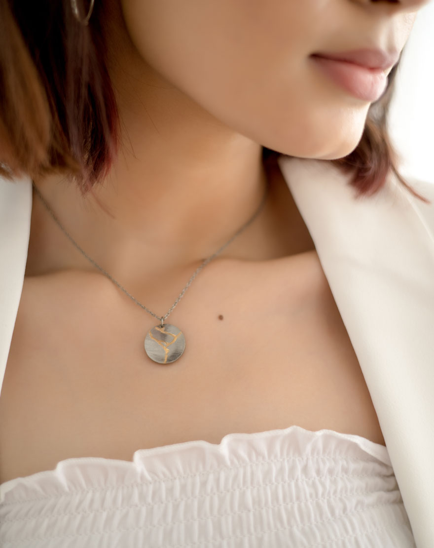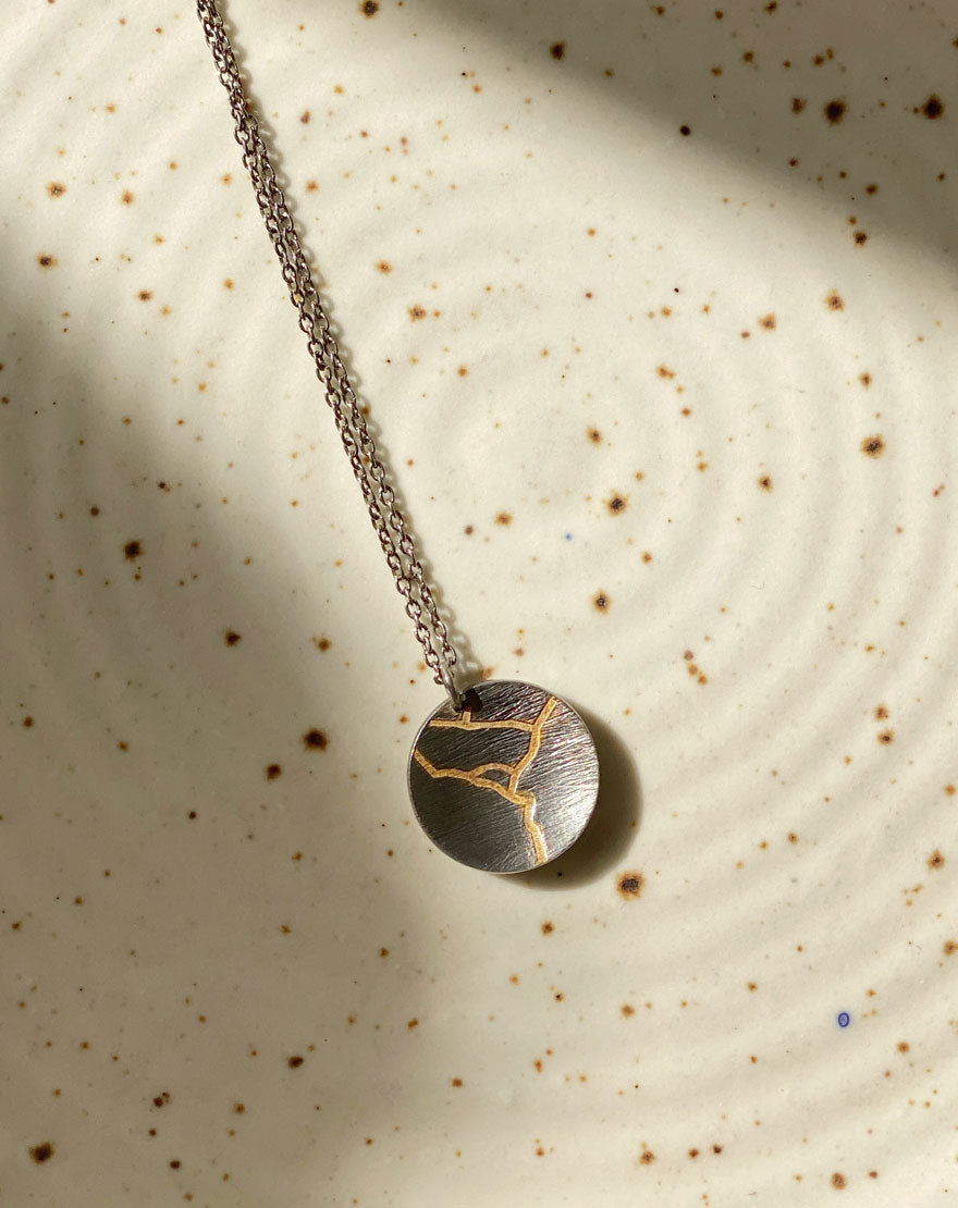 Wabi Sabi Silver Necklace – A handcrafted silver plated brass necklace with a gold enamel filled engraving. It is inspired from Kintsugi – the Japanese Art of putting broken pottery pieces back together with gold. A metaphor for embracing your flaws and imperfections!