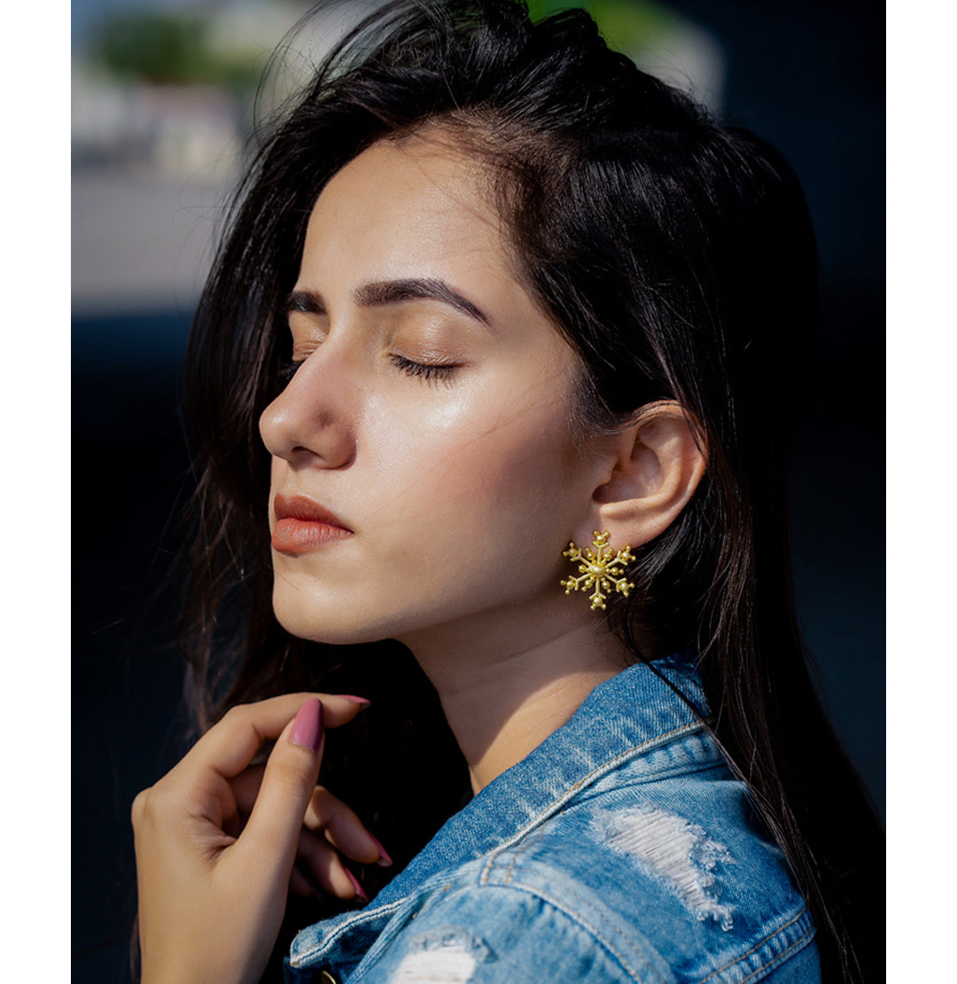 Winter Studs Gold (mini) – Inspired from the famous Game Of Thrones, these handcrafted studs are made using the snowflake silhouette on gold plated brass. Small in size.