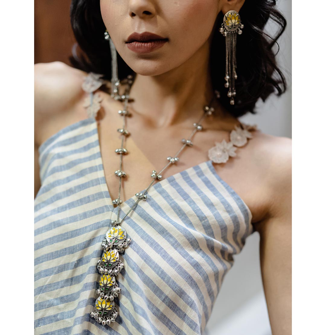 Yellow Lotus Long Necklace : Statement making necklace handcrafted using silver plated metal with hand painted lotus motifs. Ghunghroo Chain is of 24 inches.