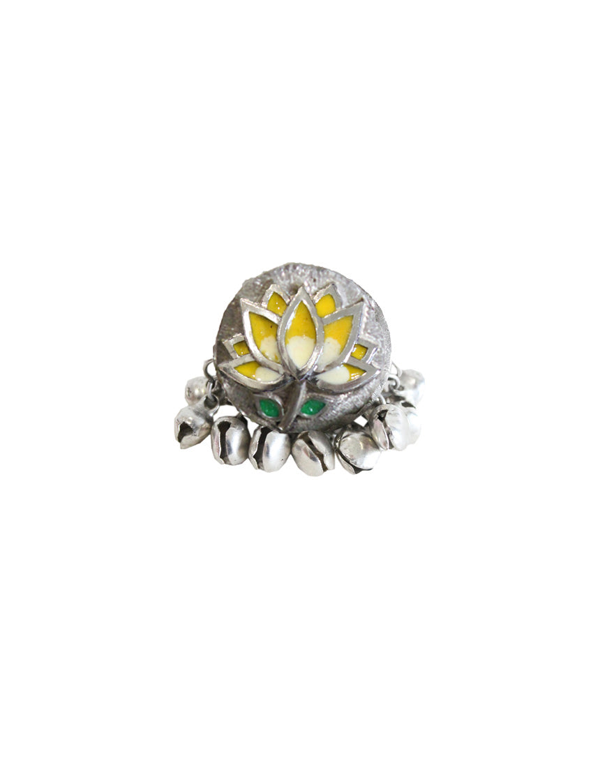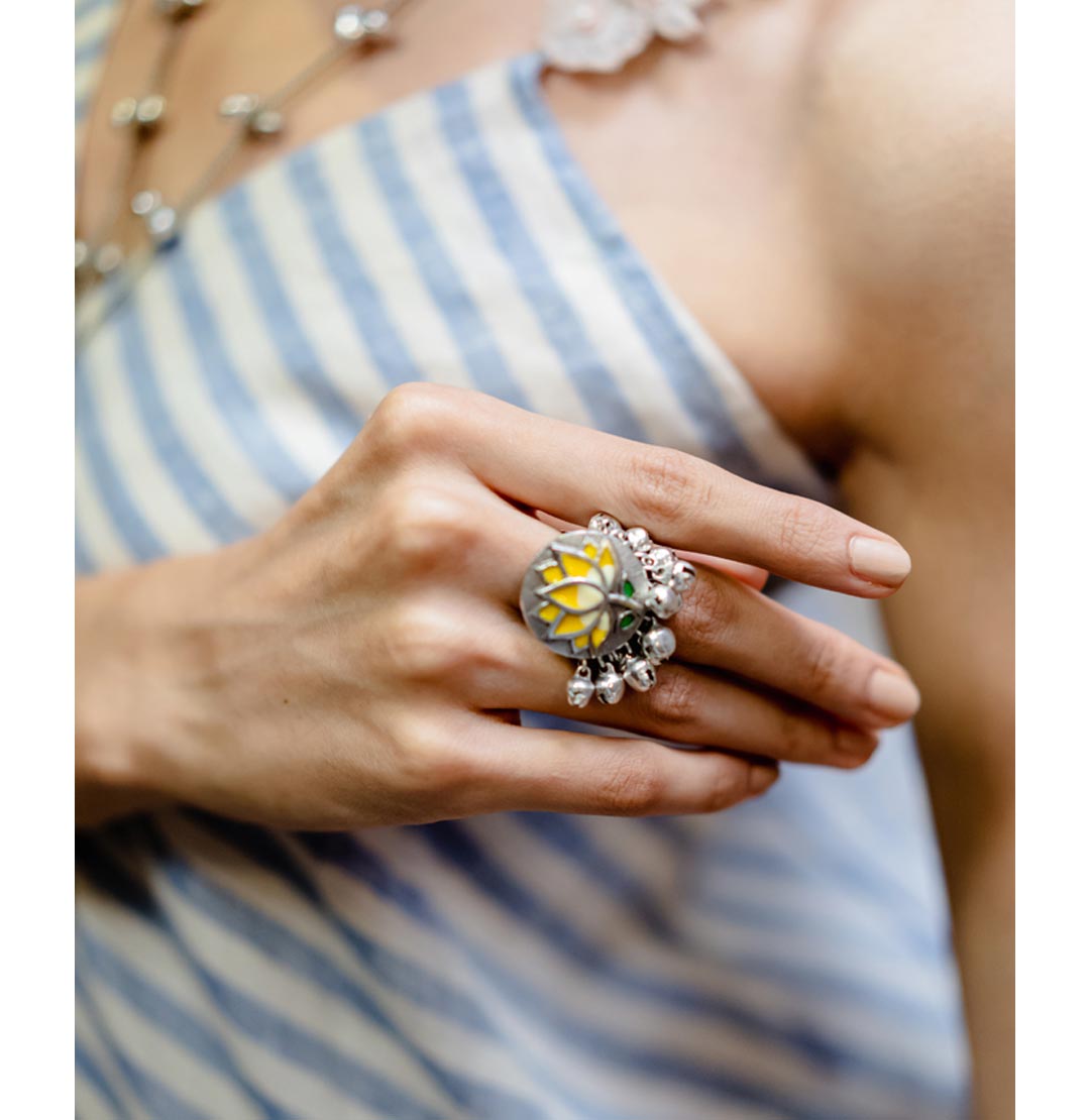 Yellow Lotus Ring : Handcrafted silver ring inspired from “Pichwai” motifs, with hand-painted yellow enamel.