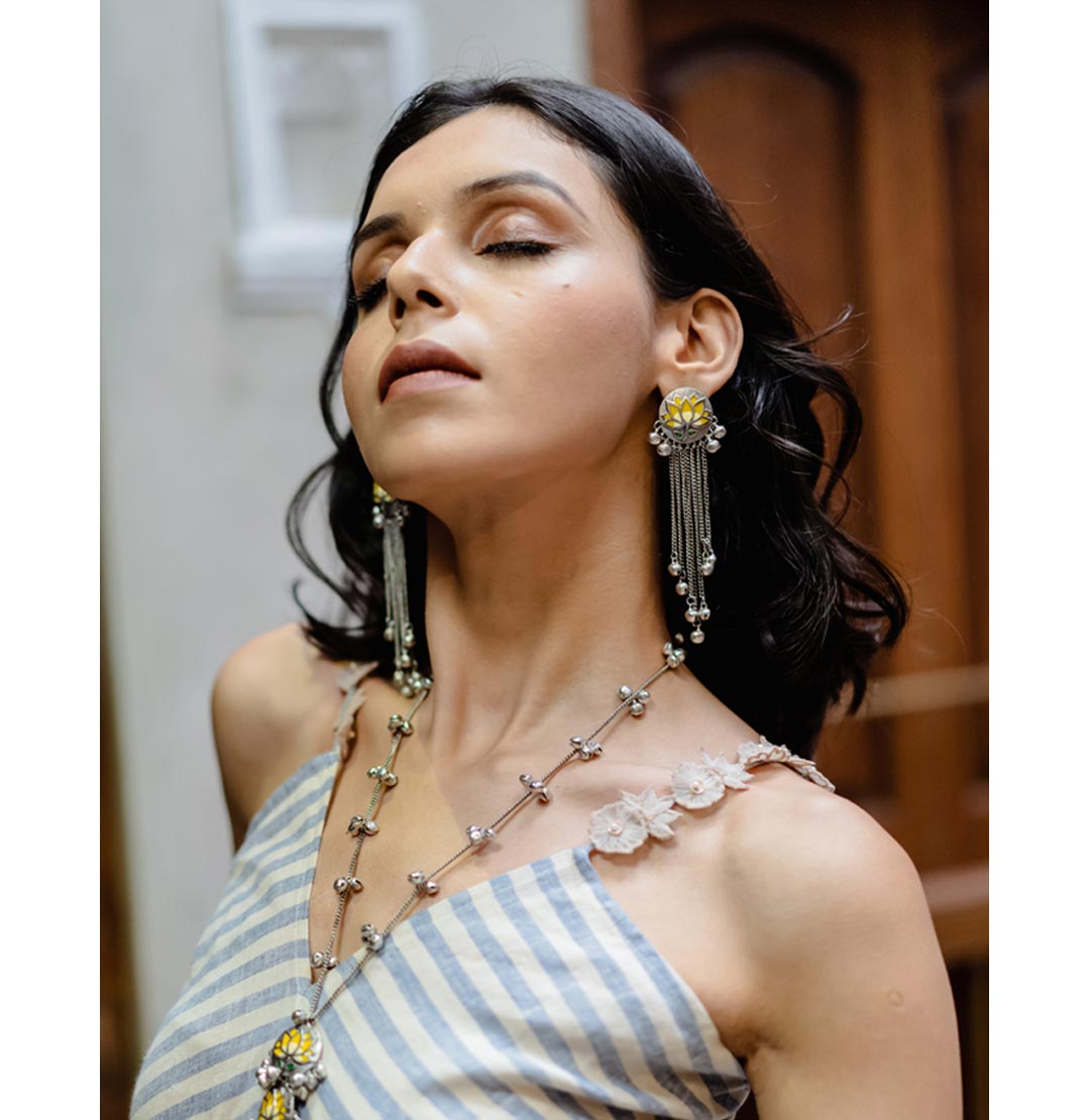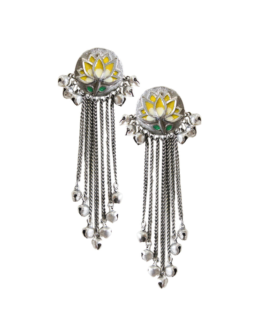 Yellow Lotus Tassels : Handcrafted silver tassel earrings inspired from “Pichwai” motifs with hand-painted enamel.