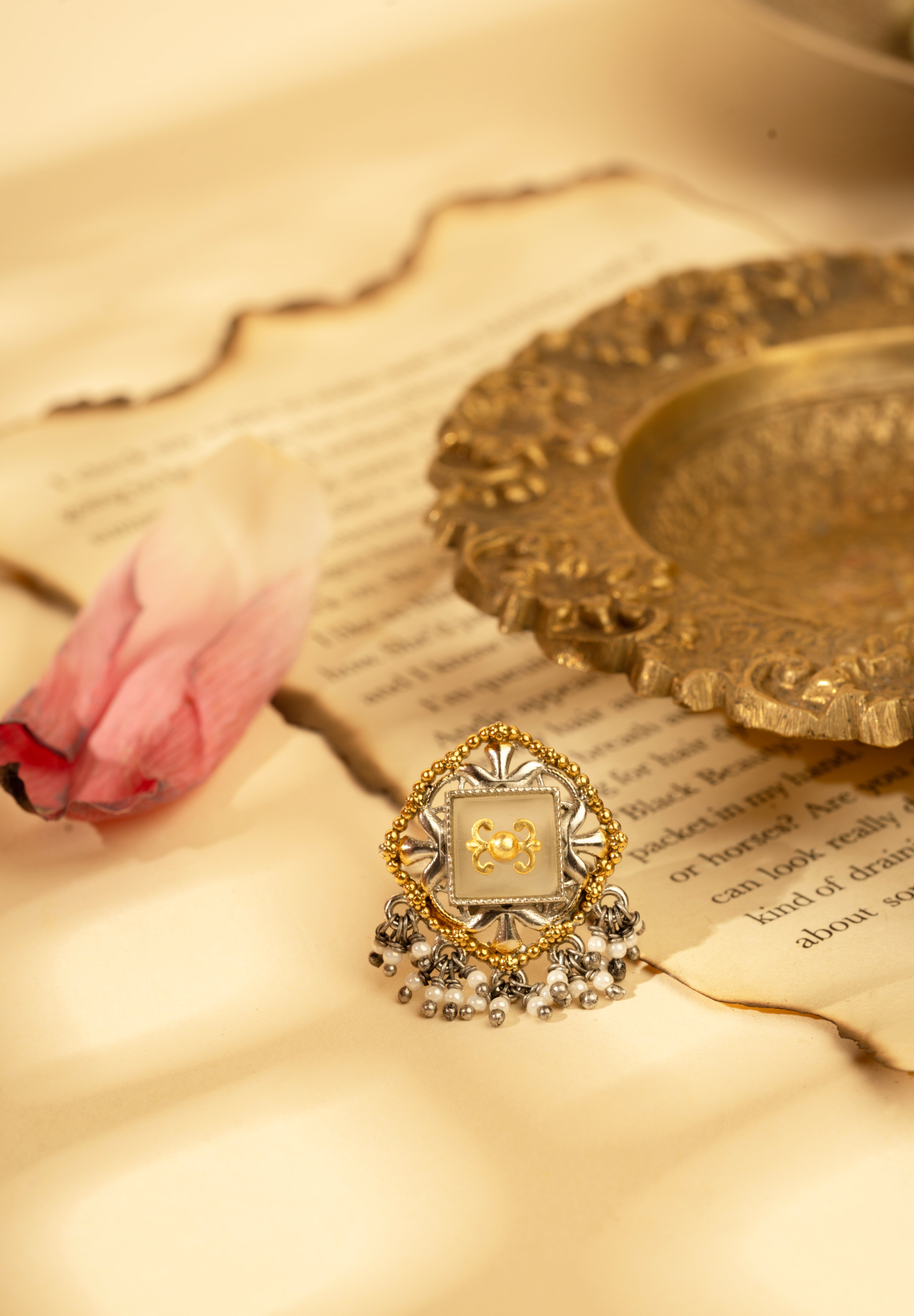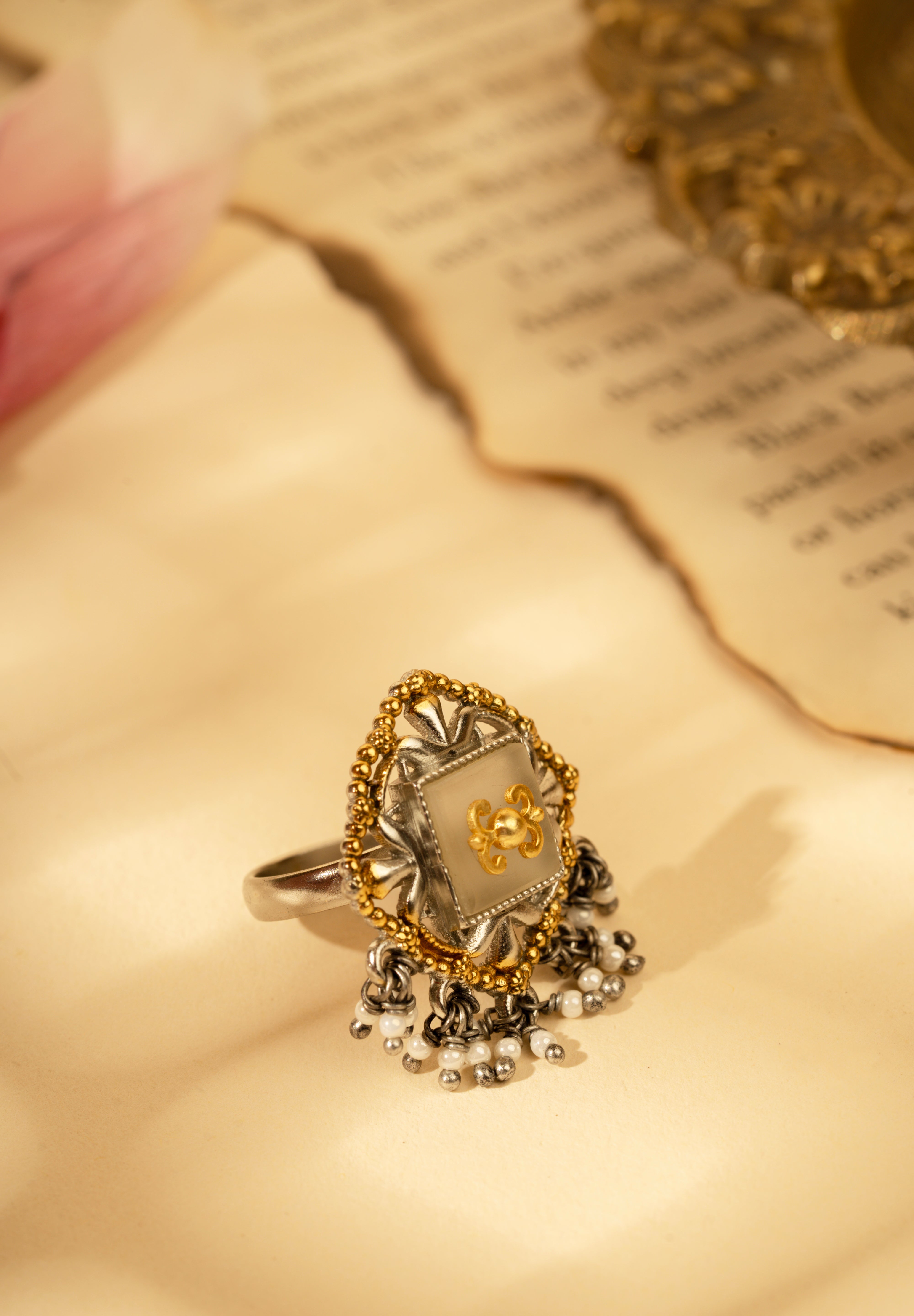 Inspired by the name Zahira, meaning radiant and brilliant, the Zahira Ring embodies luminous beauty and grace. Handcrafted with a delicate frosted crystal stone, this exquisite piece features an elegant Art Nouveau-inspired filigree motif. This ring is adorned with 18k gold and silver metal, offering a luxurious yet modern touch. With an adjustable ring size this ring can fit almost all ring sizes.
